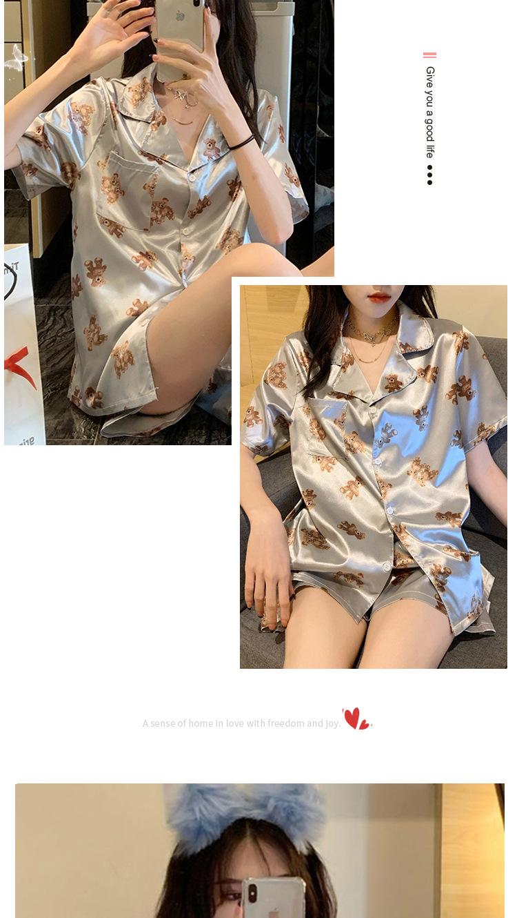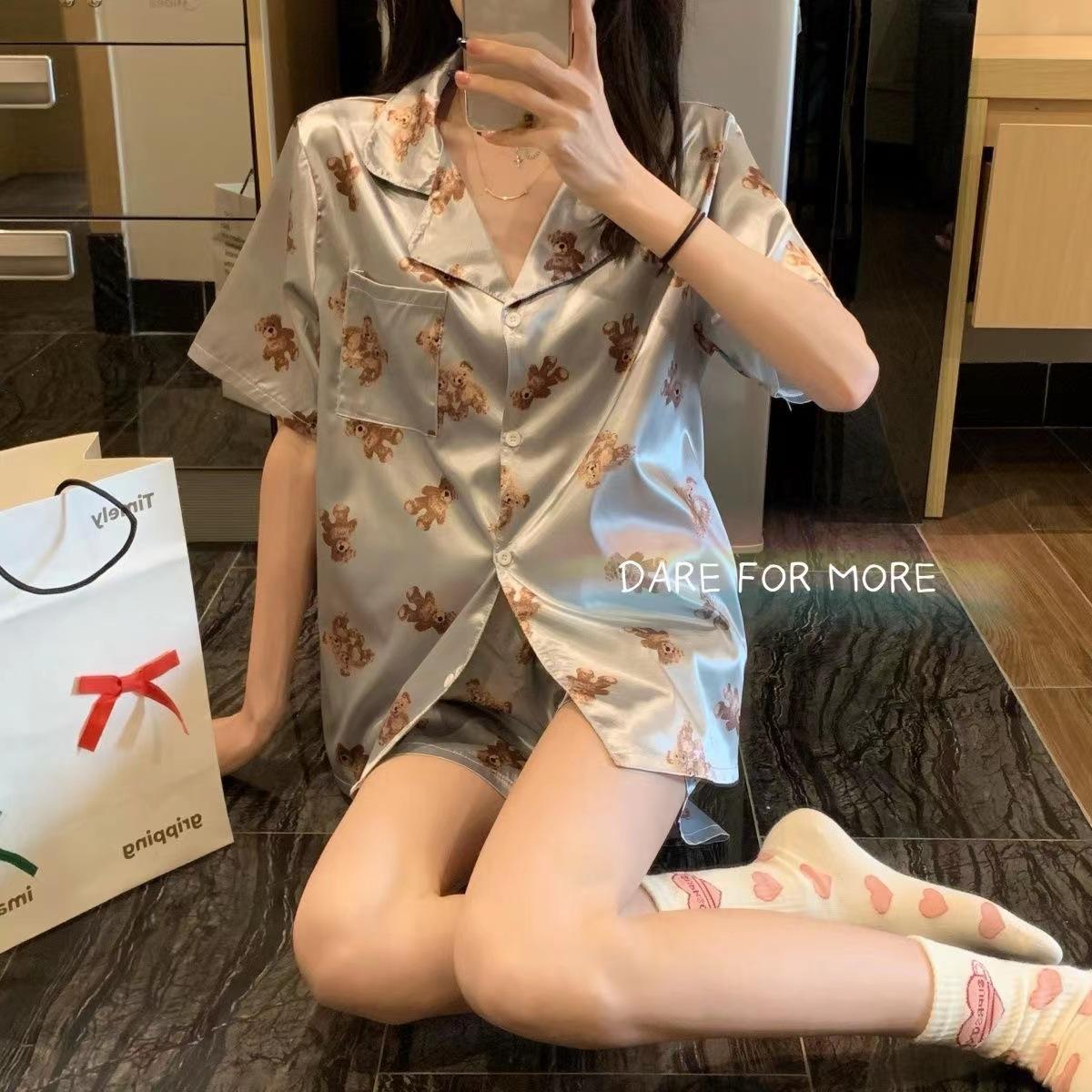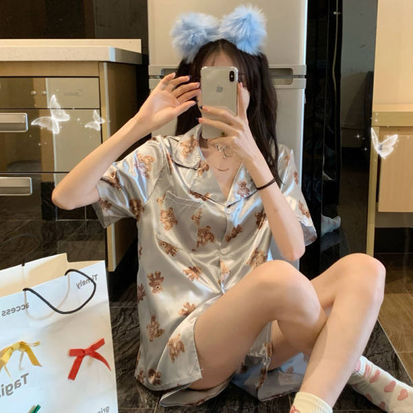 Pijama para Mujer Cárdigan de Manga Corta Shorts Oso Gris Ins Lindo Dibujos Animados Verano Damas Conjunto de Ropa para el Hogar Venta al por Mayor