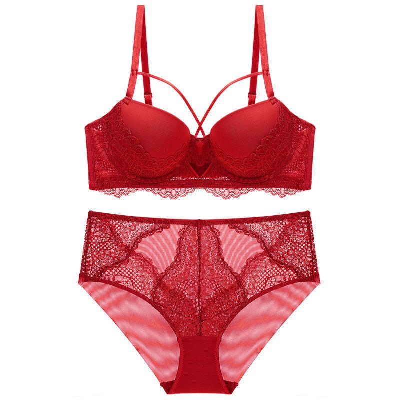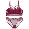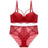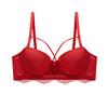 | Conjunto de sujetador de encaje rojo sexy europeo y americano nuevo de otoño e invierno, sujetador de ropa interior push-up fruncido con bordado hueco |