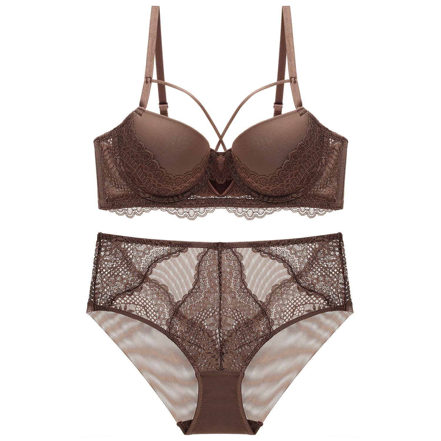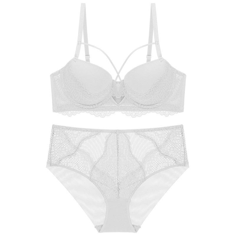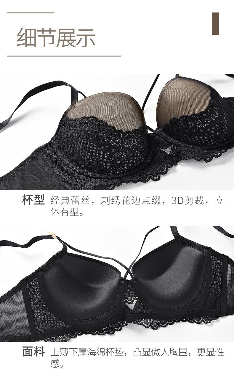 | Ropa interior de encaje con bordado hueco sexy nueva europea y americana, conjunto de sujetador fruncido con parte superior fina y parte inferior gruesa para mujer, pecho pequeño |