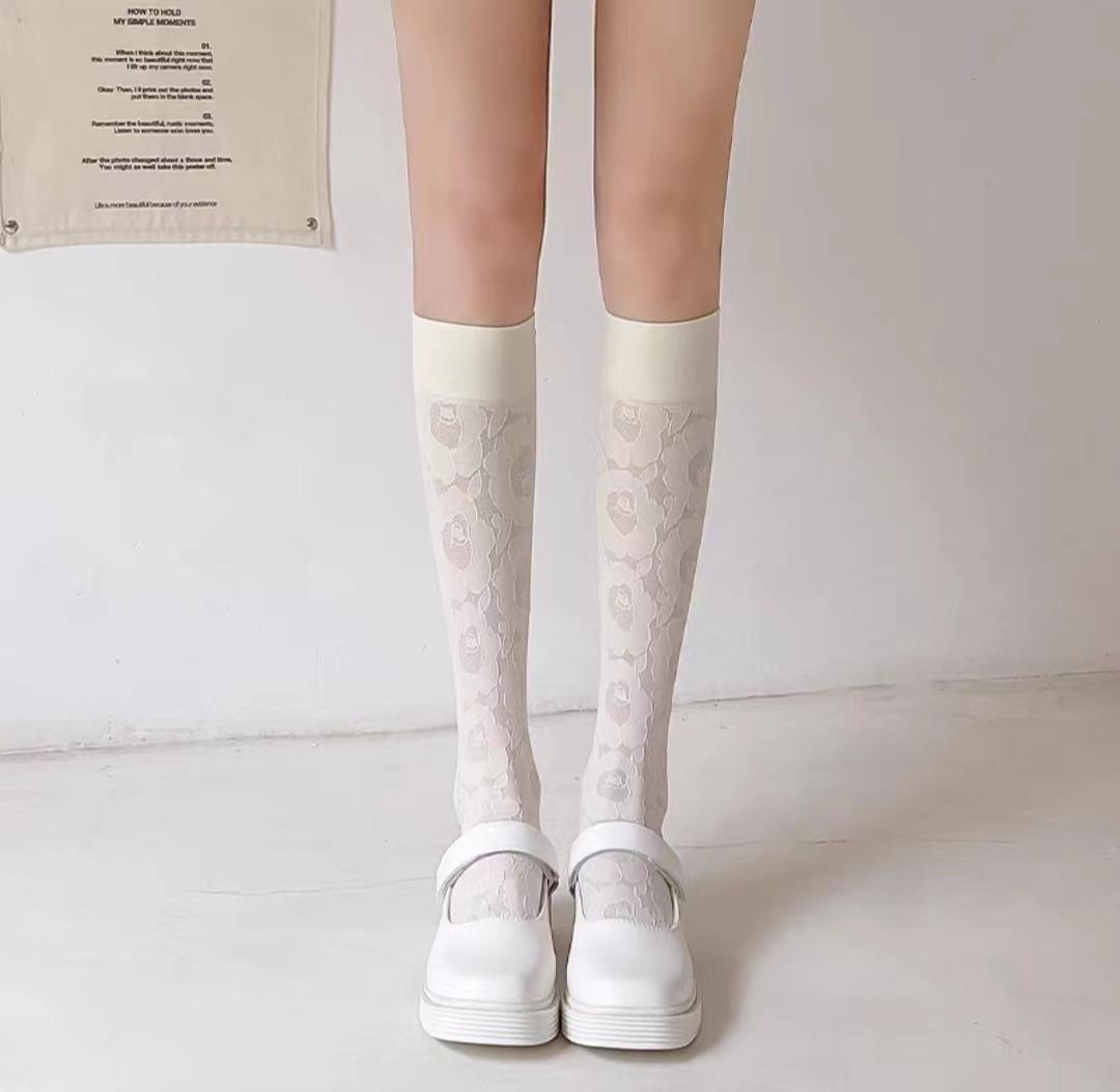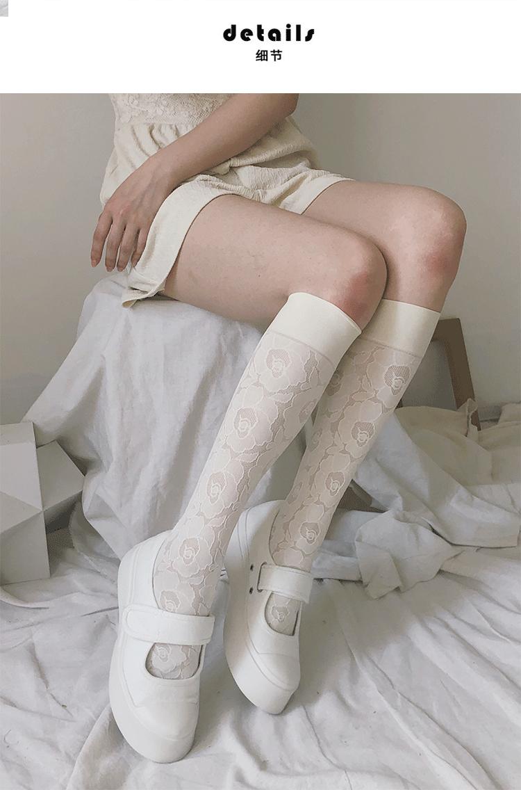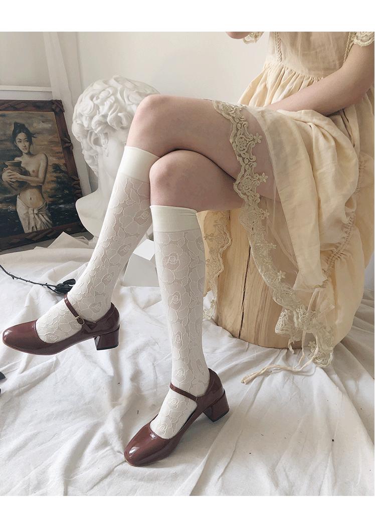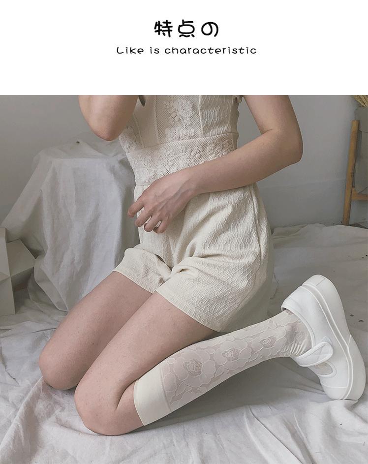 Lace flower calf socks Gray, Lace flower calf socks milk White, Lace flower calf socks Black