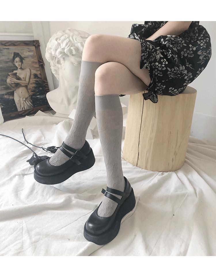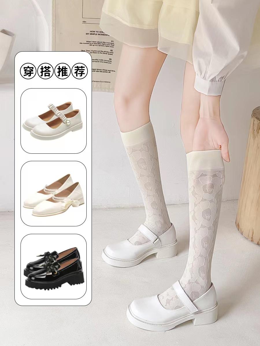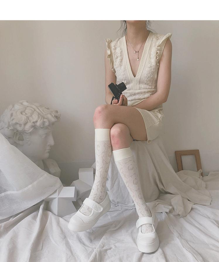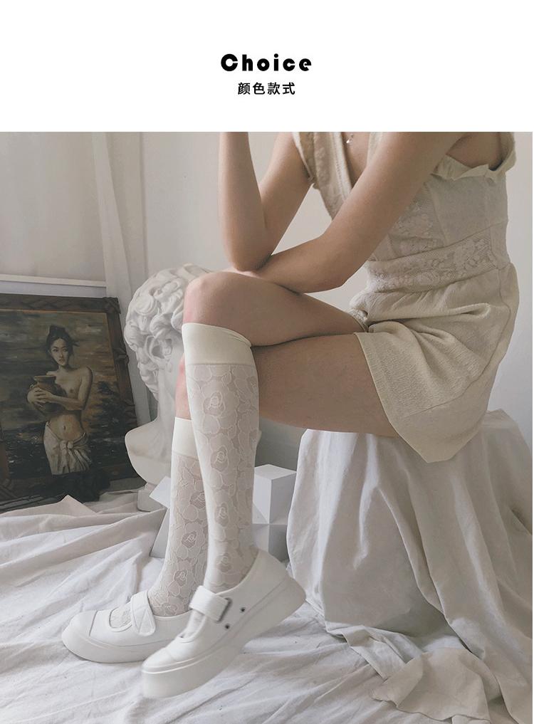 Lace flower calf socks Gray, Lace flower calf socks milk White, Lace flower calf socks Black