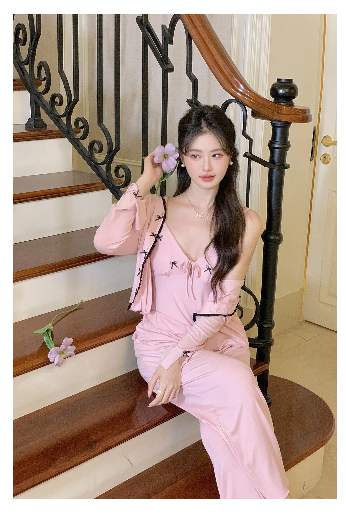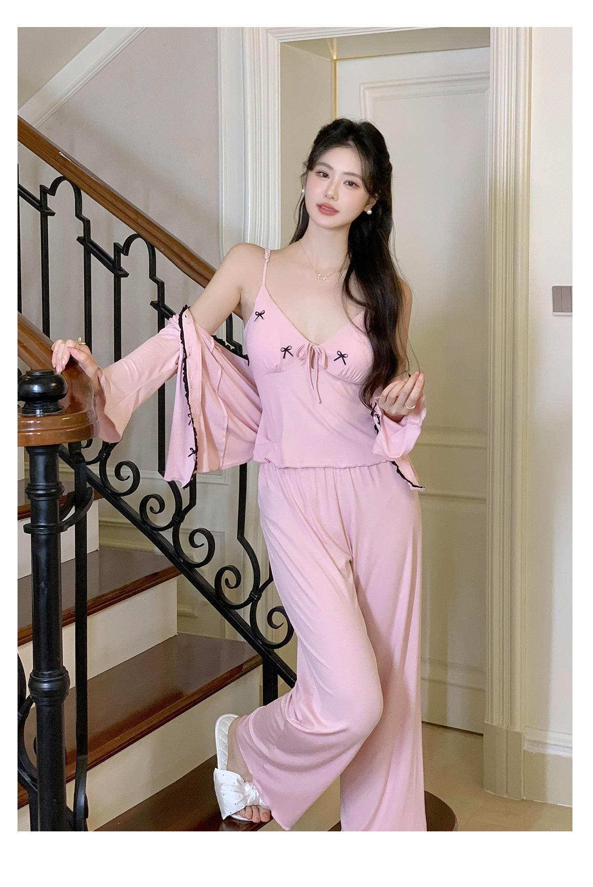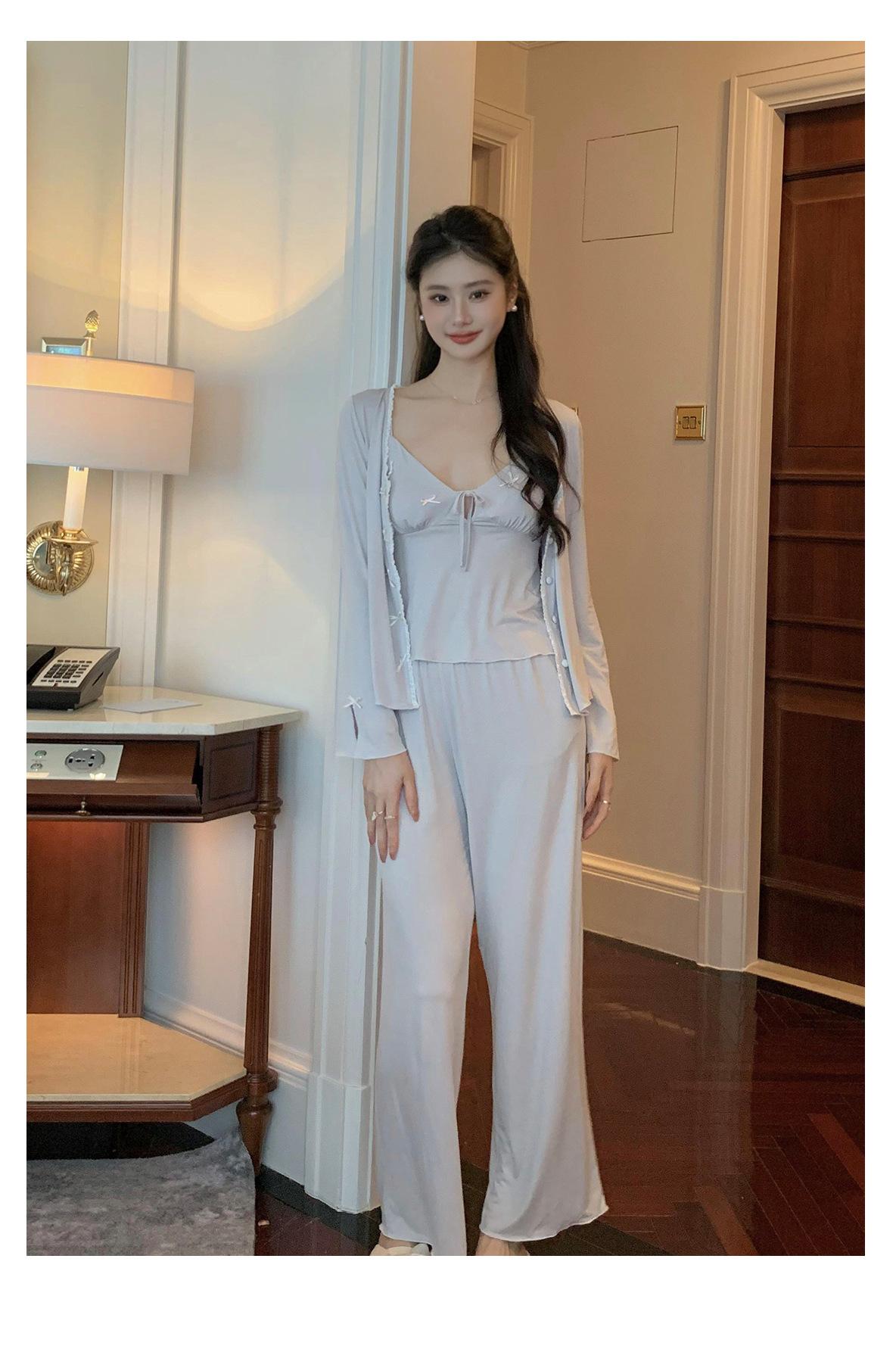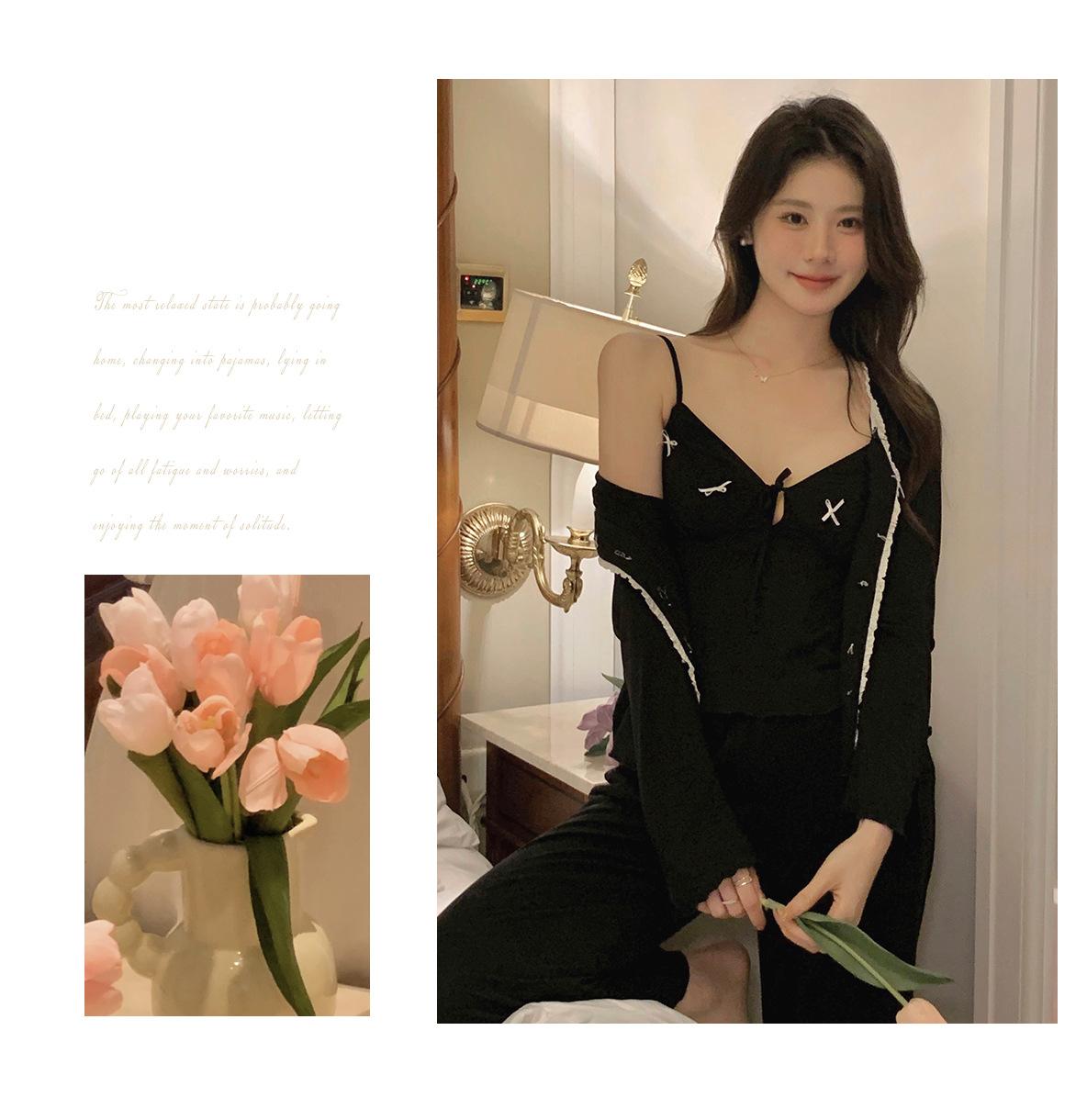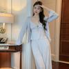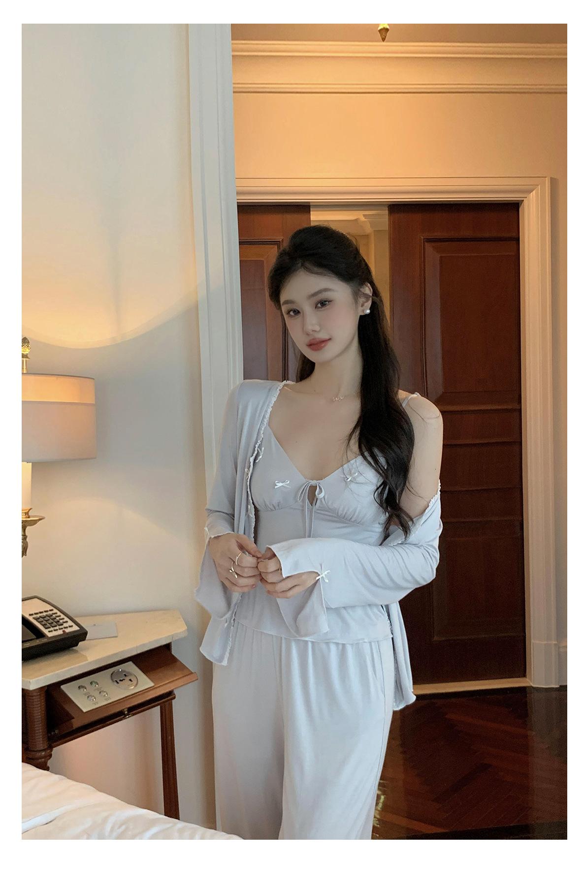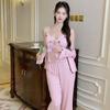 Pijamas de estilo francés para mujer, primavera y otoño, algodón, sexy, viento puro, cinturón, almohadilla para el pecho, traje de tres piezas para el hogar, para usar en el exterior