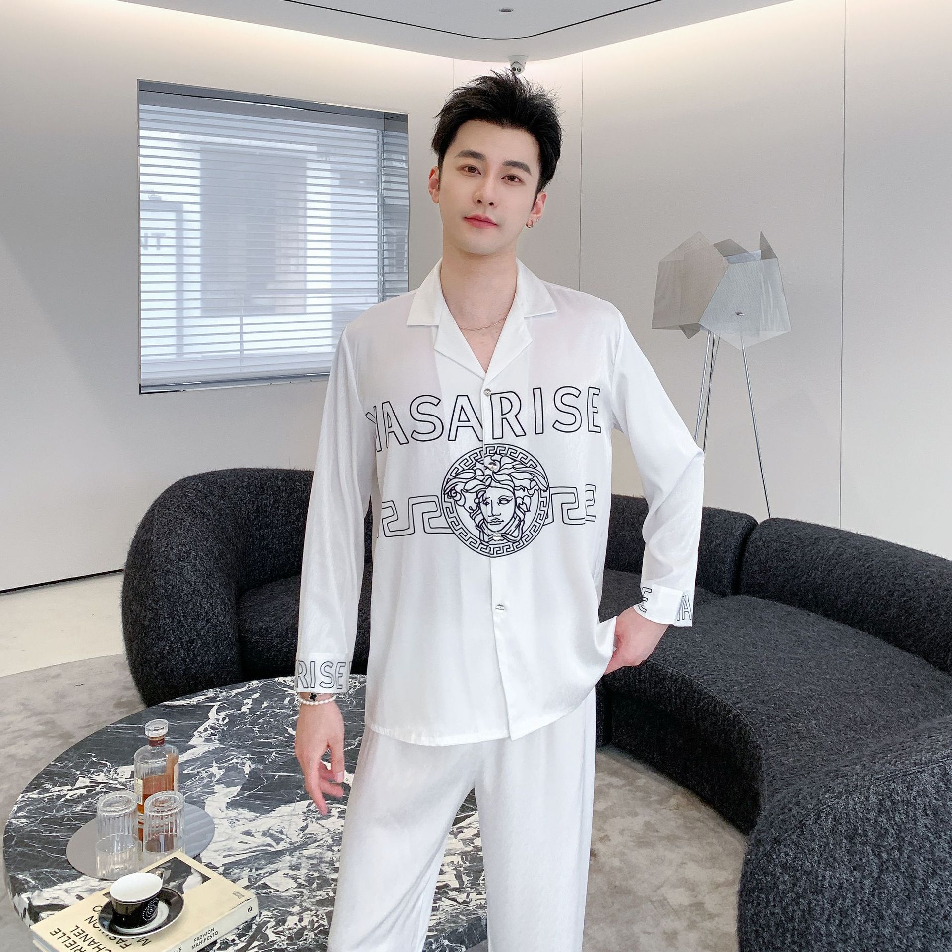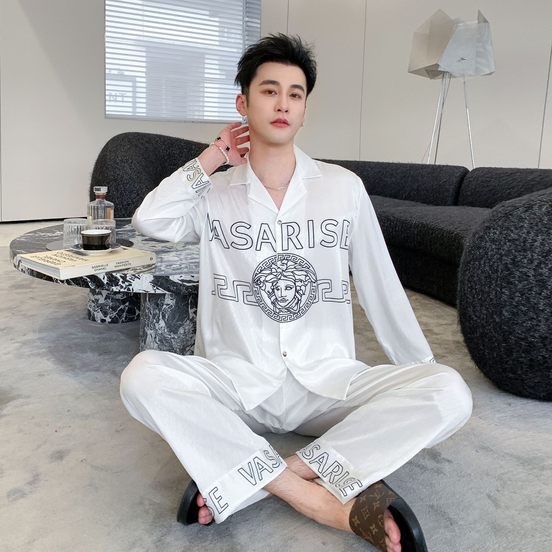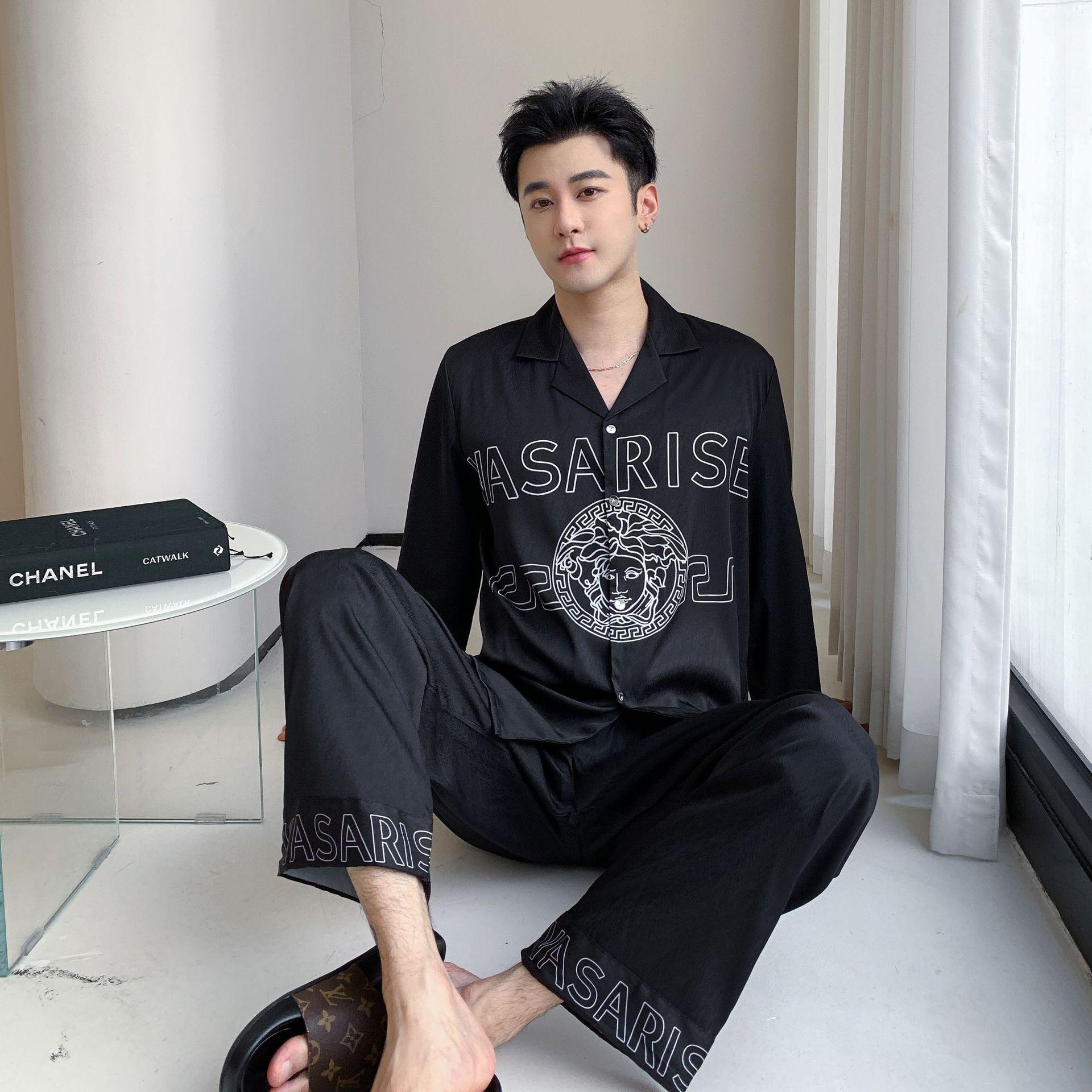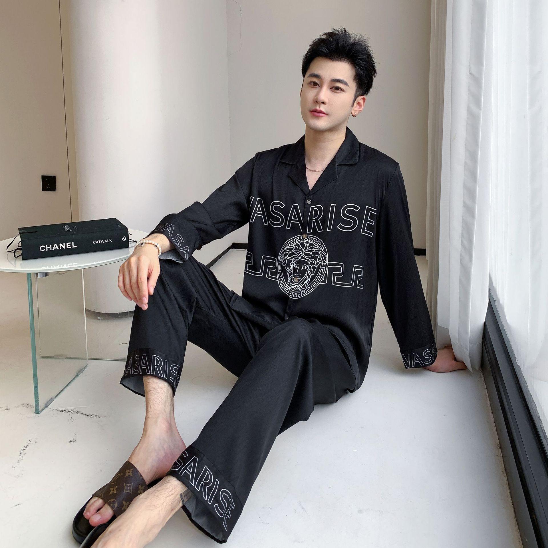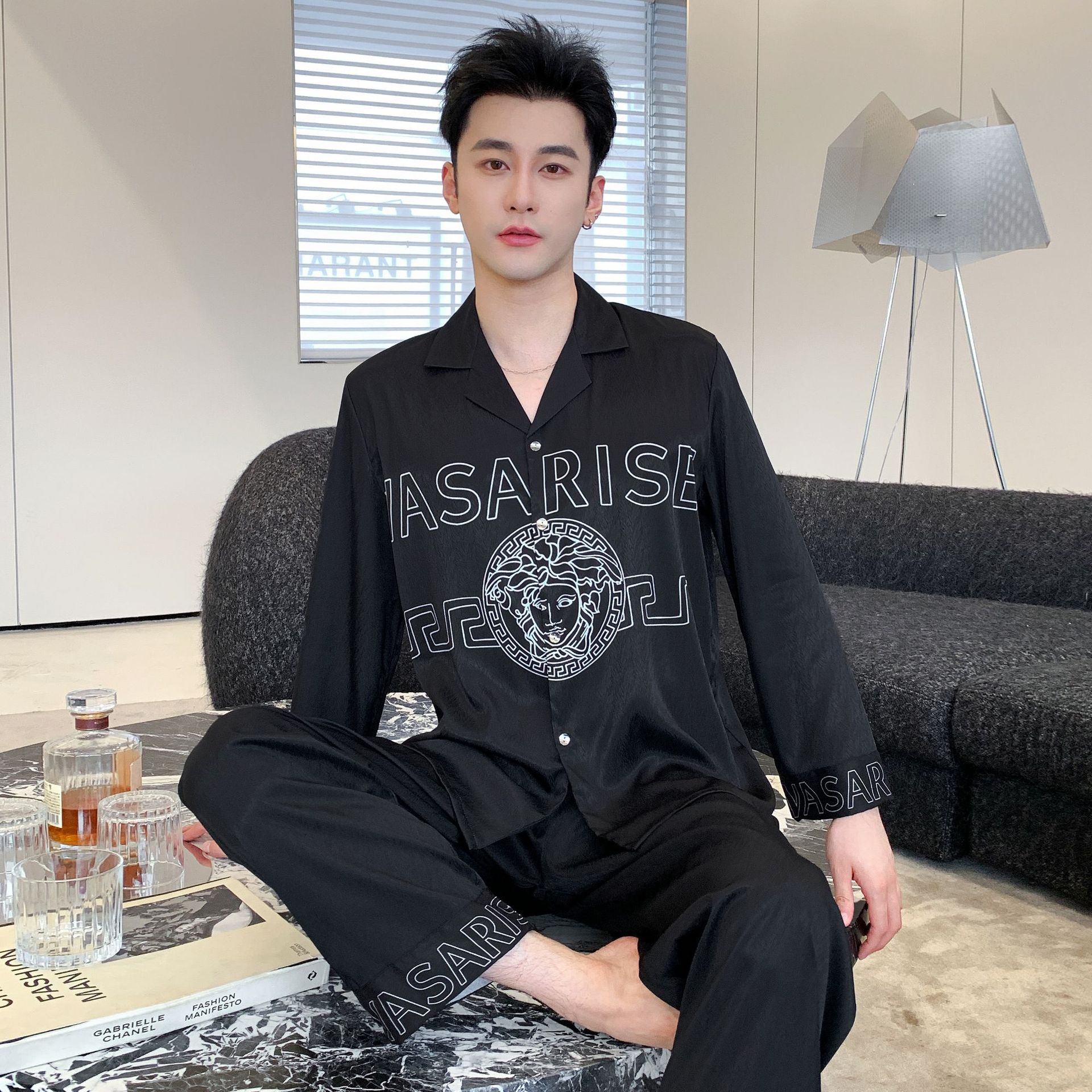 Pijama para hombre nuevo traje de manga larga de seda de hielo para hombre estilo rojo en línea de alta calidad ropa de casa famosa europea y americana holgada para hombre