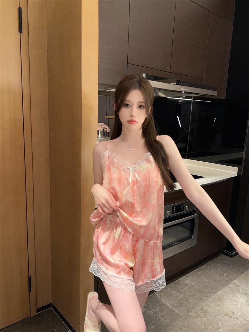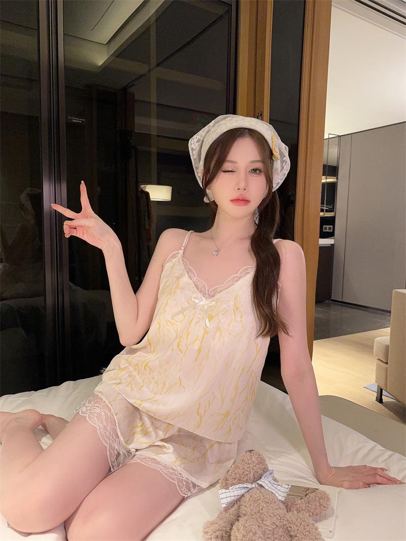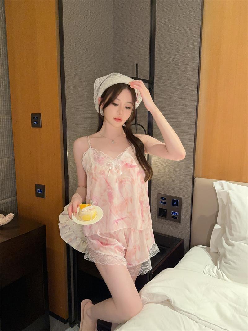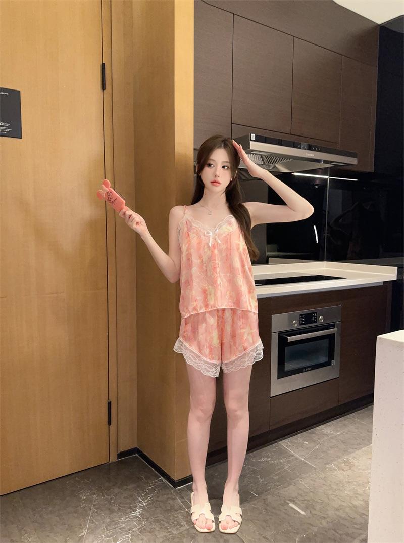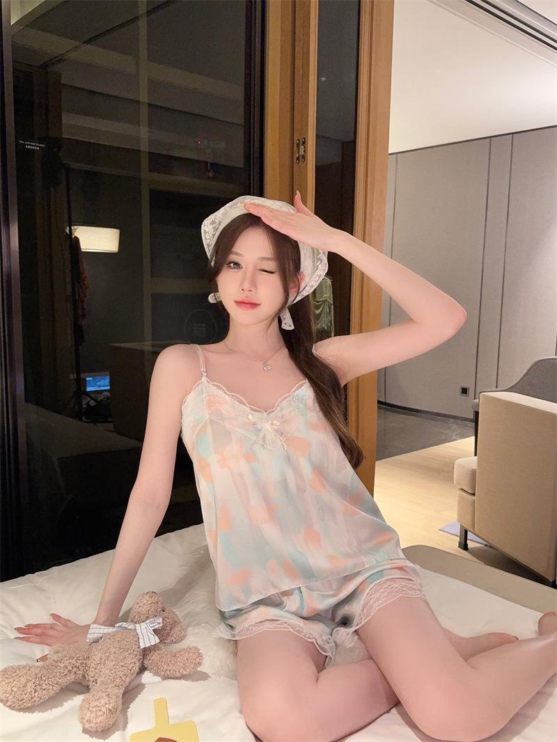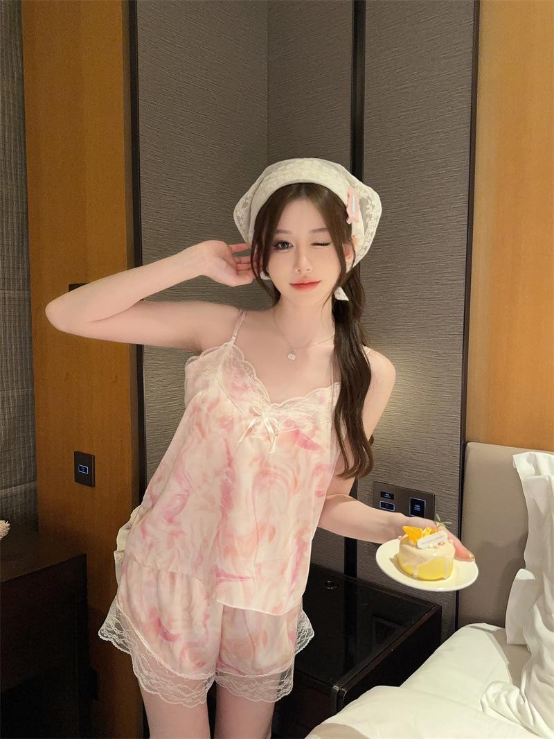 Conjunto de dos piezas con estampado de pantalones cortos y tirantes de encaje sexy y bonito con almohadilla para el pecho con cinta de hielo de verano para mujer, primavera y otoño