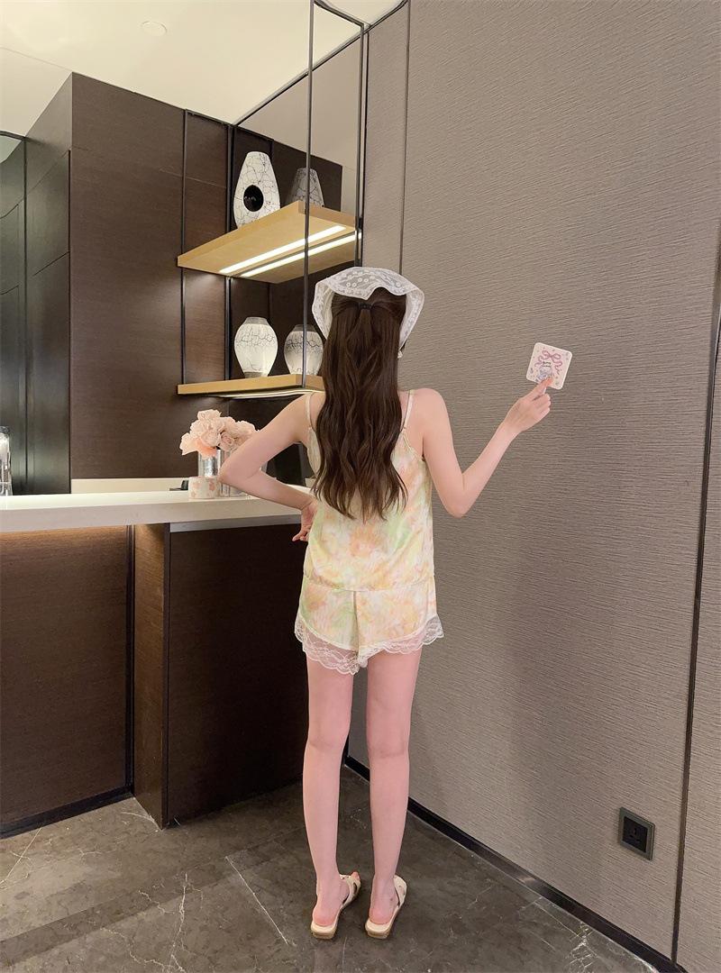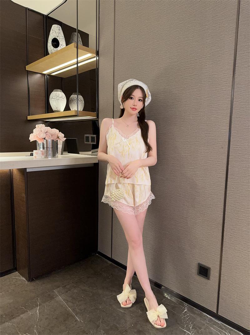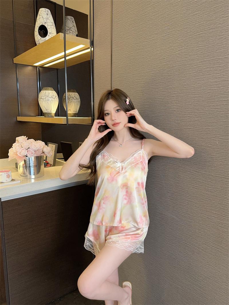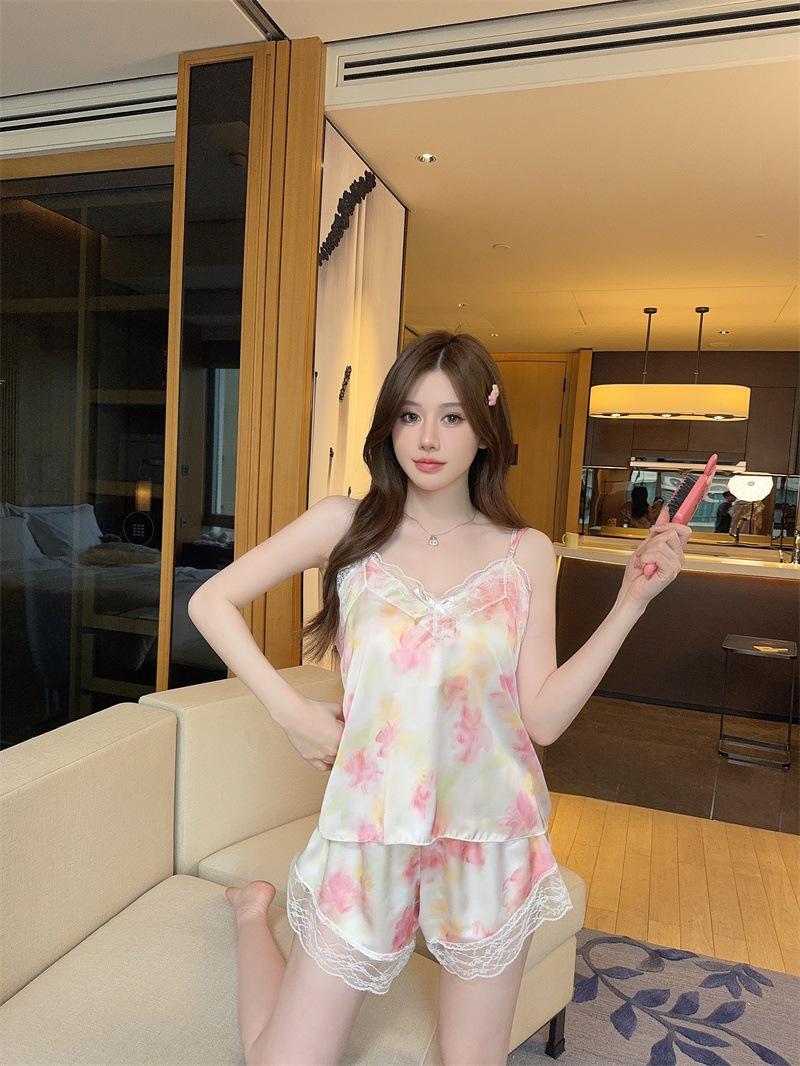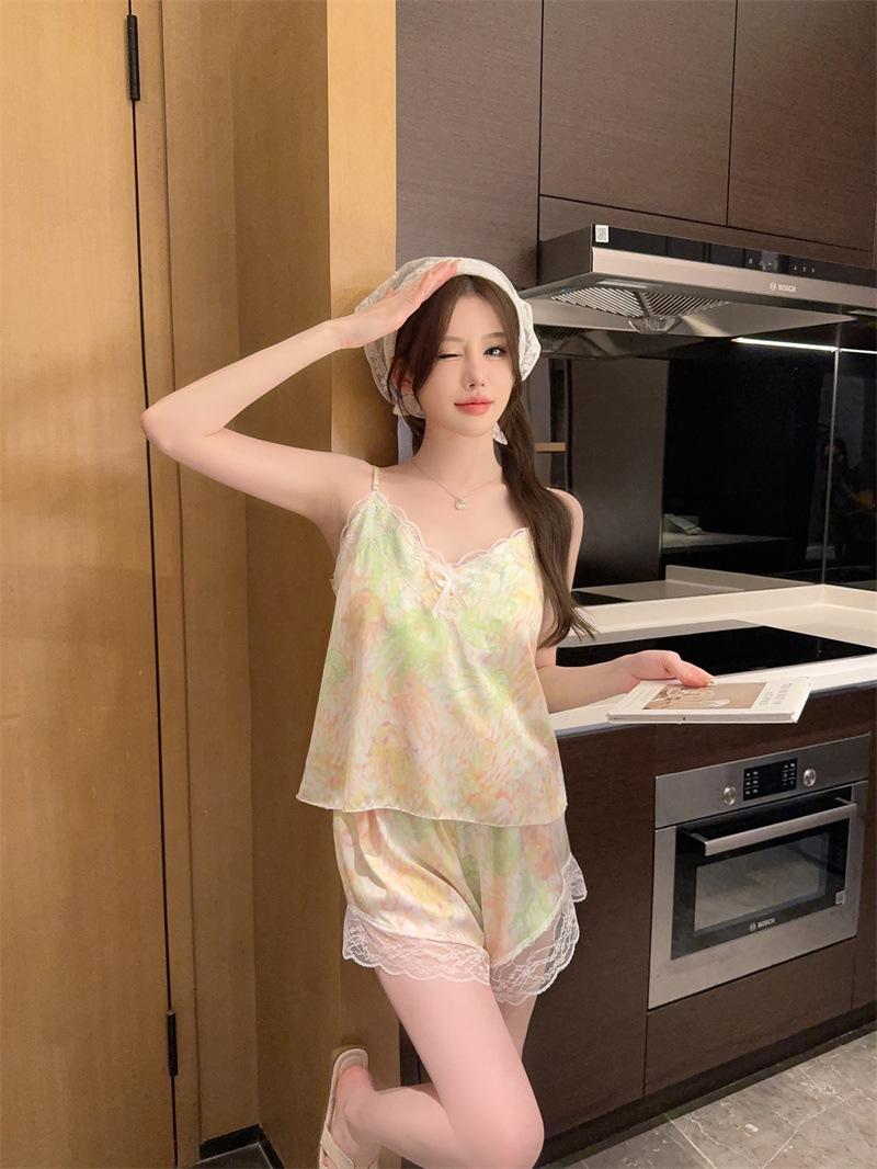 Conjunto de dos piezas con estampado de pantalones cortos y tirantes de encaje sexy y bonito con almohadilla para el pecho con cinta de hielo de verano para mujer, primavera y otoño