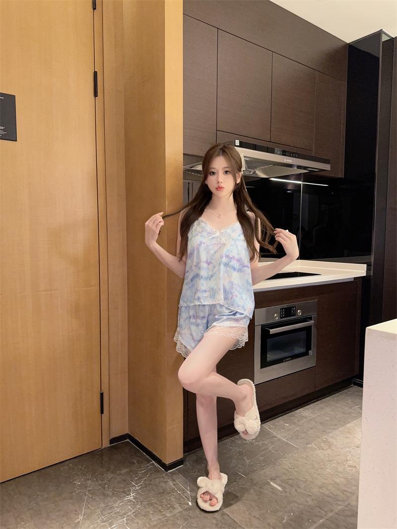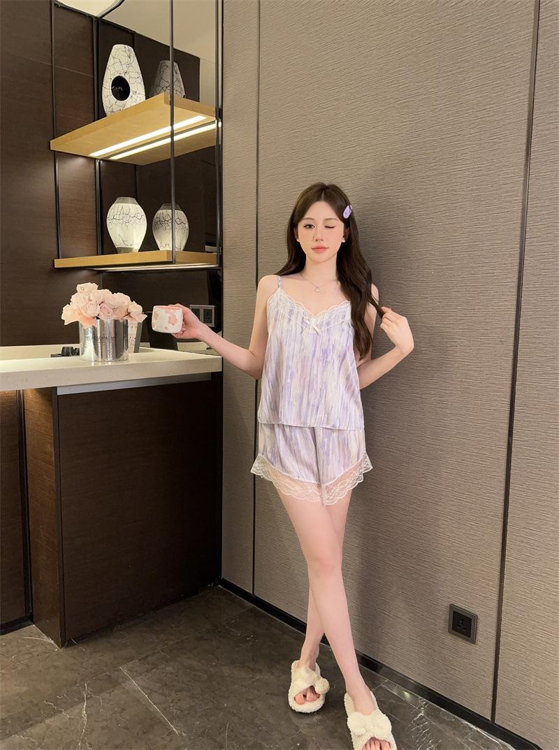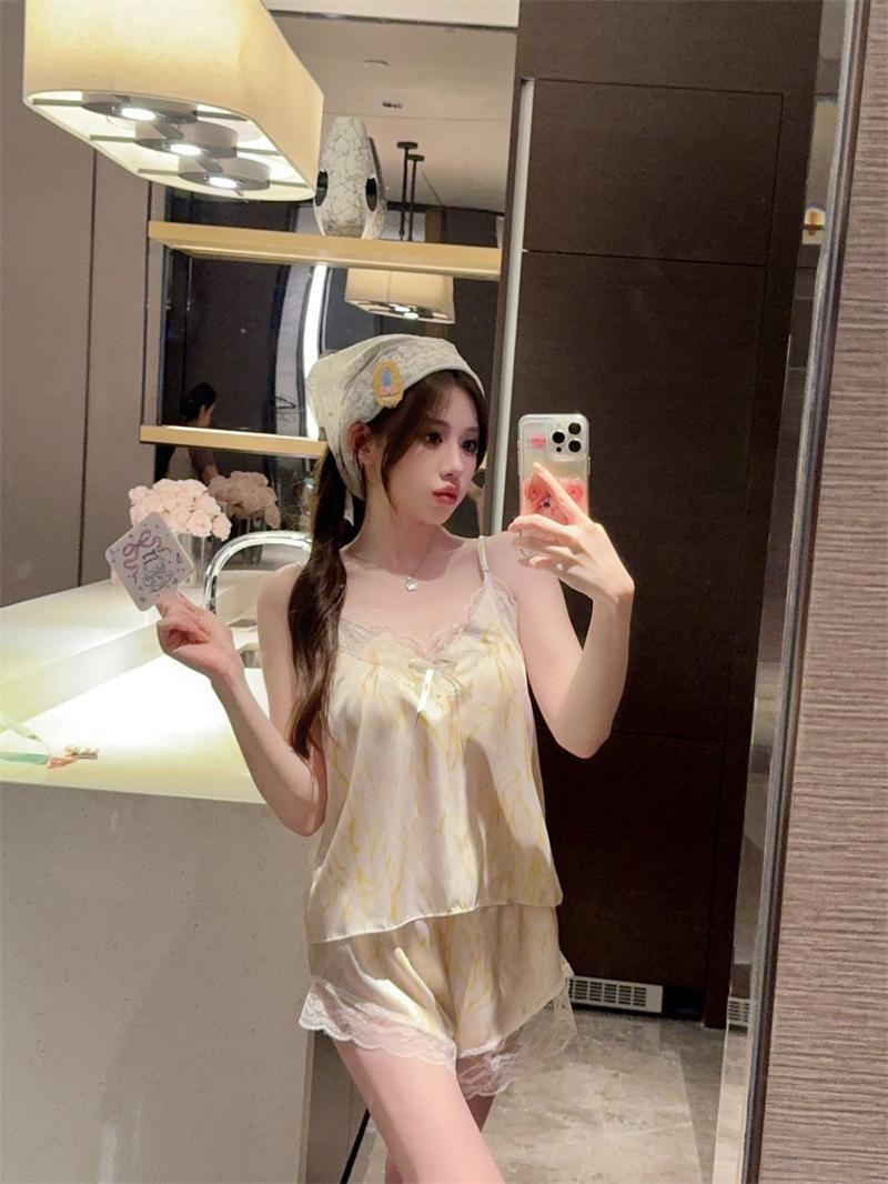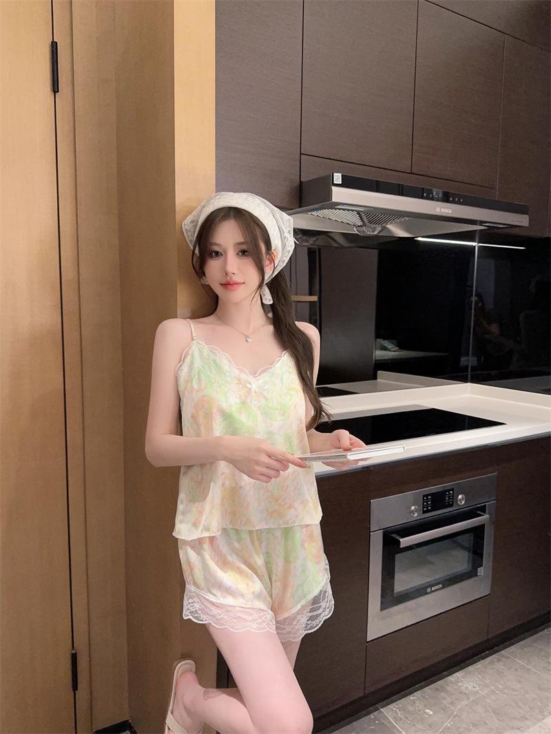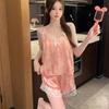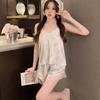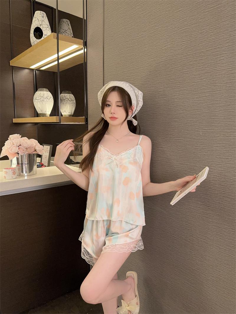 Conjunto de dos piezas con estampado de pantalones cortos y tirantes de encaje sexy y bonito con almohadilla para el pecho con cinta de hielo de verano para mujer, primavera y otoño