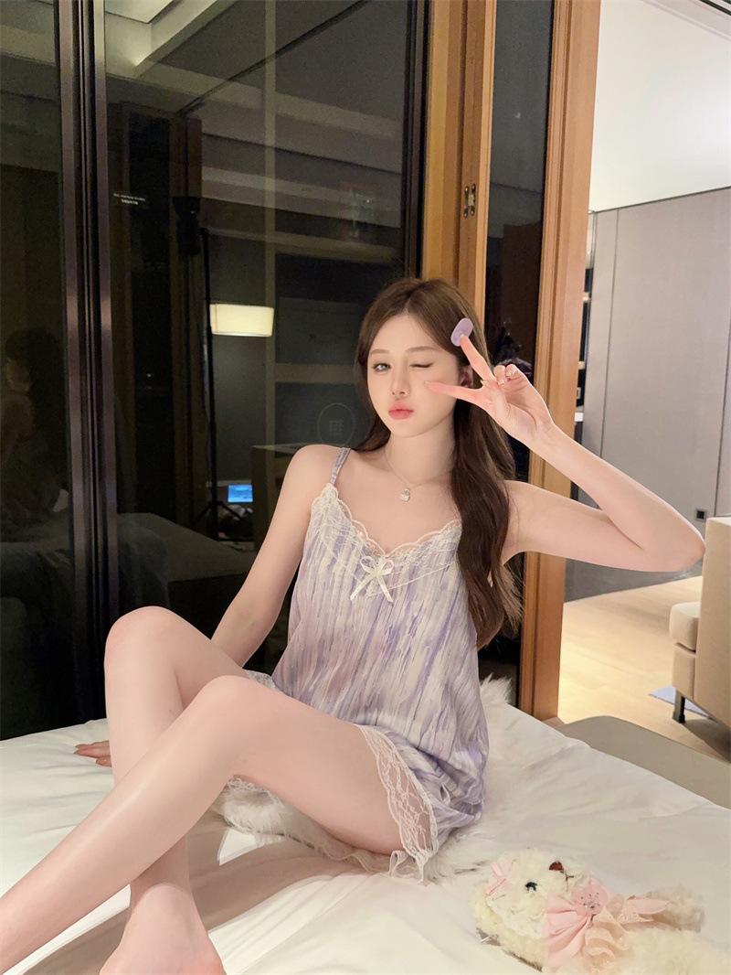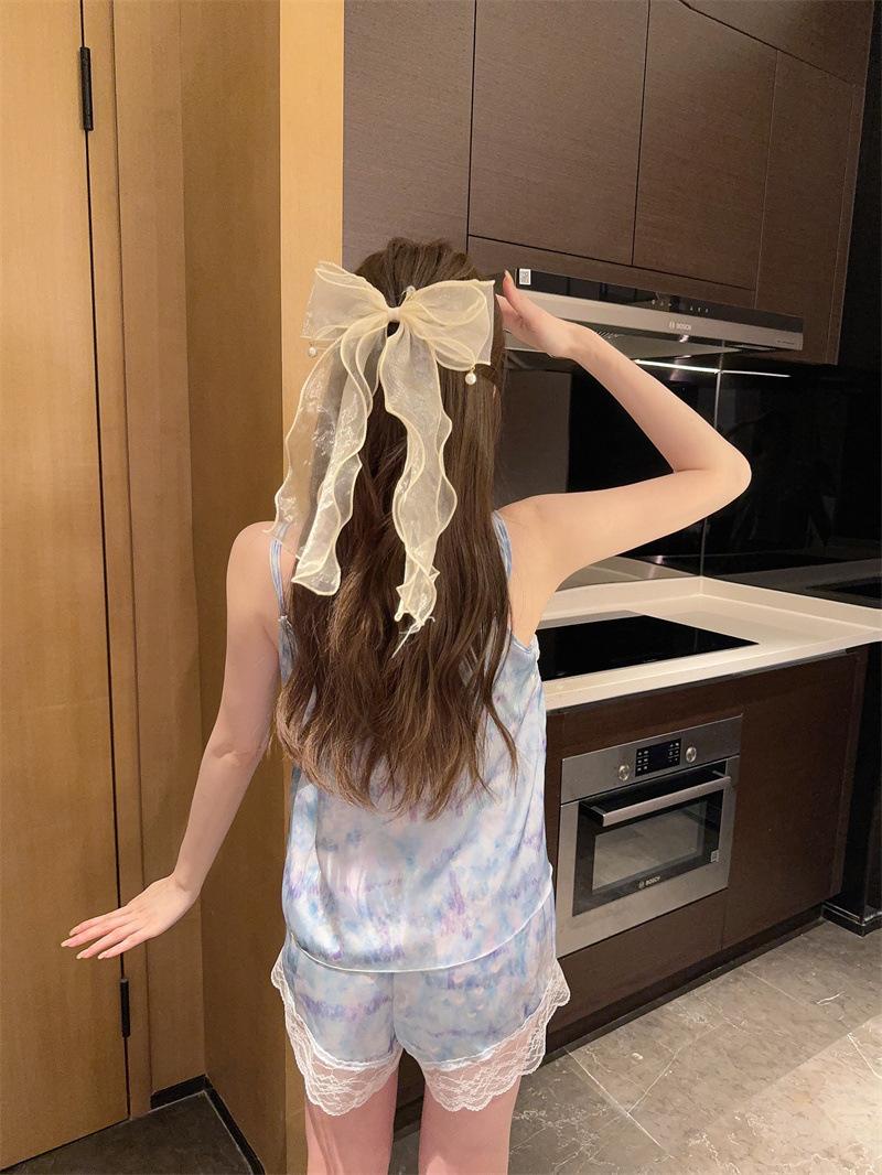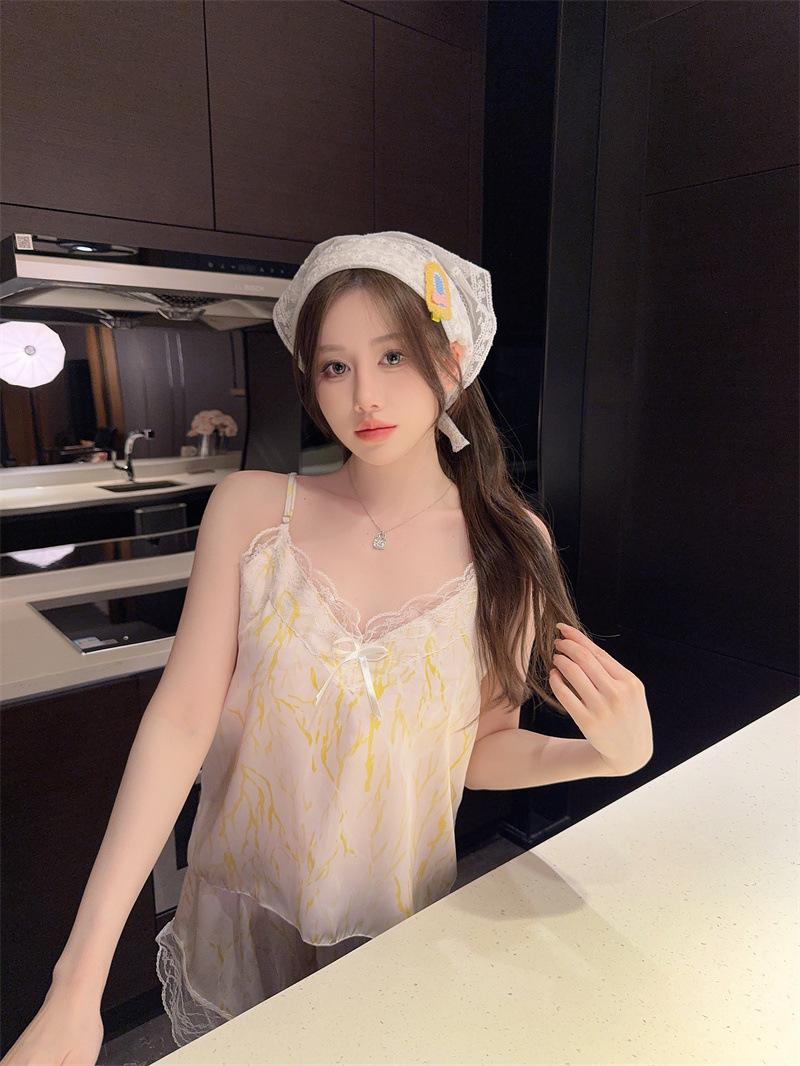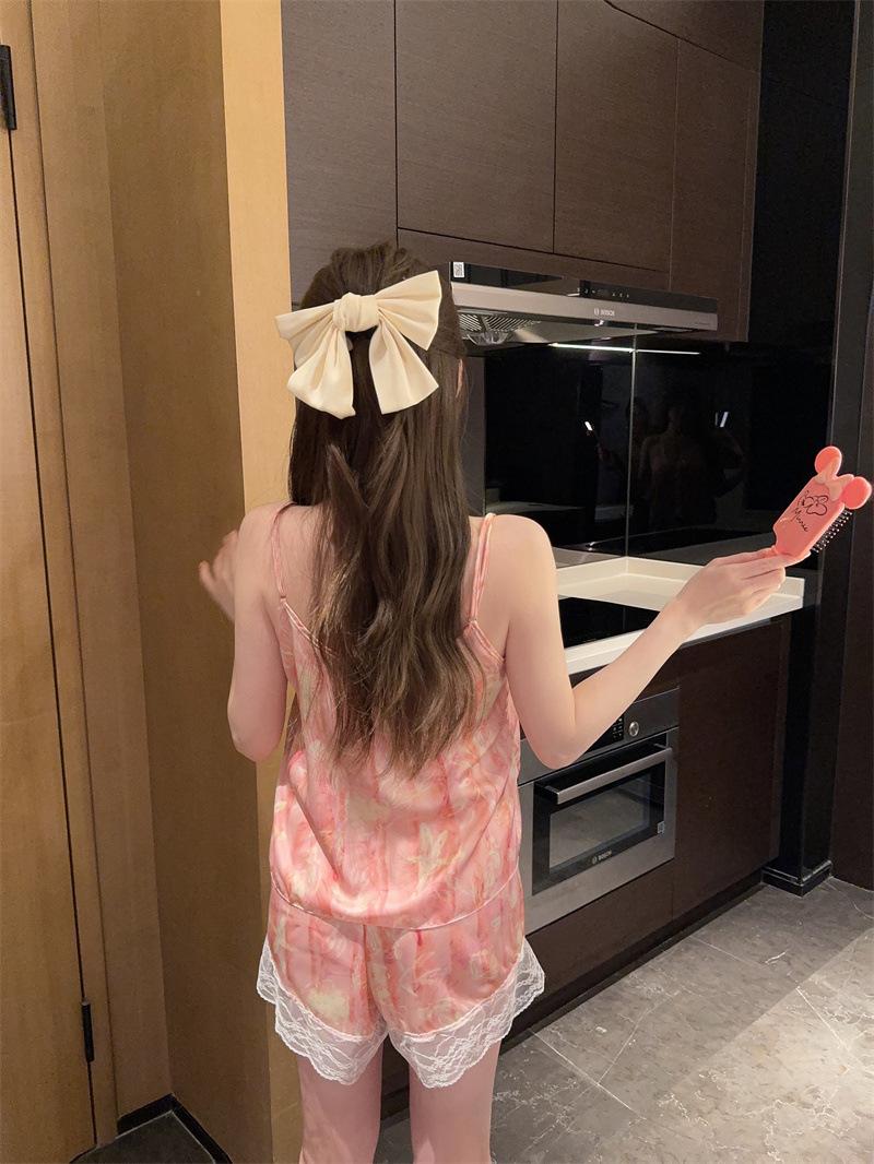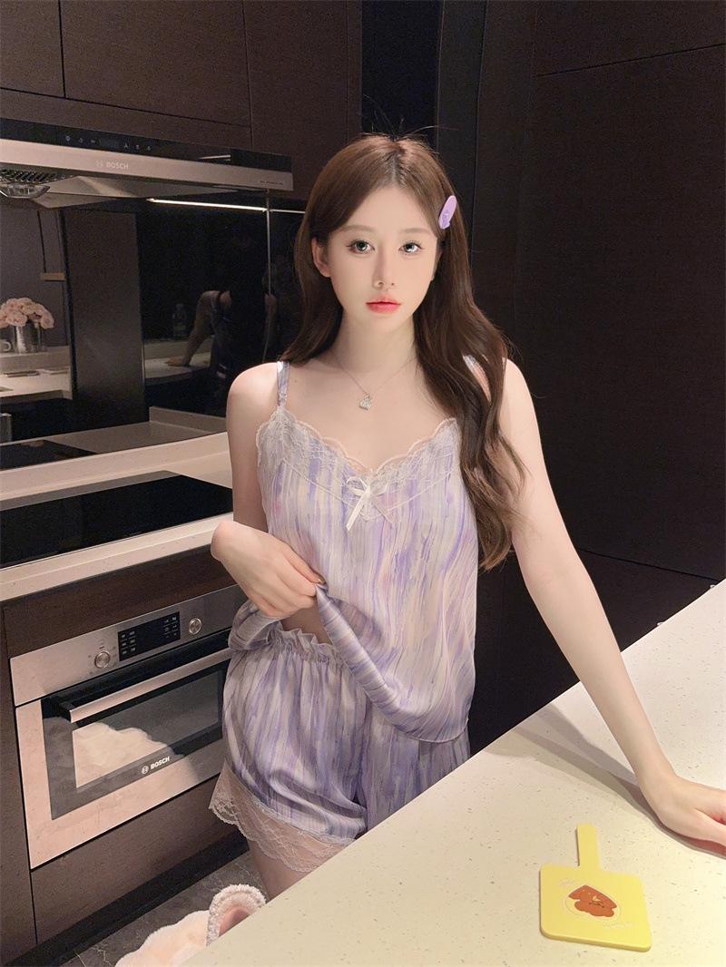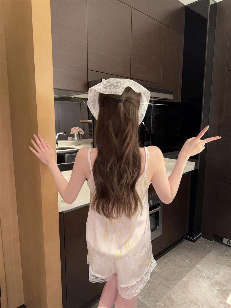 Conjunto de dos piezas con estampado de pantalones cortos y tirantes de encaje sexy y bonito con almohadilla para el pecho con cinta de hielo de verano para mujer, primavera y otoño