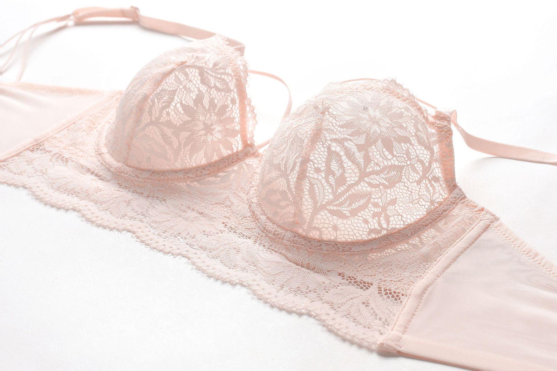 Ropa interior de encaje de pestañas francesas, sexy, de algodón fino, con pecho grande, talla pequeña, sujetador anticaída para los senos laterales.
