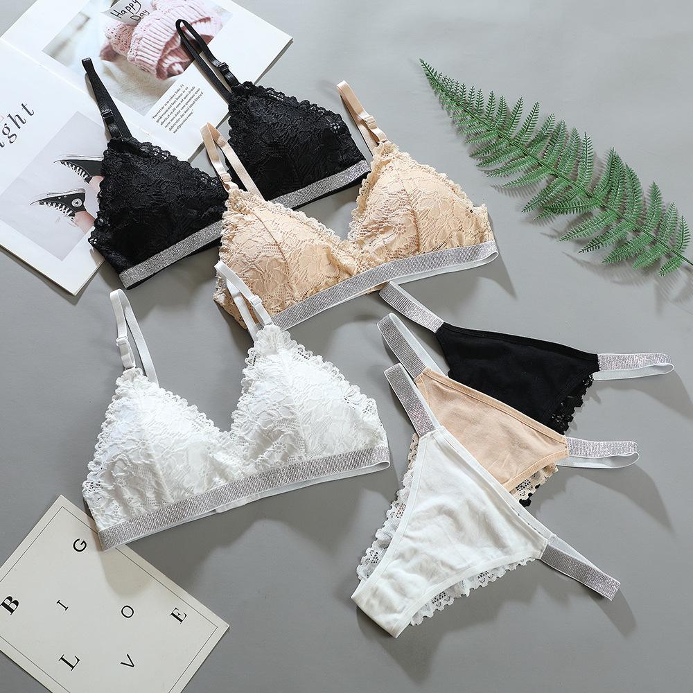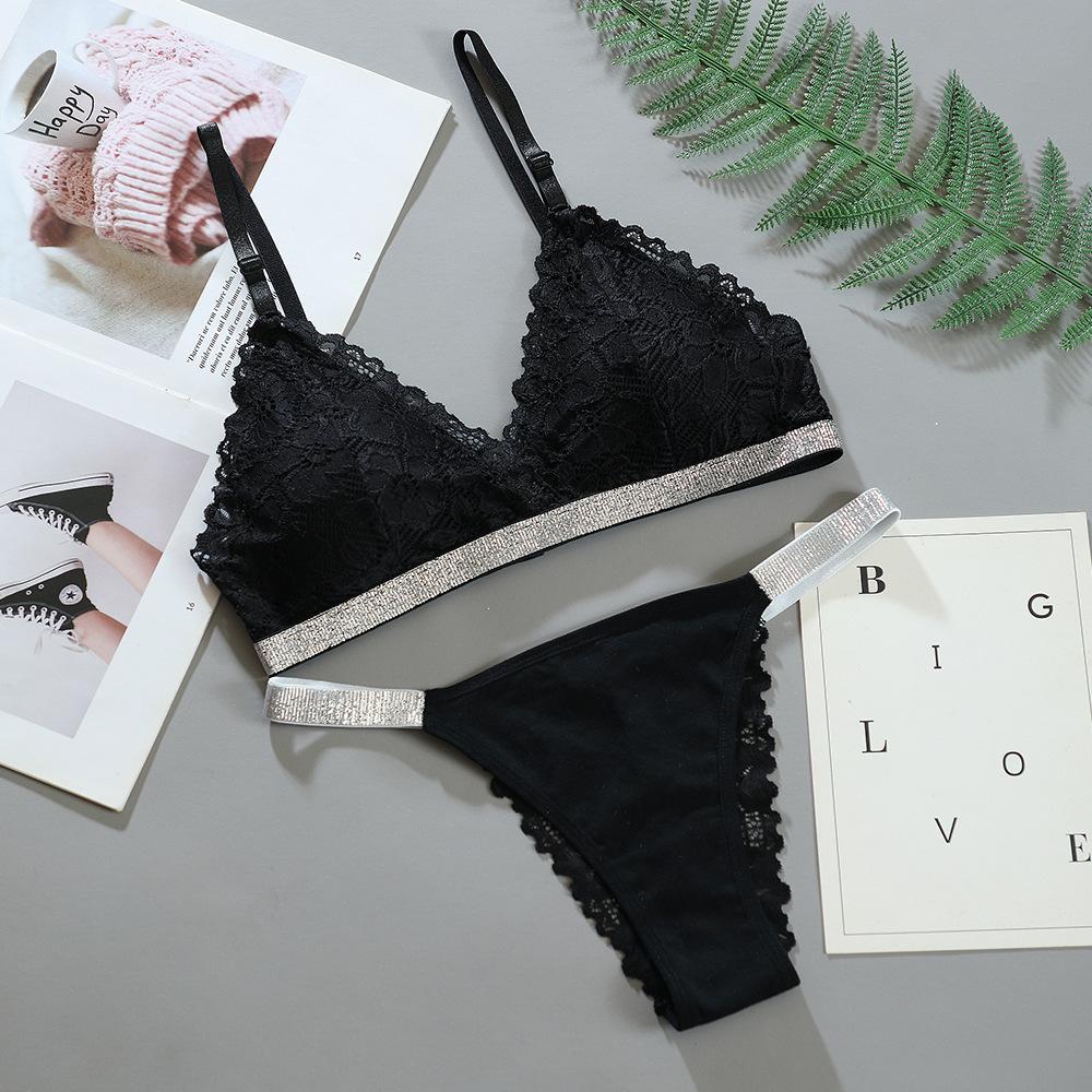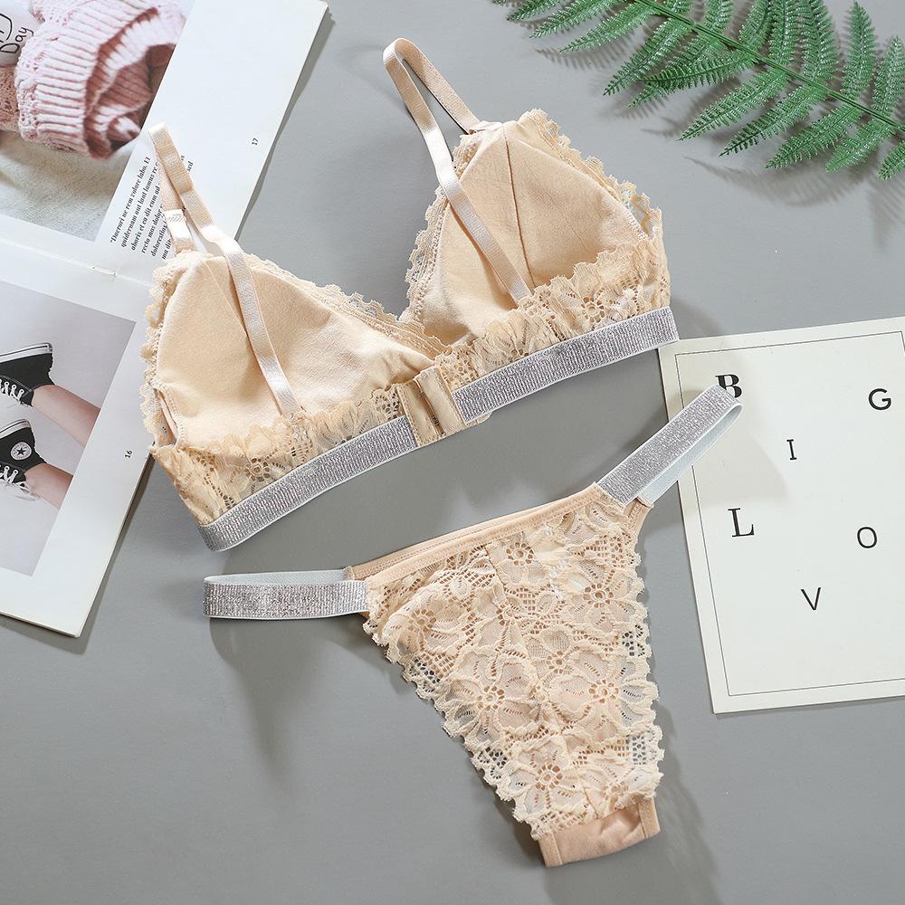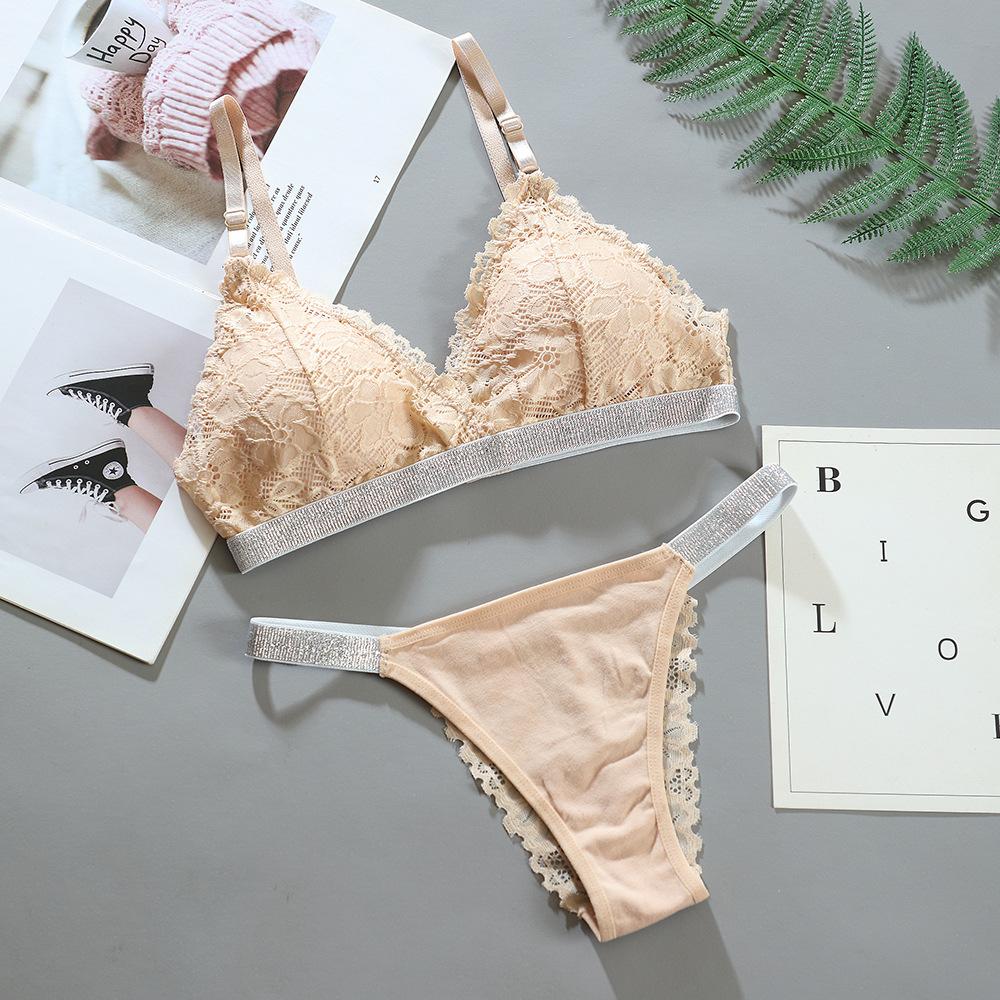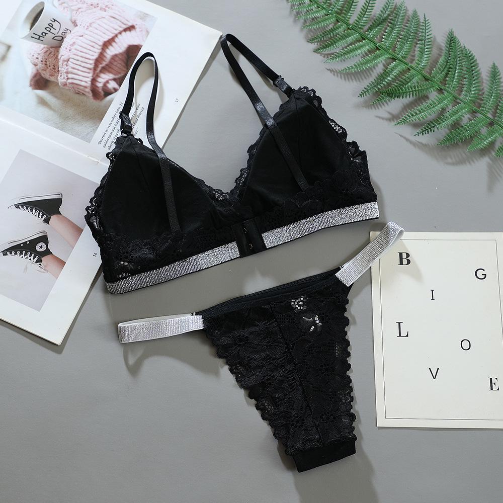 Ropa Interior Estilo Francés Cinta Plateada Sexy Encaje Conjunto de Brasier para Mujer Niñas Copa Triangular Ligera 7363