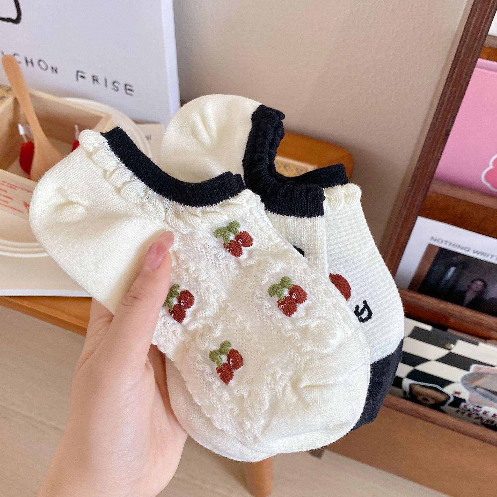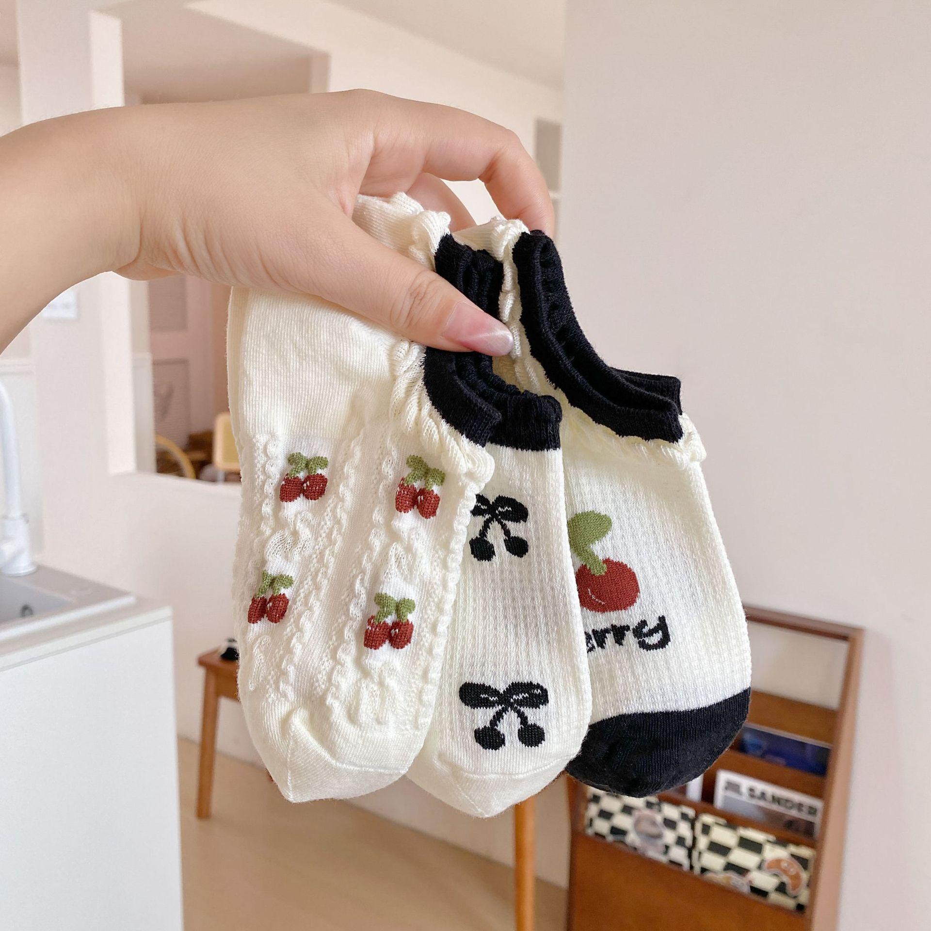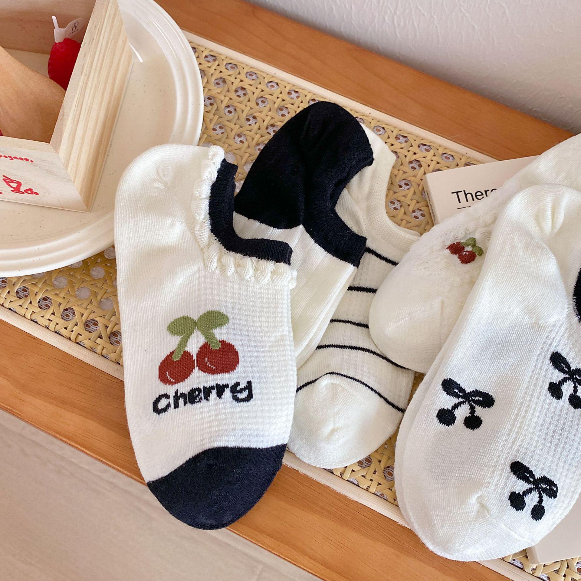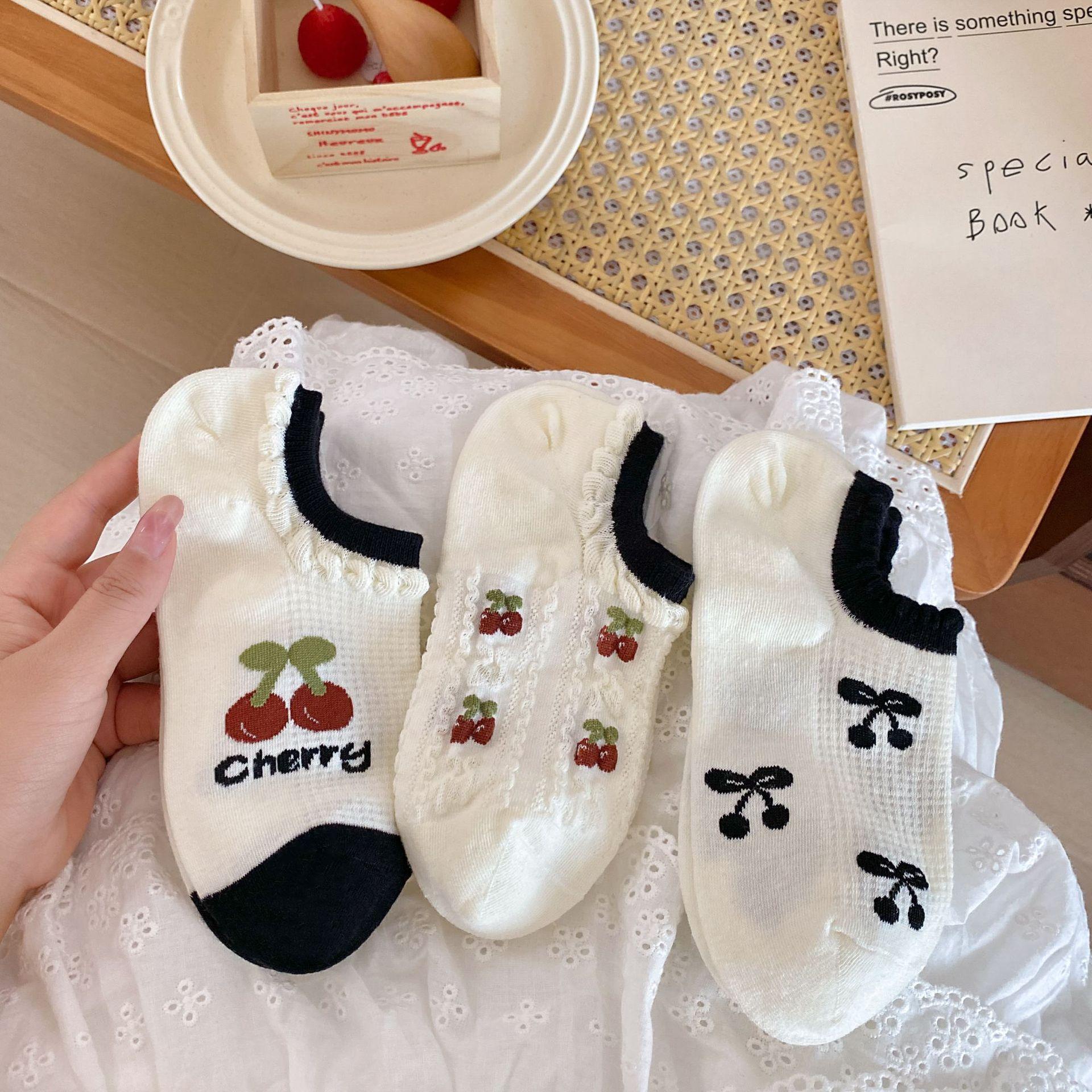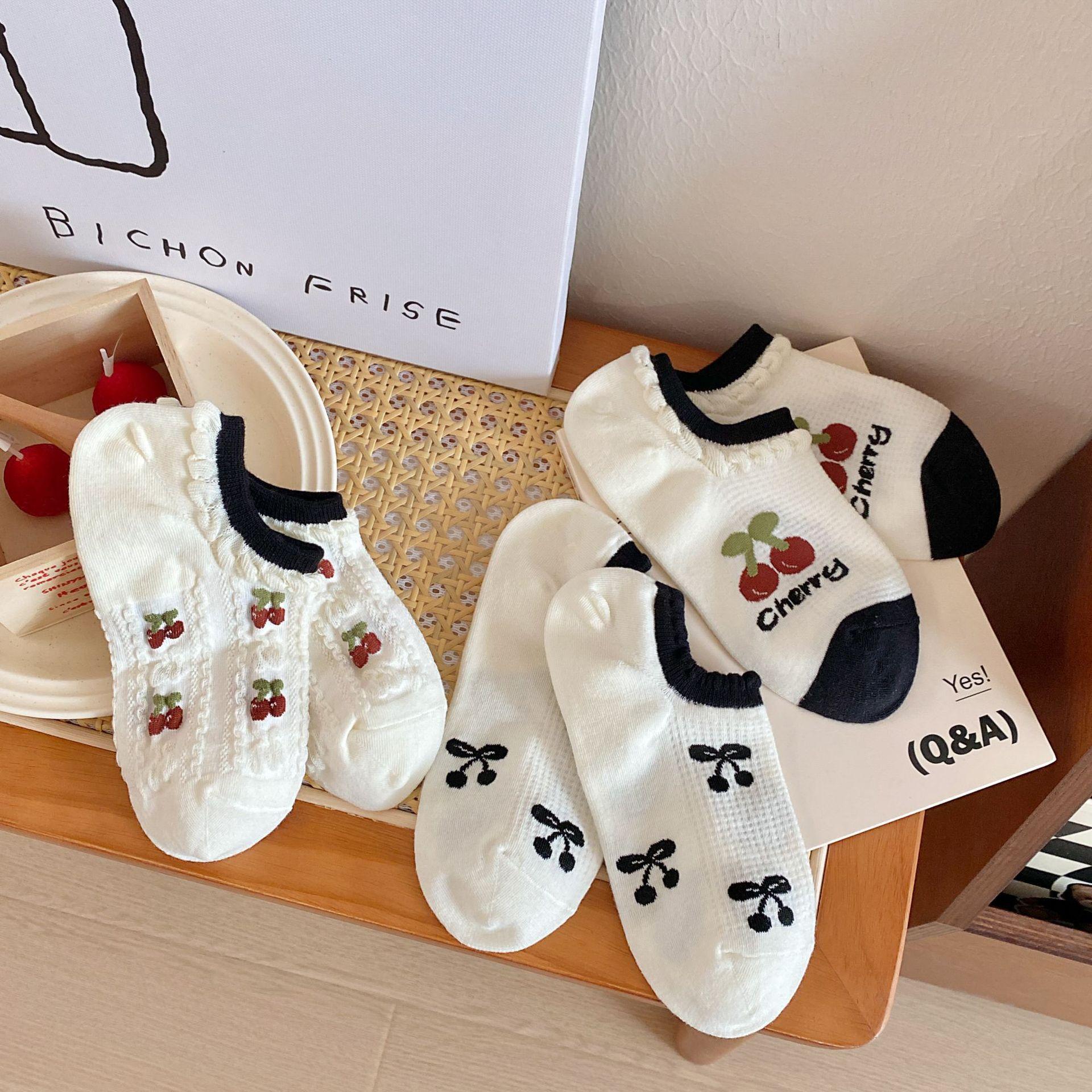 Calcetines invisibles de boca baja para mujer, finos, japoneses, de algodón, de malla con diseño de cereza, transpirables, de verano