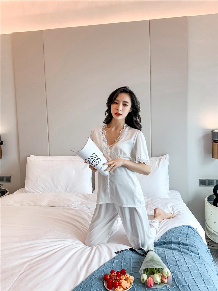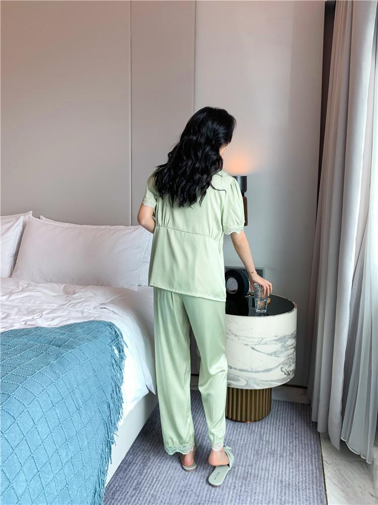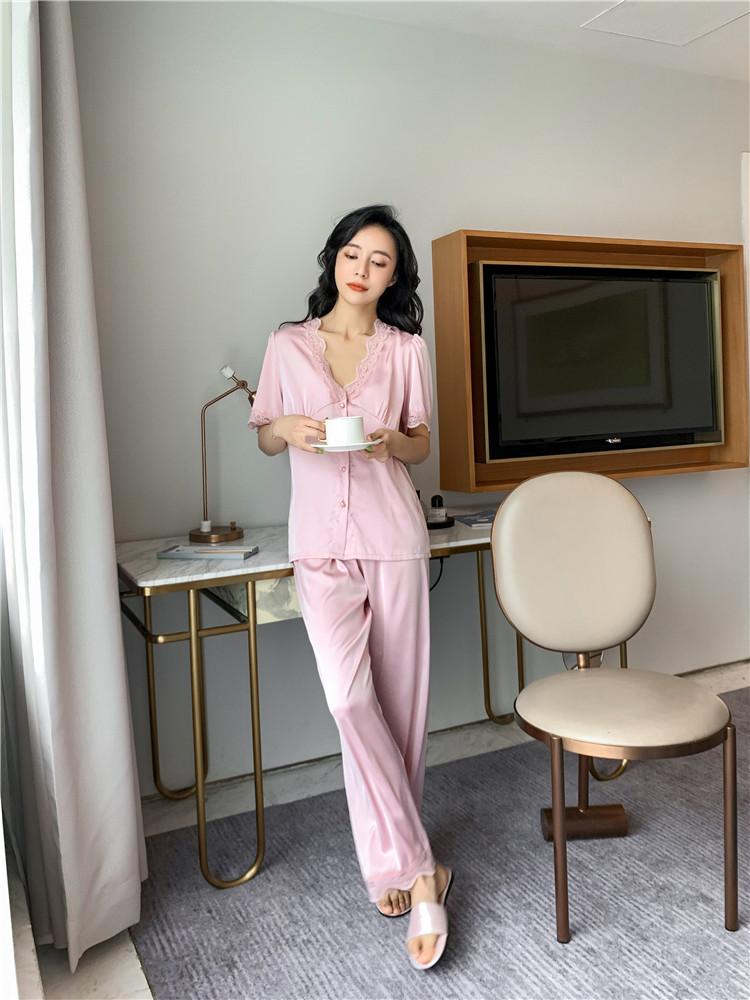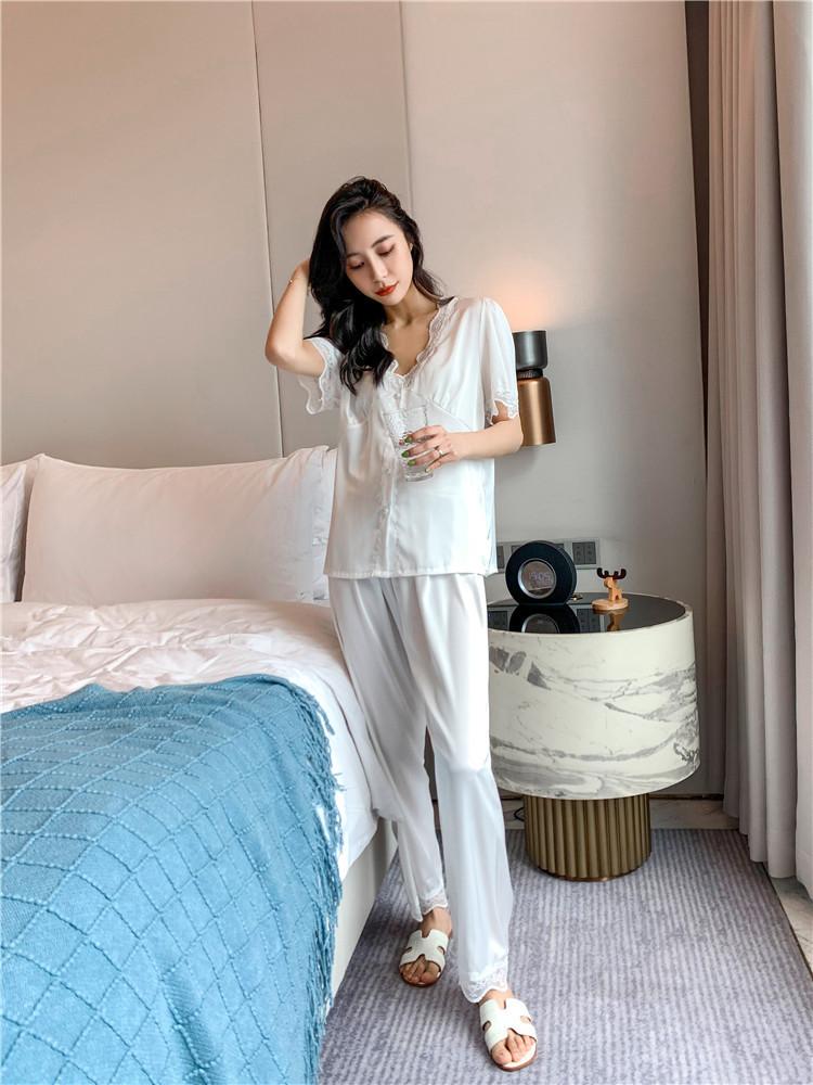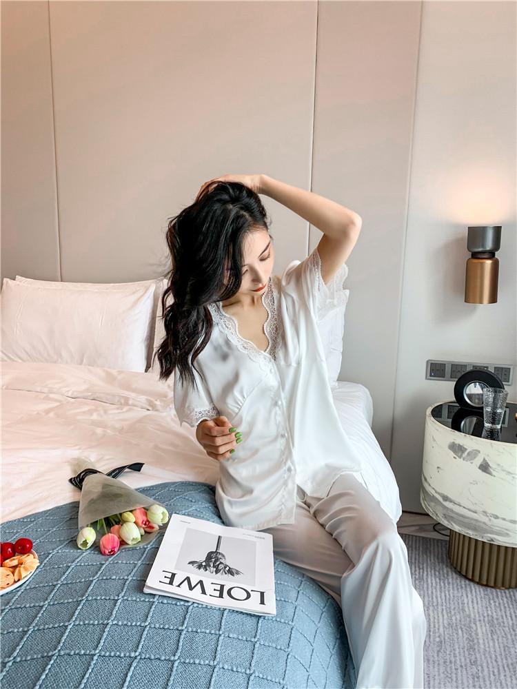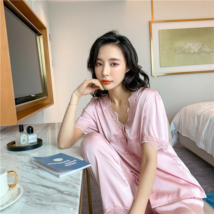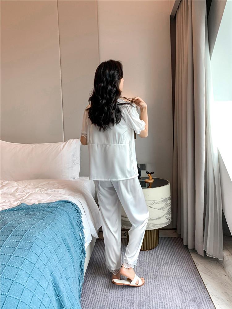 Una generación de pijamas de seda de hielo para mujer de primavera y verano, traje de pantalón largo de manga corta con mangas abullonadas de encaje, suministro en vivo para mujer