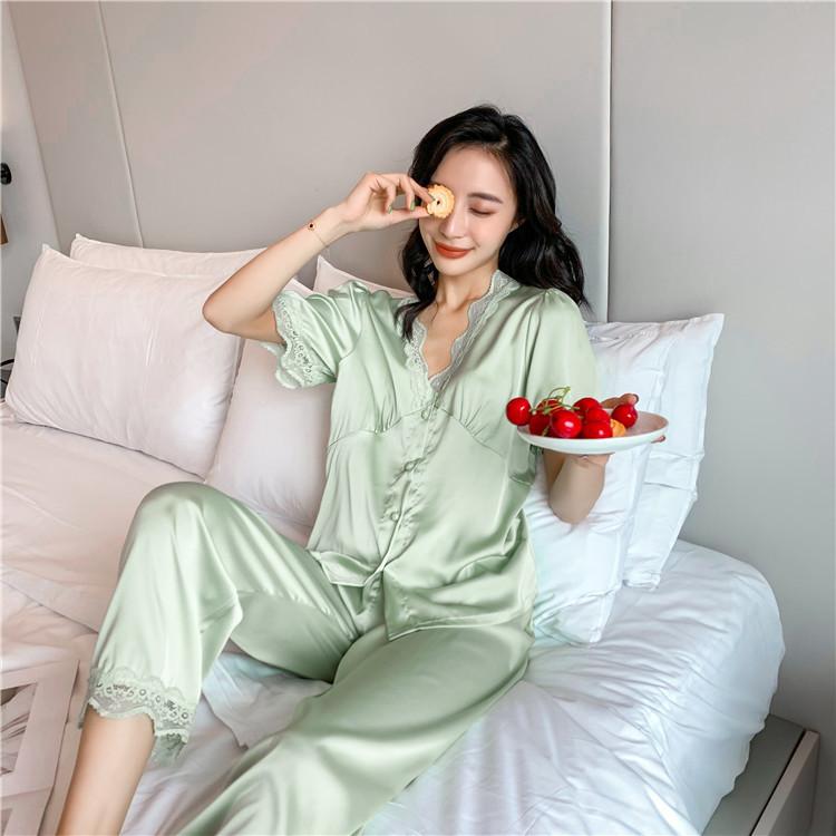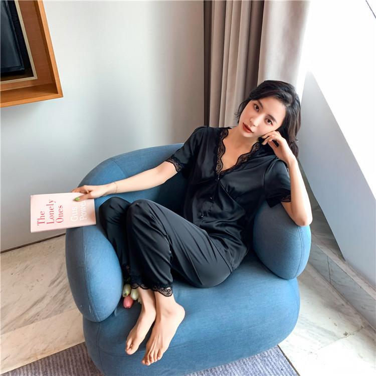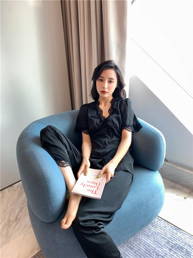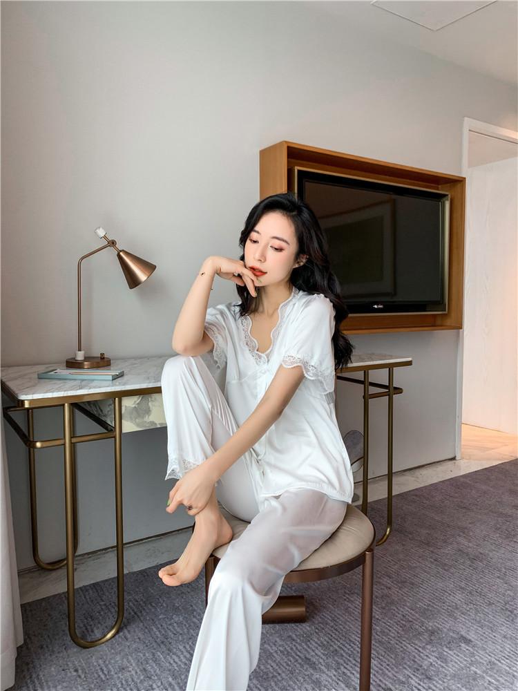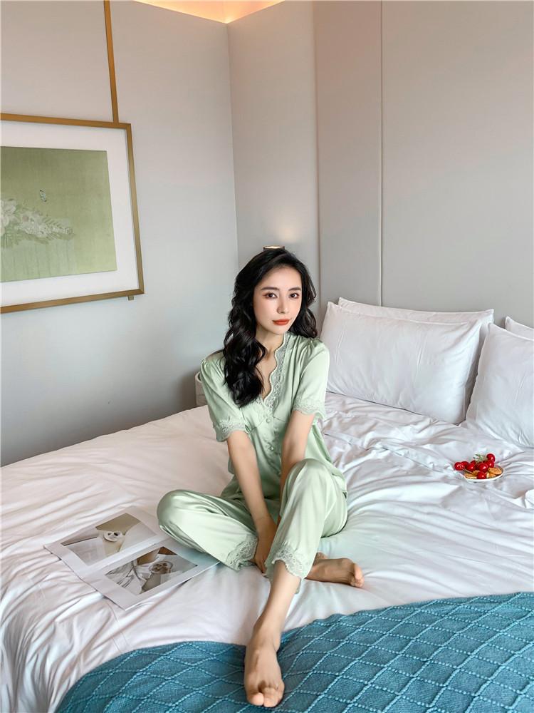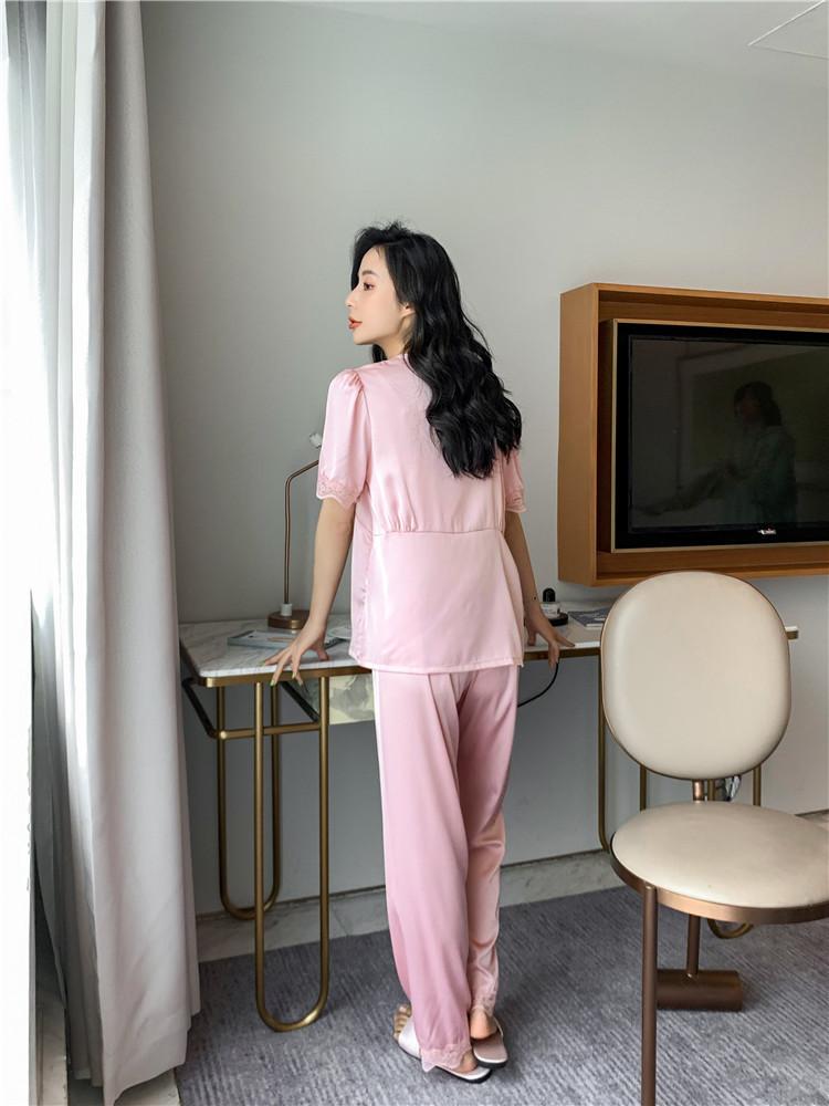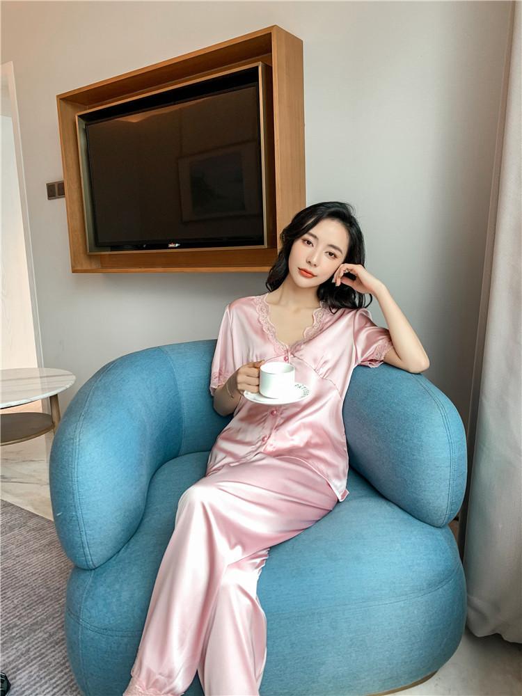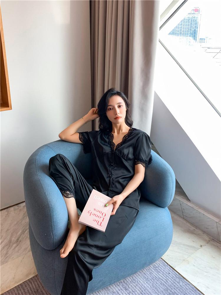 Una generación de pijamas de seda de hielo para mujer de primavera y verano, traje de pantalón largo de manga corta con mangas abullonadas de encaje, suministro en vivo para mujer