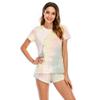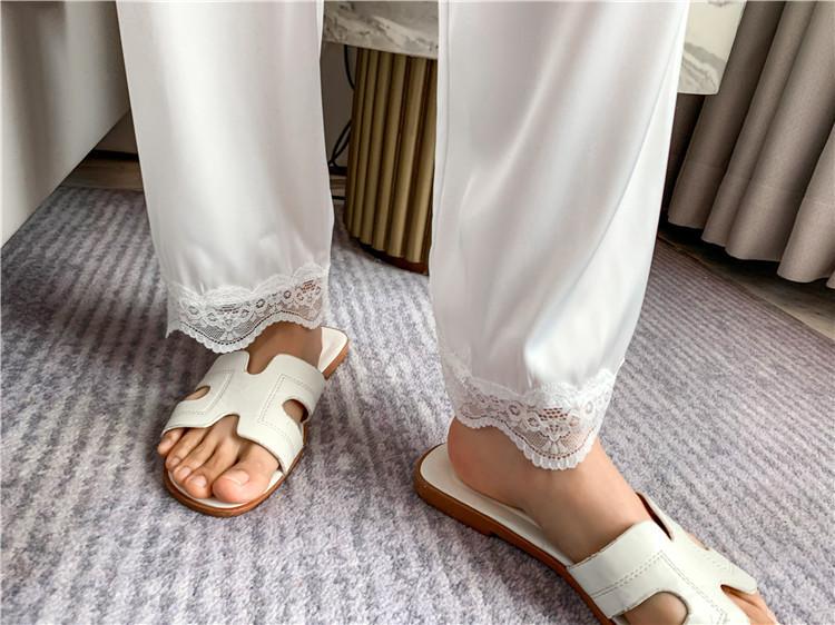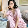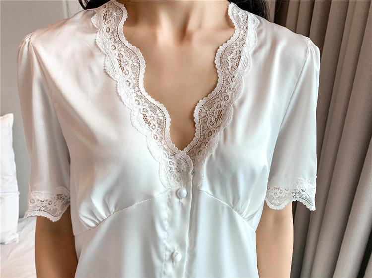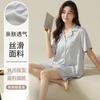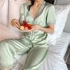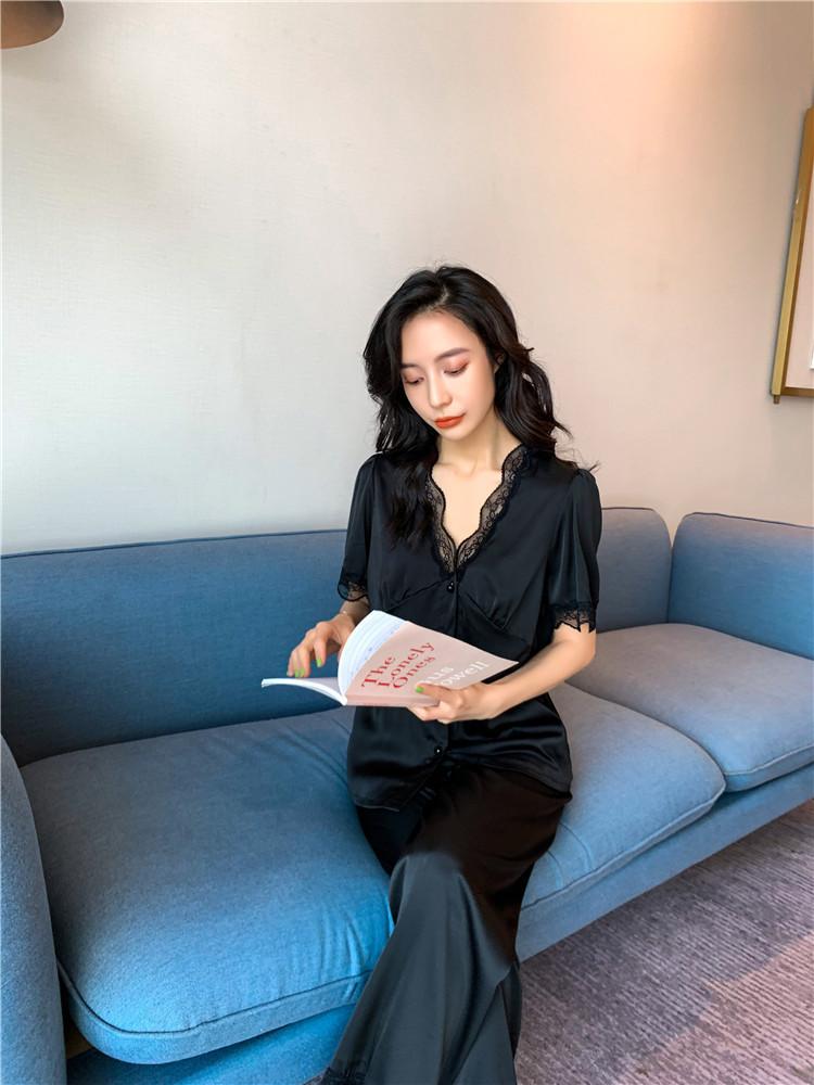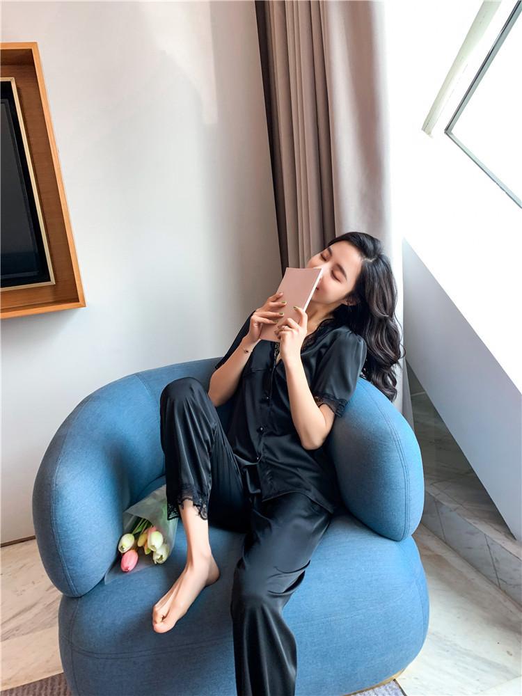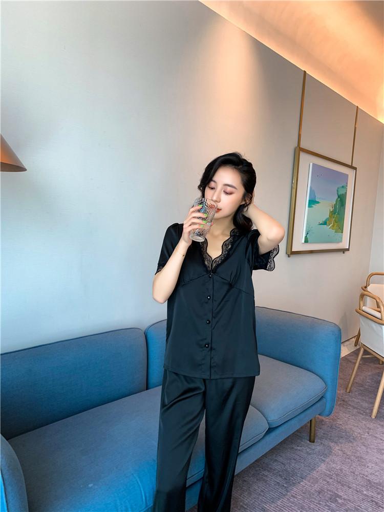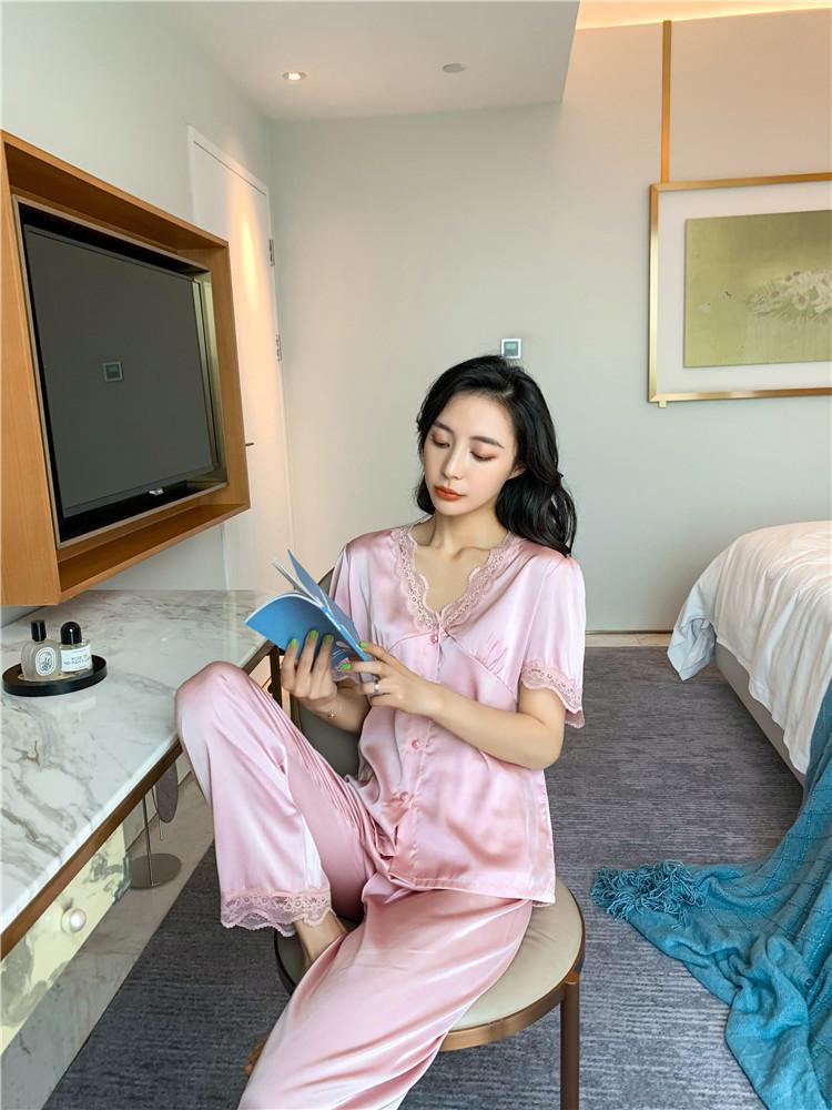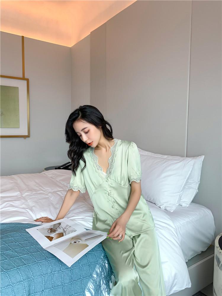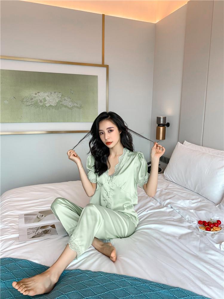 Una generación de pijamas de seda de hielo para mujer de primavera y verano, traje de pantalón largo de manga corta con mangas abullonadas de encaje, suministro en vivo para mujer