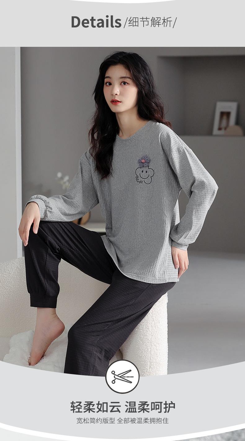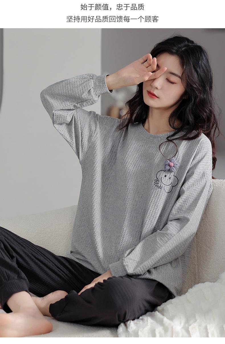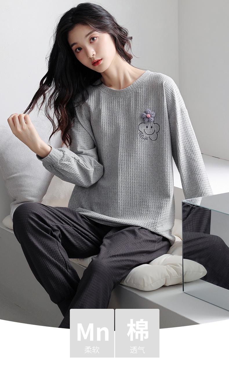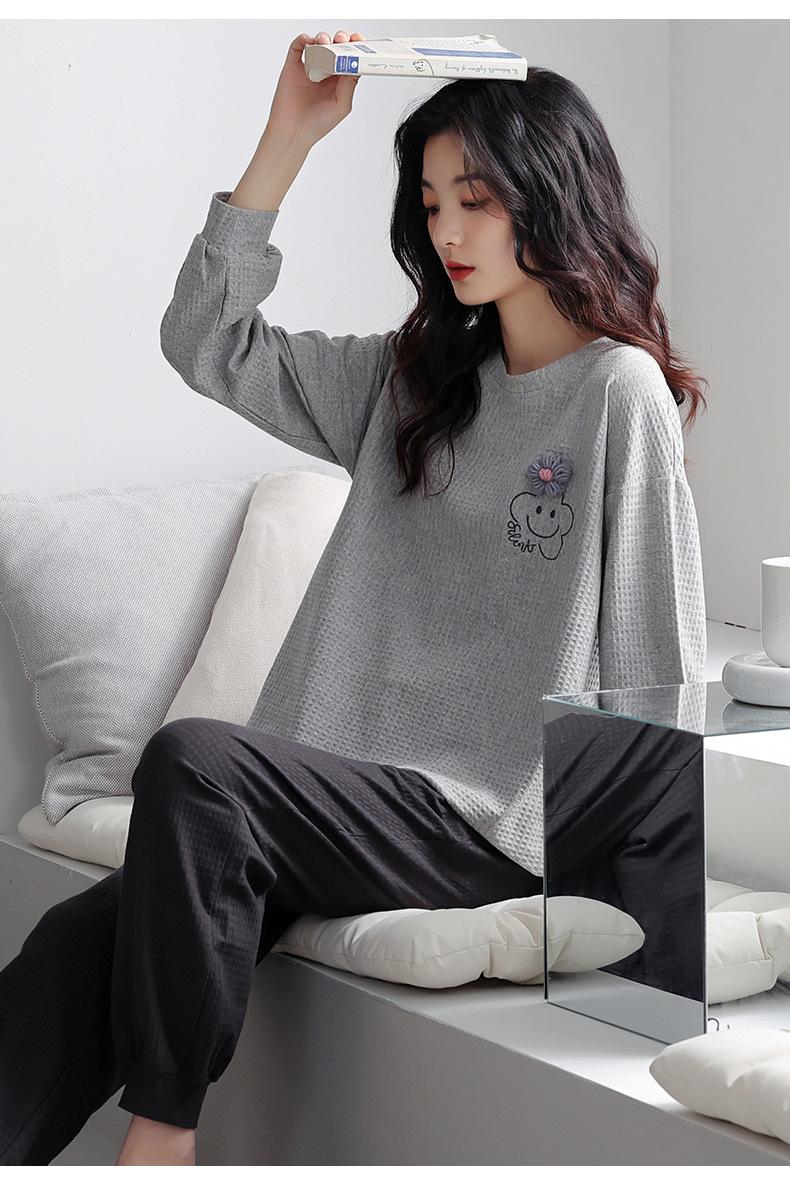 Pijama de manga larga para mujer de algodón, pantalones gofrados pull-up, jersey de cuello redondo, casual holgado de manga larga para mujer para estar en casa