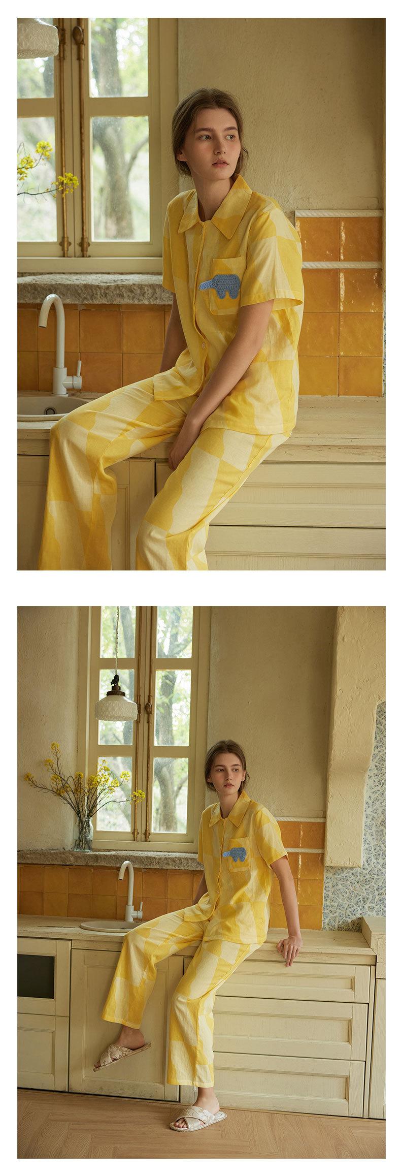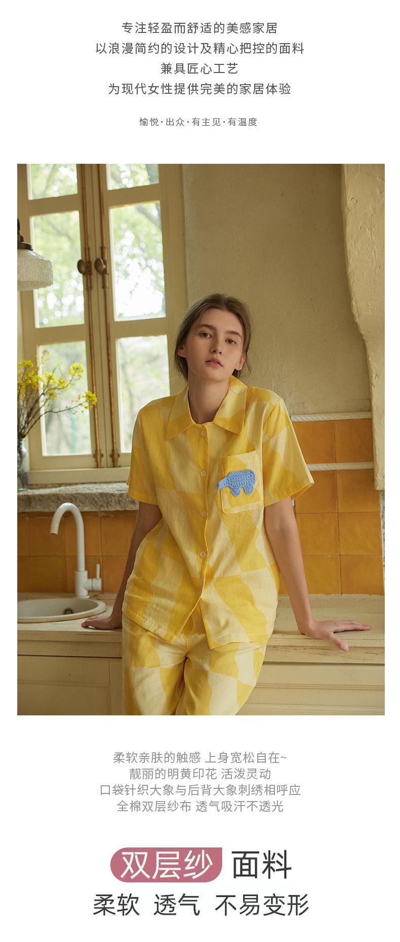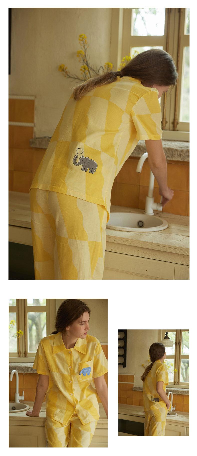 Nuevo Algodón Gasa Doble Capa Solapa Elefante de Dibujos Animados Bolsillo Espalda Bordado Manga Larga Conjunto de Pijama para Casa