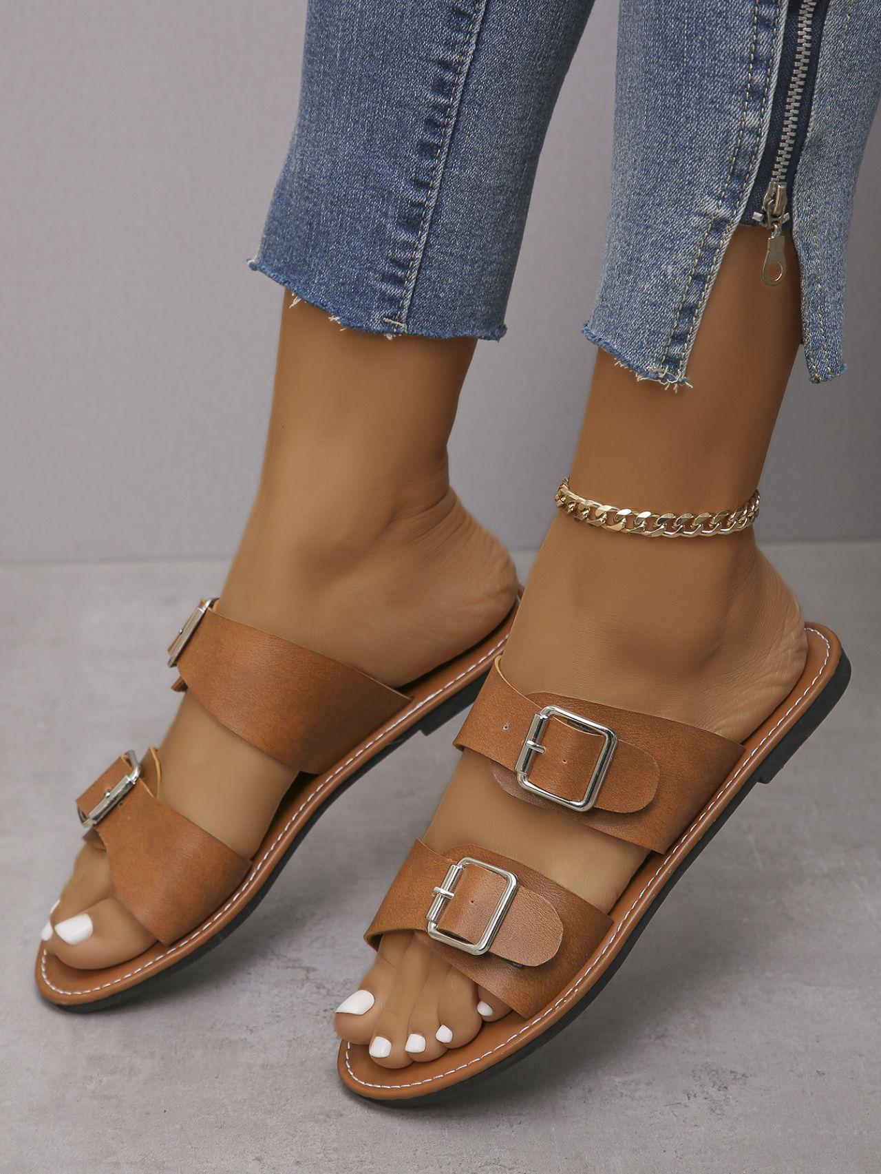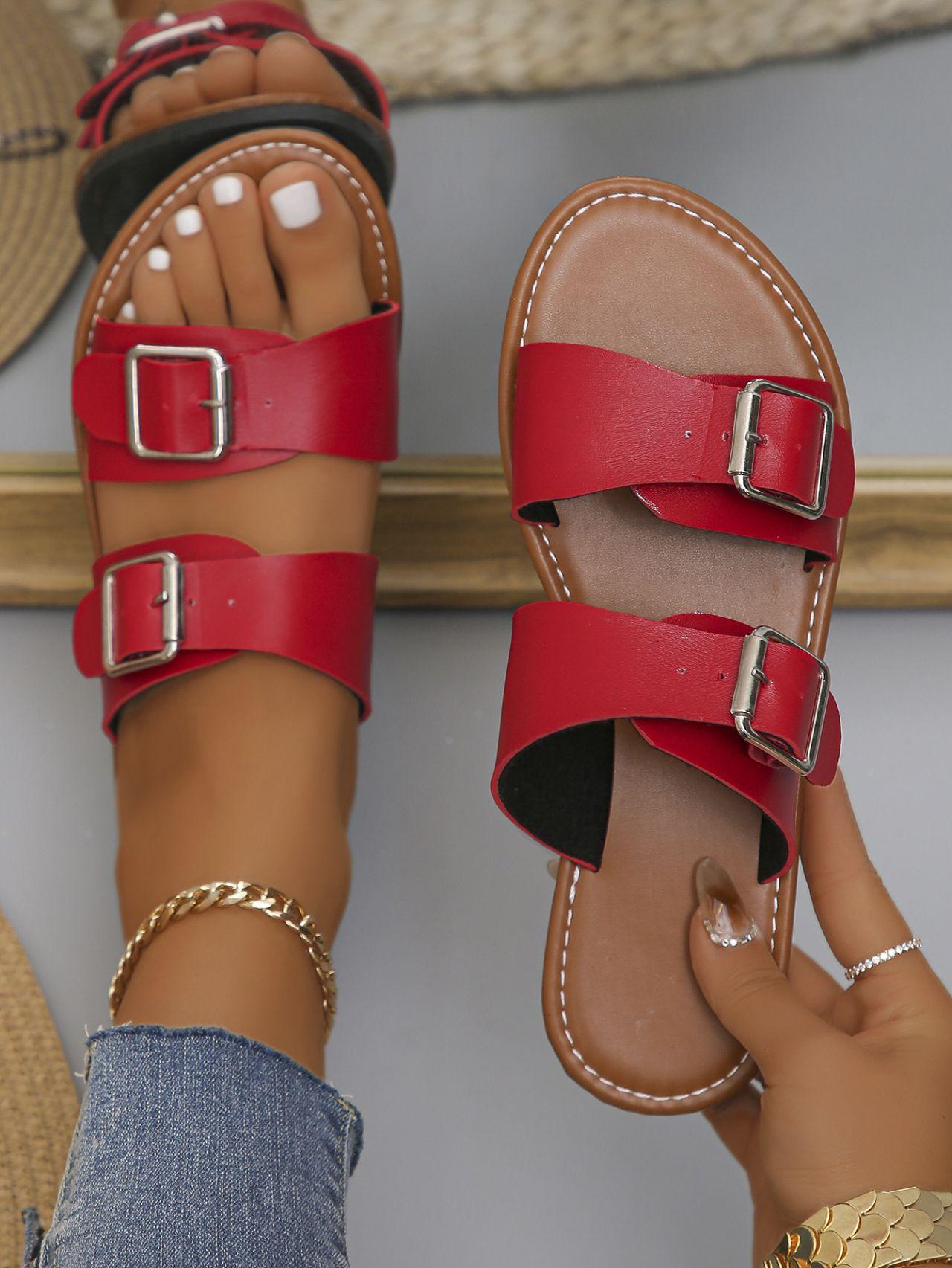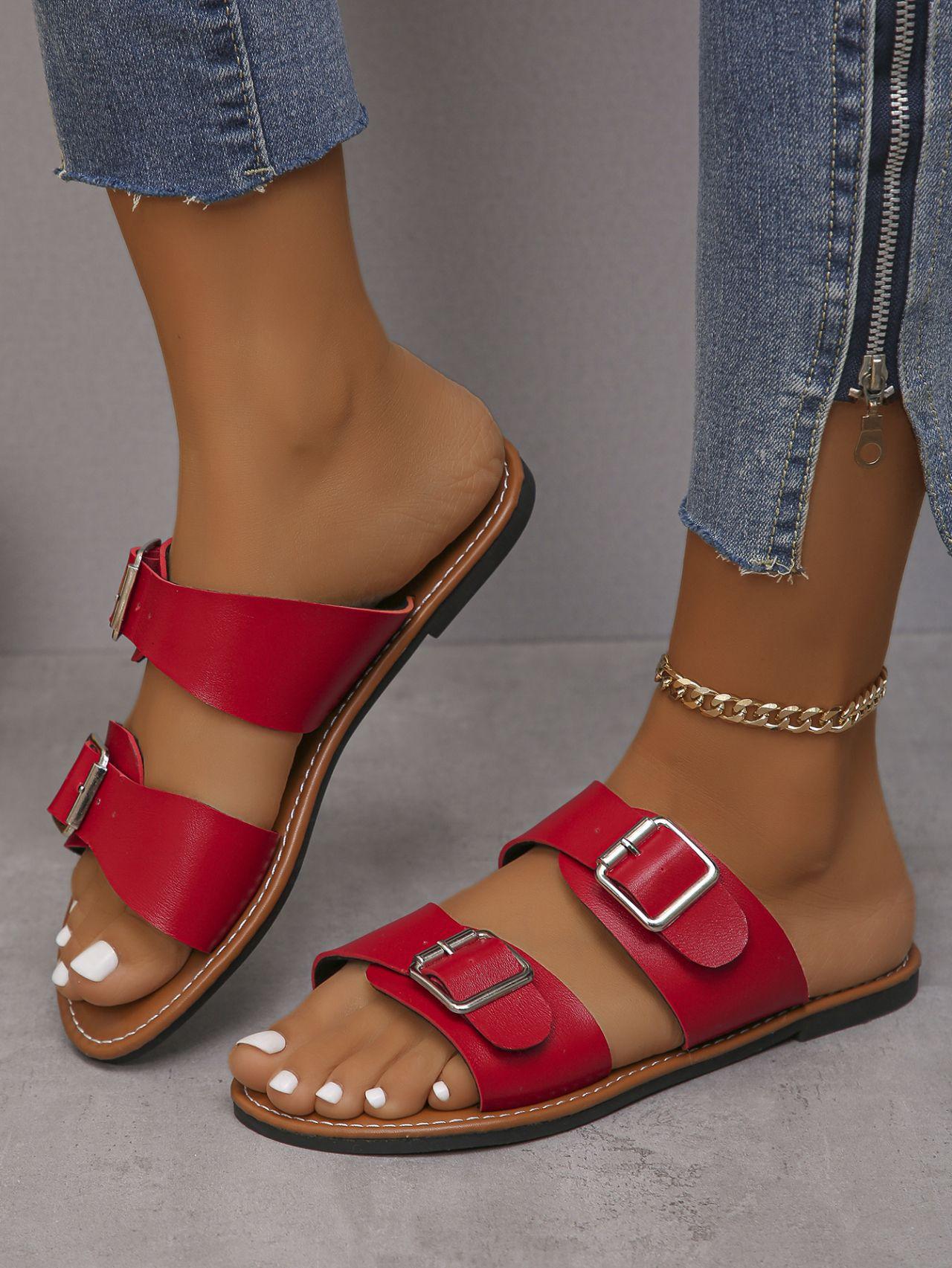 Pantuflas de Talla Grande para Comercio Exterior 2025 Verano Nuevo Pantuflas Europeas y Americanas Hebilla de Cinturón Doble de una Palabra Pantuflas de Mujer Planas Casuales