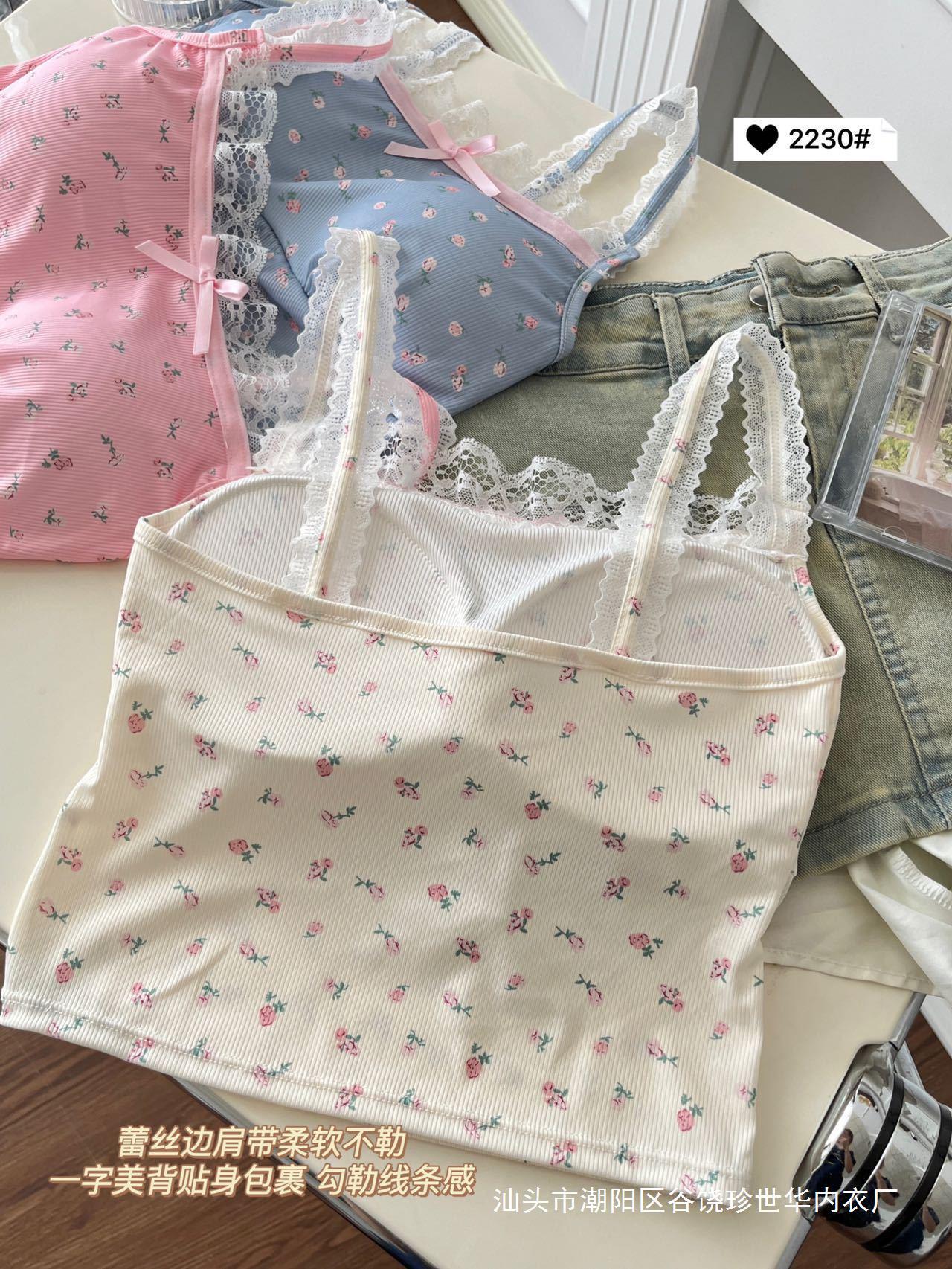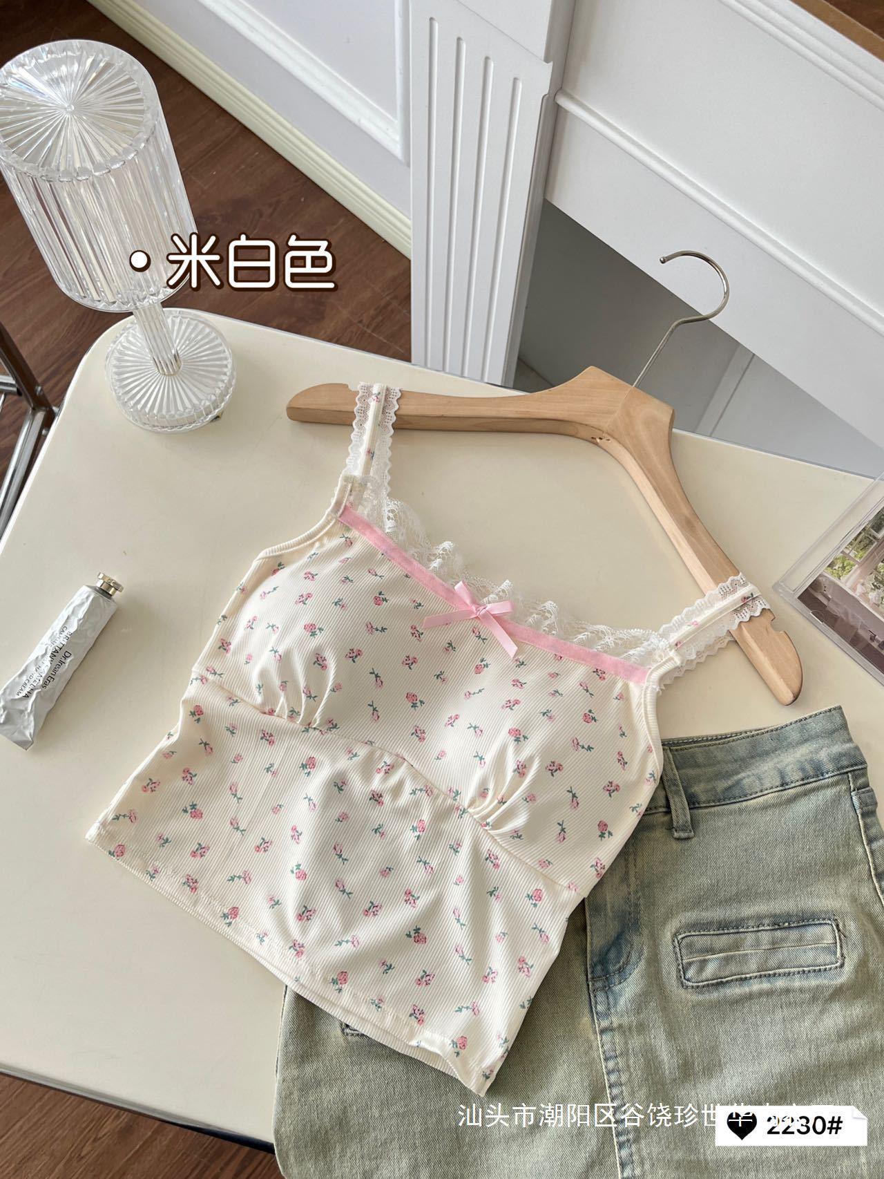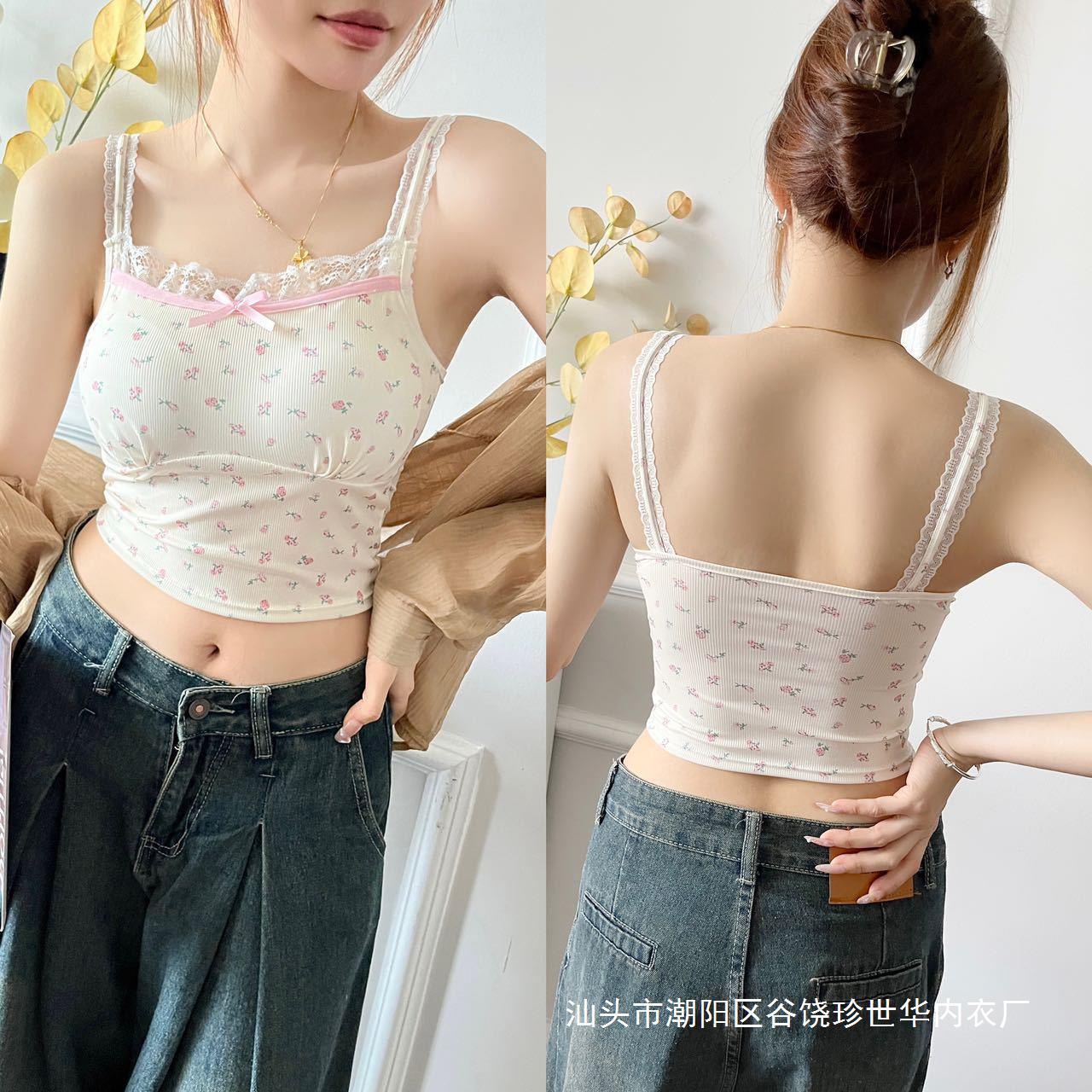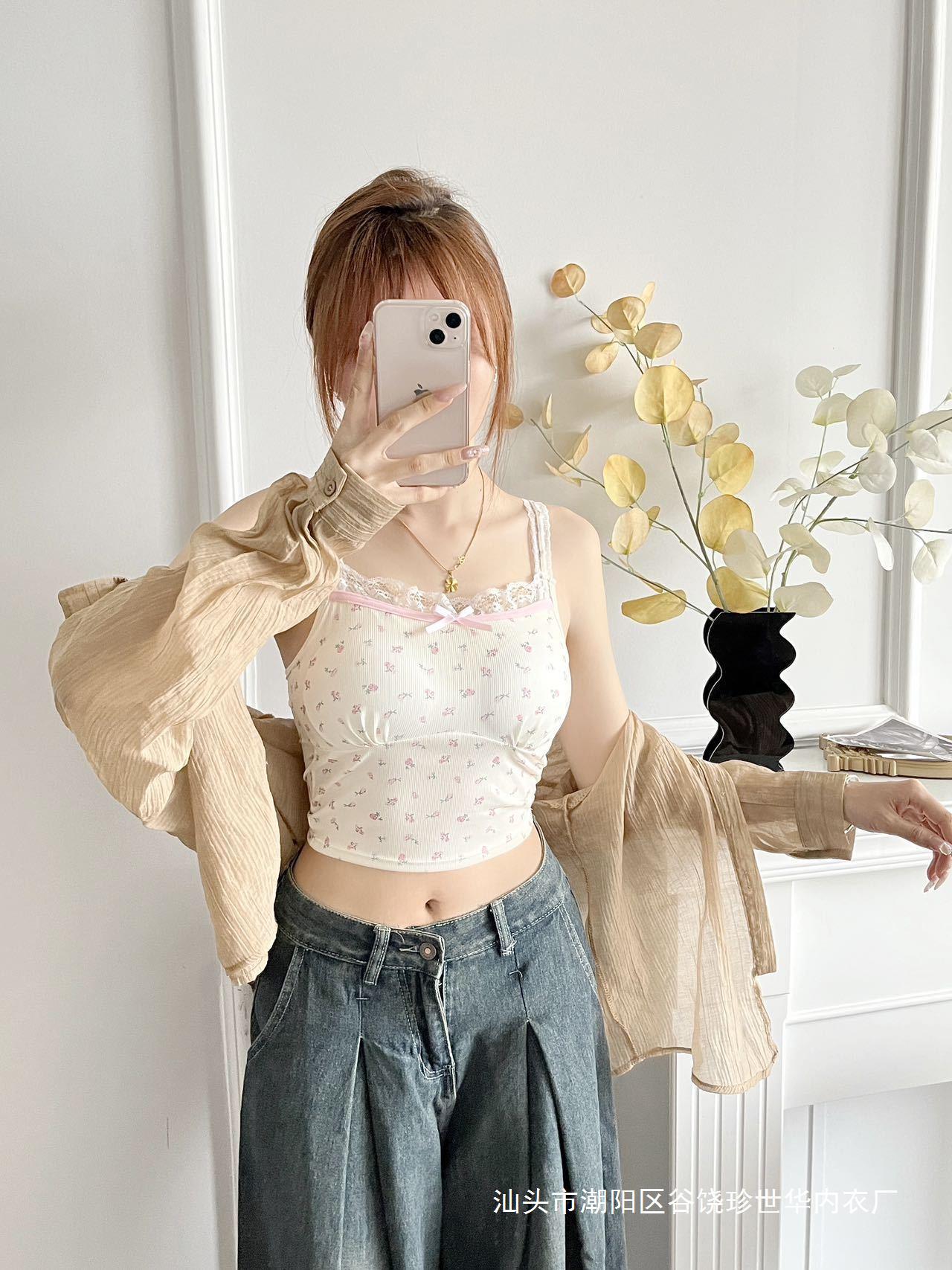Deseo Puro Lazo Dulce Camisola Floral Pequeña de Encaje para Verano de Mujer Encaje Sexy Adelgazante Corto Top Exterior