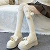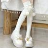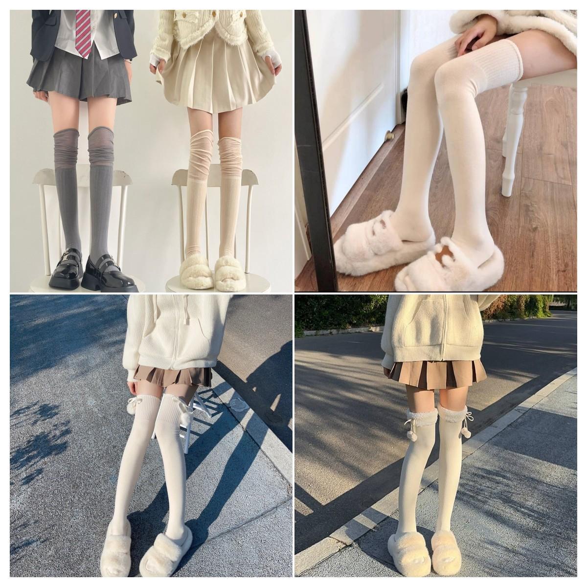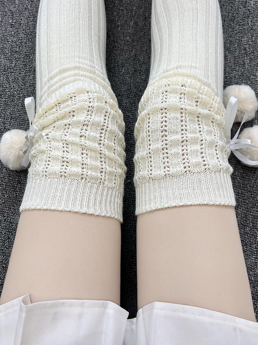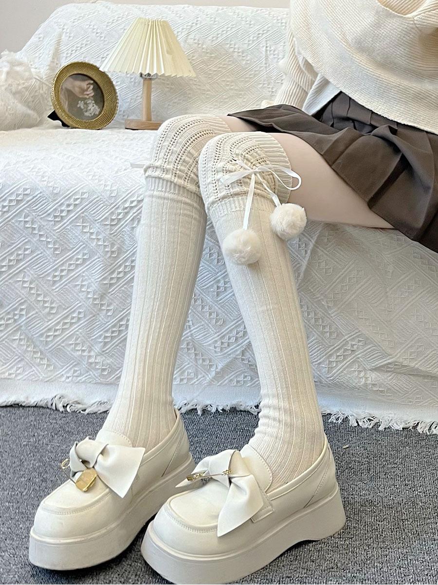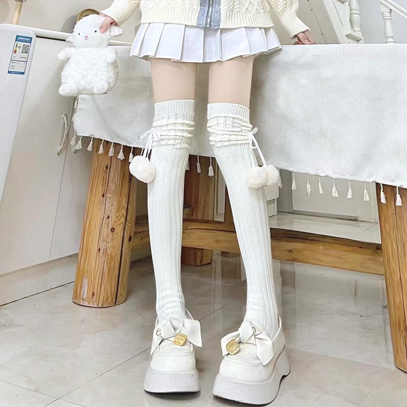 Calcetines hasta la rodilla de color blanco leche, bonitos calcetines japoneses de otoño e invierno con bolas, calcetines beige altos hasta el muslo, calcetines con bolas de pelo para mujer jk