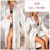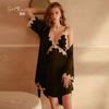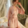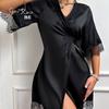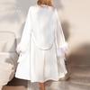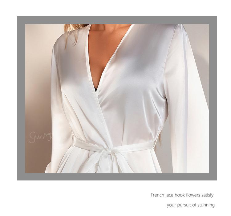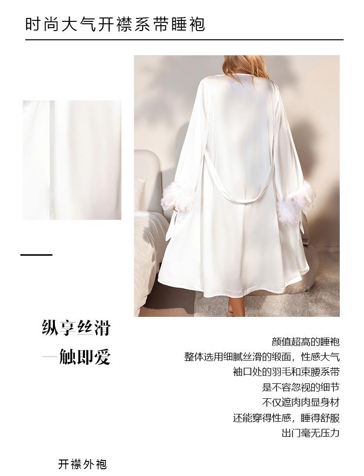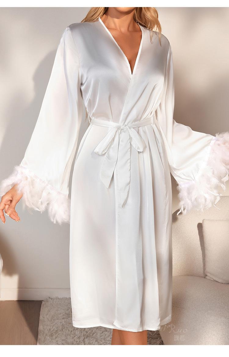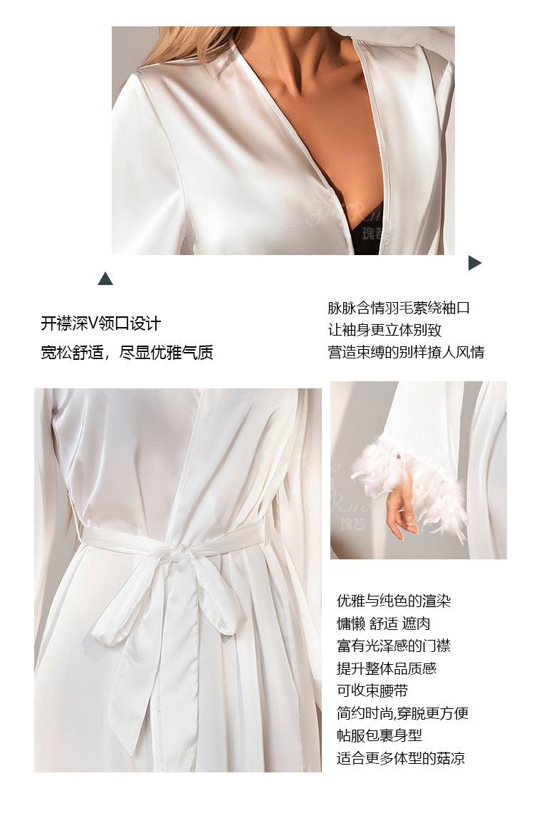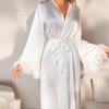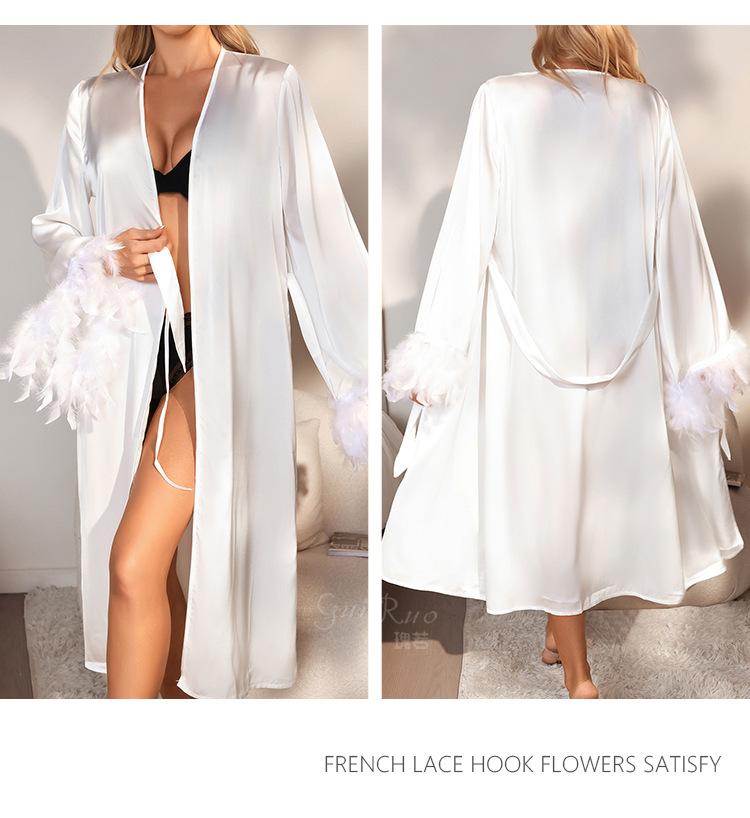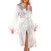 Guiruo Bata de Satén Sedoso con Puños de Plumas Escote en V Profundo Sexy Color Sólido con Cordones para Mujer para Casa 9620 Set de Bata