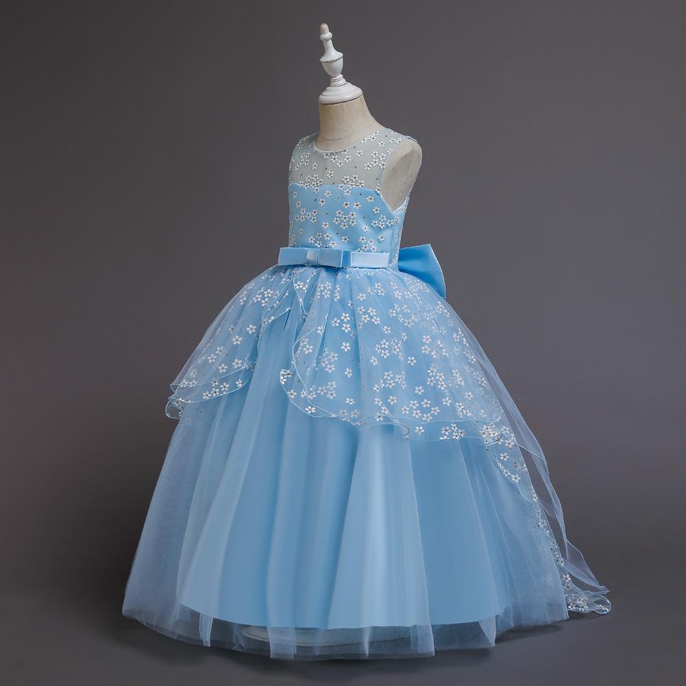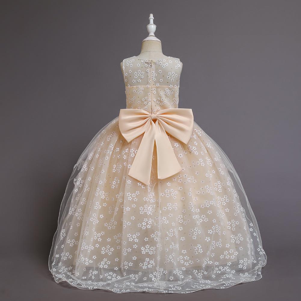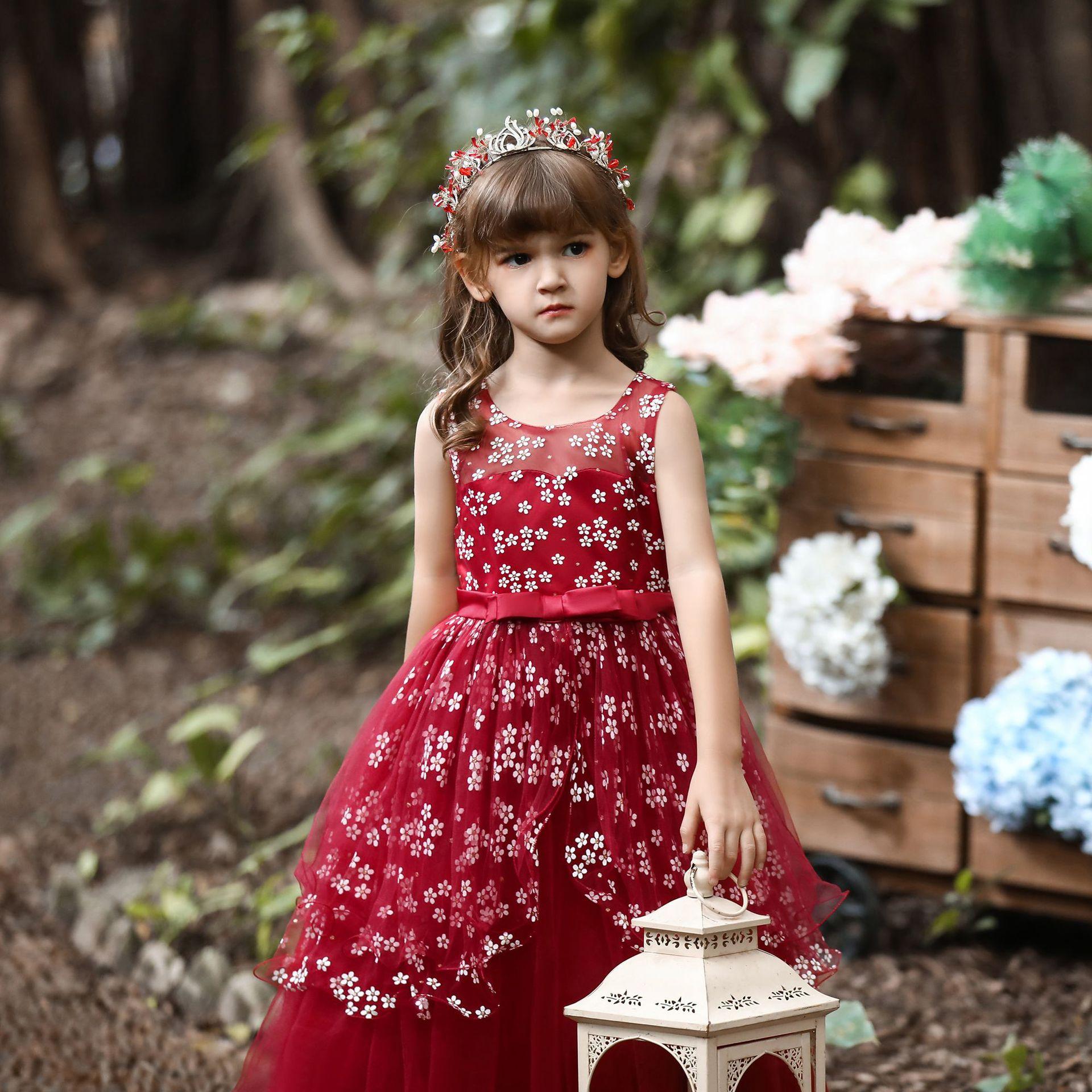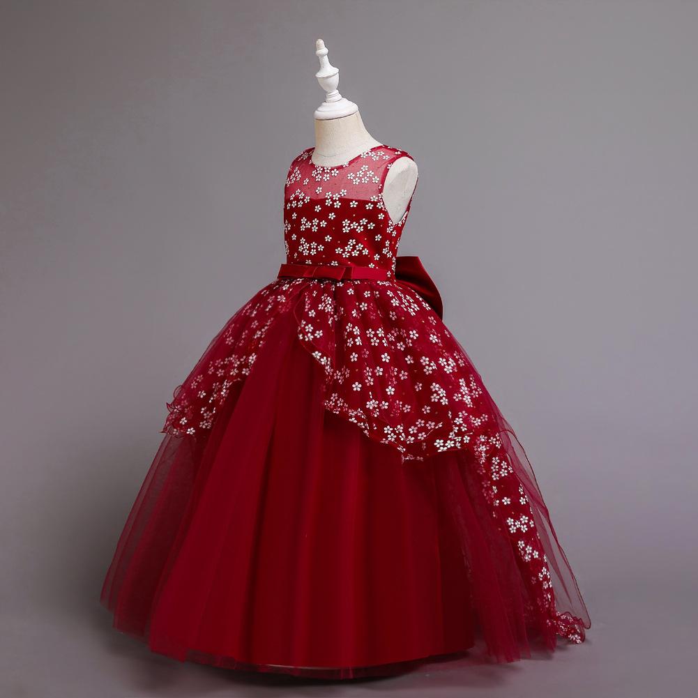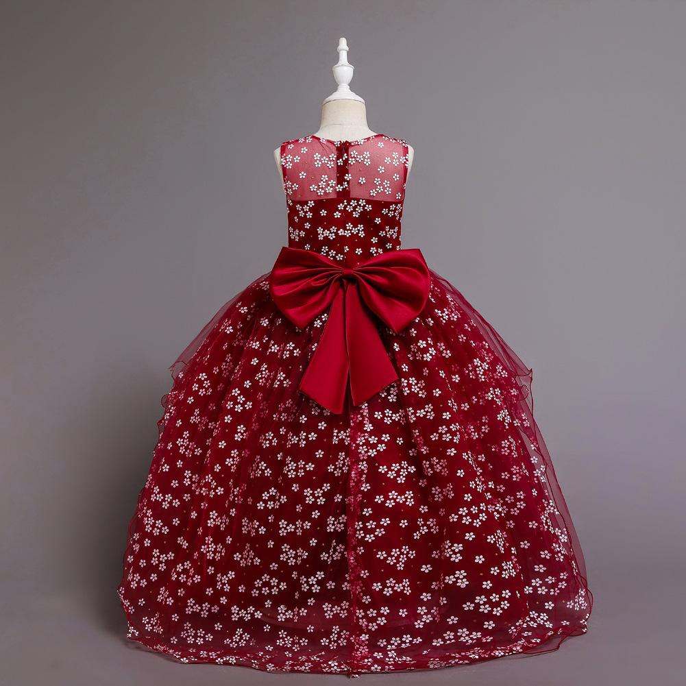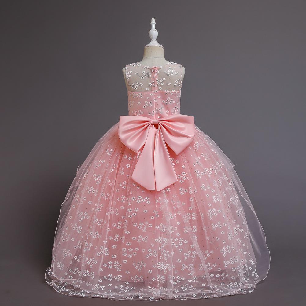 Vestido infantil europeo y americano nuevo, vestido infantil grande con lazo de flores de encaje, vestido de princesa para niña pequeña con cola de flores