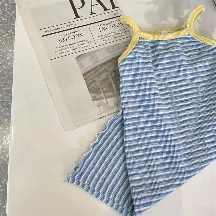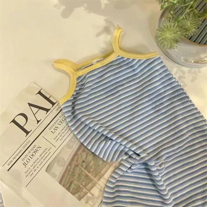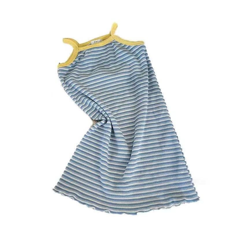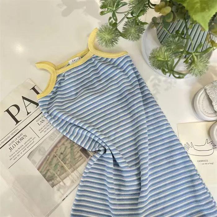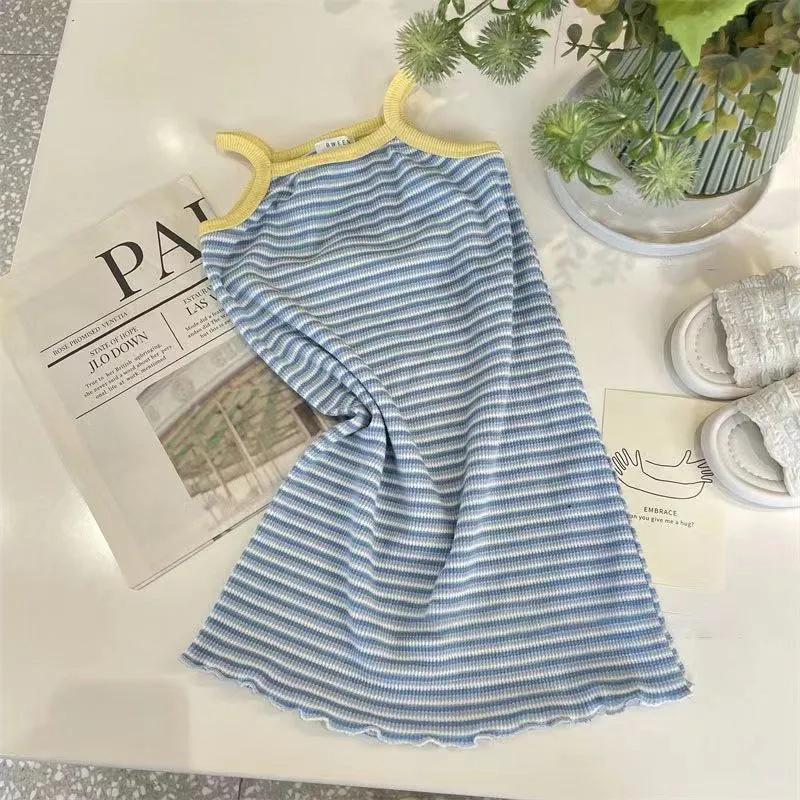Vestido de Verano para Niñas Bebé Elegante Infantil Personalizado Moderno Marca Coreana Bloque de Color Rayado Princesa Playa Slip Falda