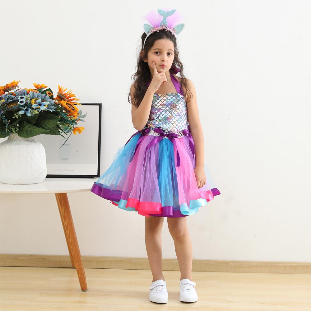 2023 nueva ropa infantil, vestido de sirena para niña, falda tutú con lazo y forro, vestido de princesa con cuello halter para niña