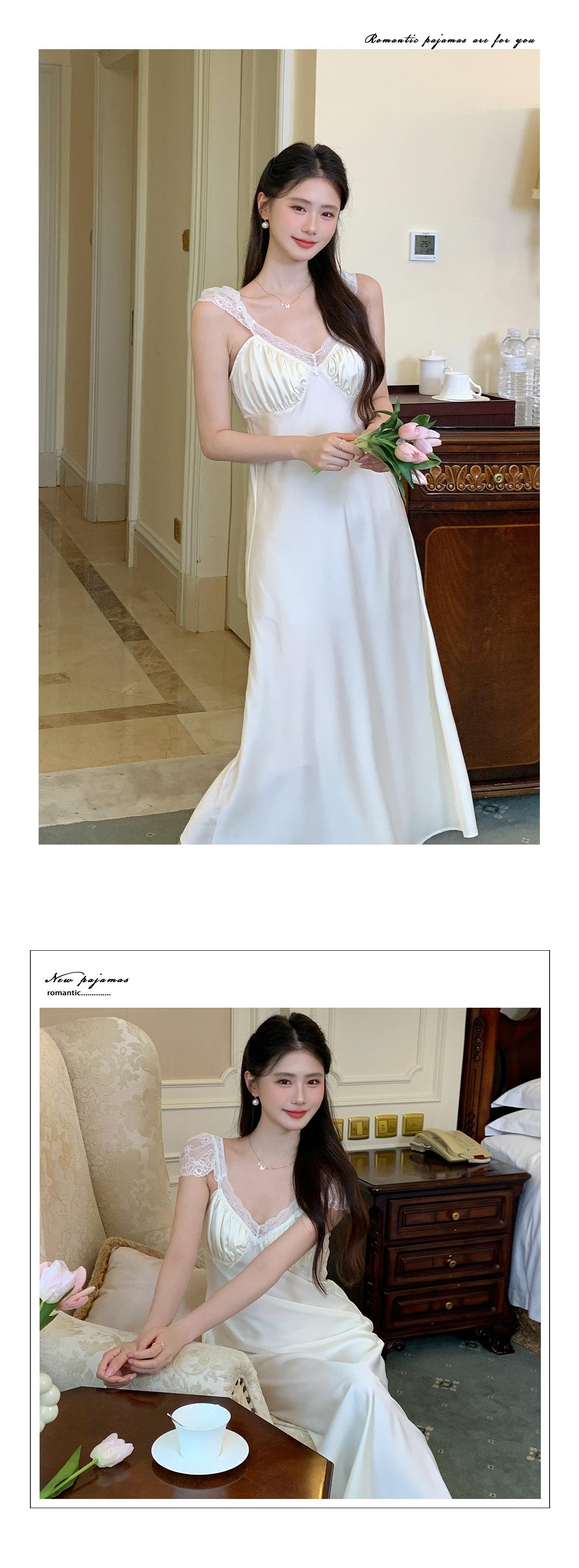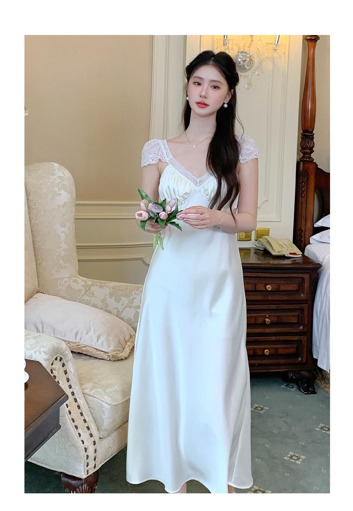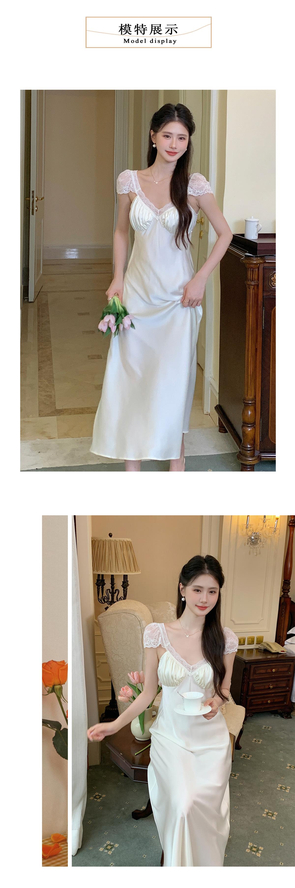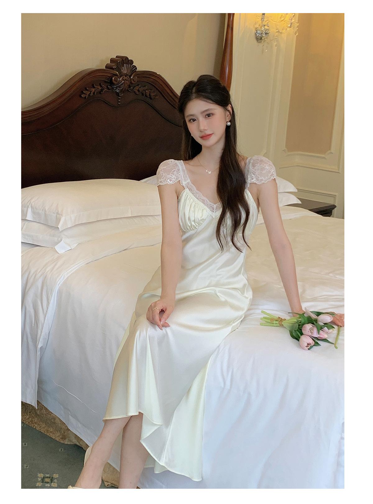 Pijama francés, Camisón largo, Camisón sexy de verano con cuello en V, Vestido para casa de satén de alta gama, fino, de color puro