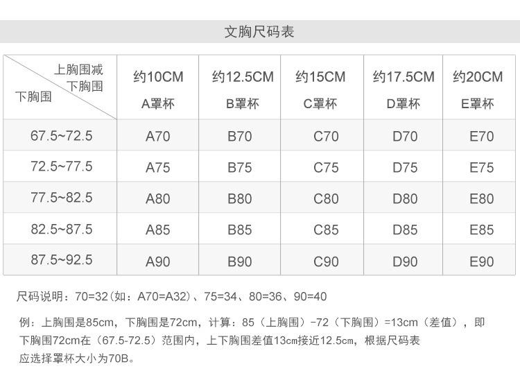 S fit 32/70ABC cup, M Fit 34/75ABC Cup, l Fit 36/80ABC cup, XL Fit 38/85ABC