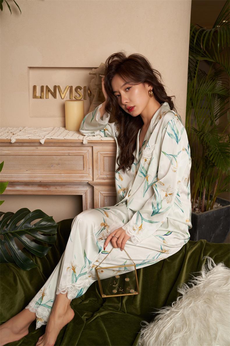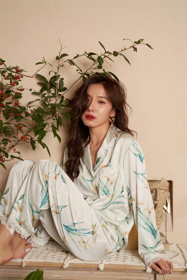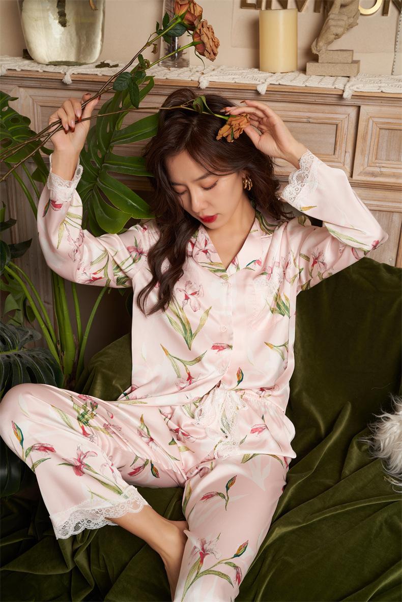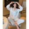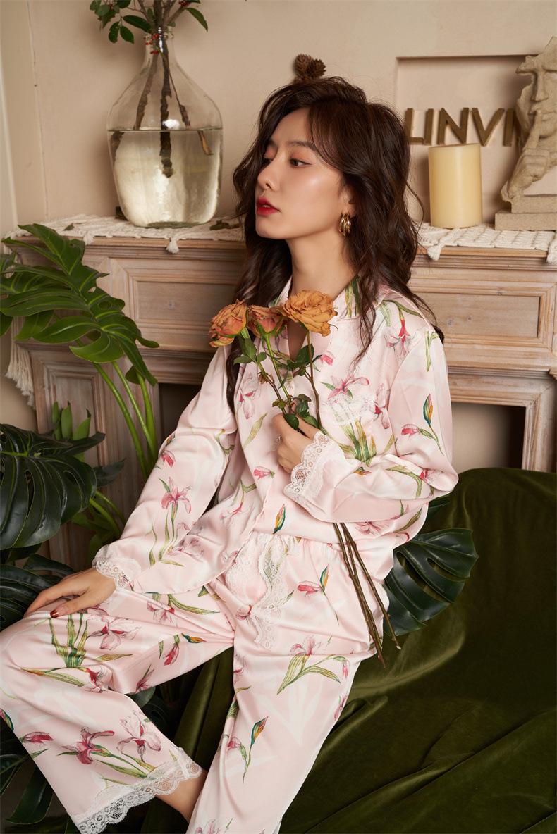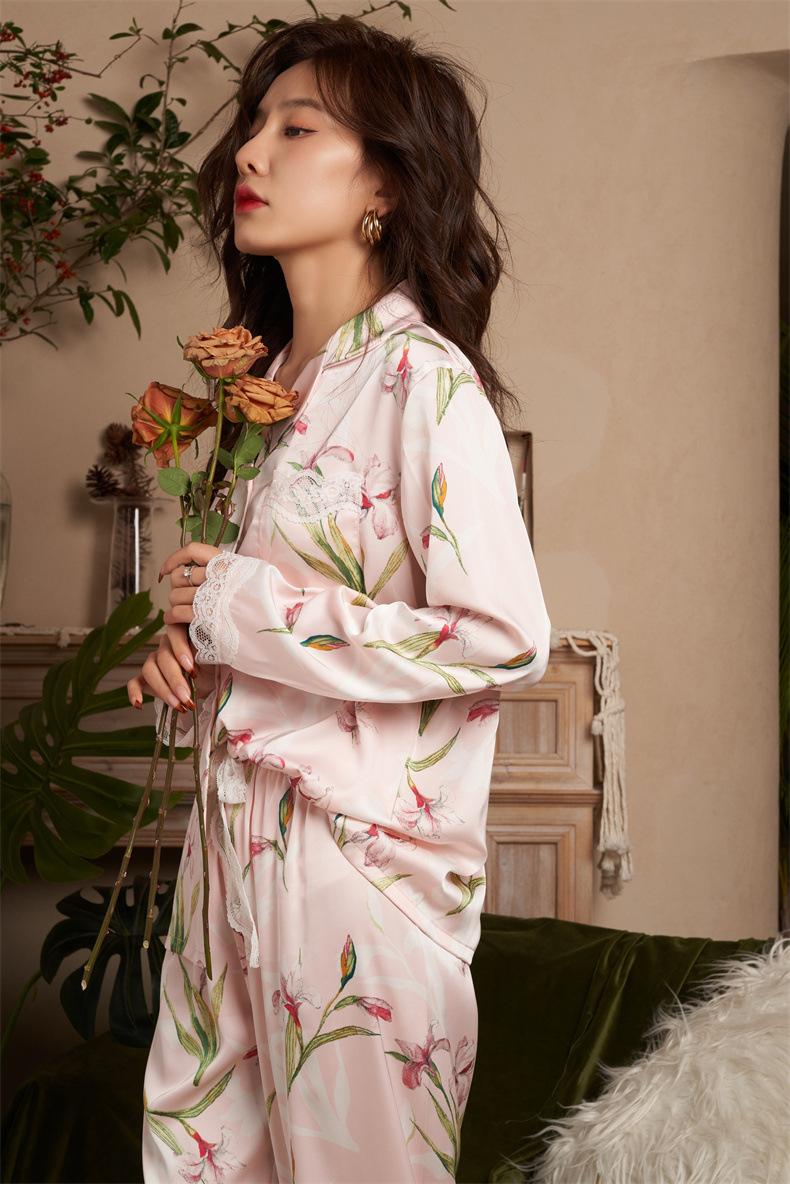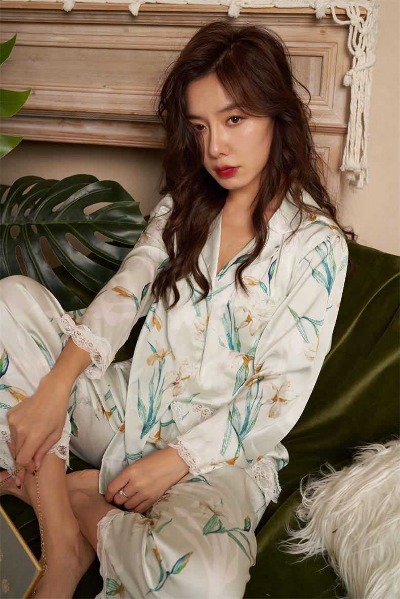 Pijama de seda de hielo para mujer, traje de primavera y verano de manga larga, sexy, de encaje de imitación de seda, ropa de casa de gran tamaño, una generación de cabello