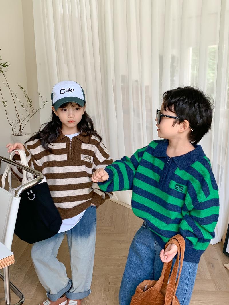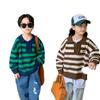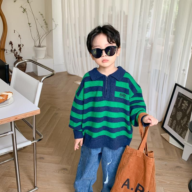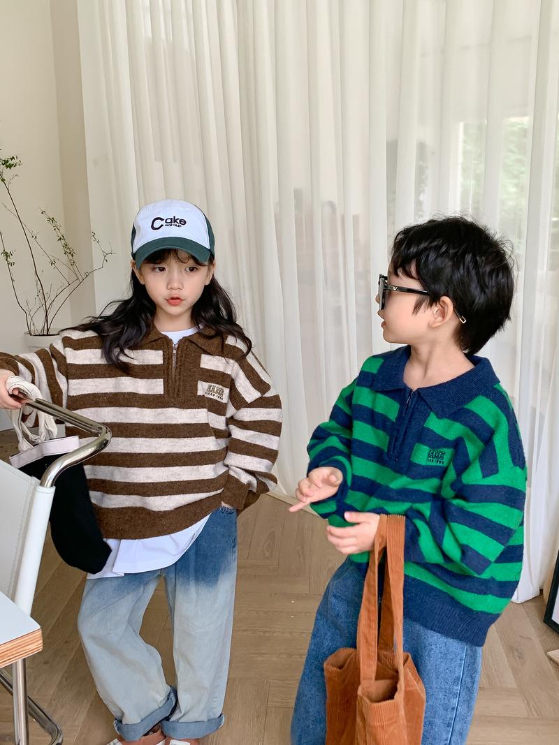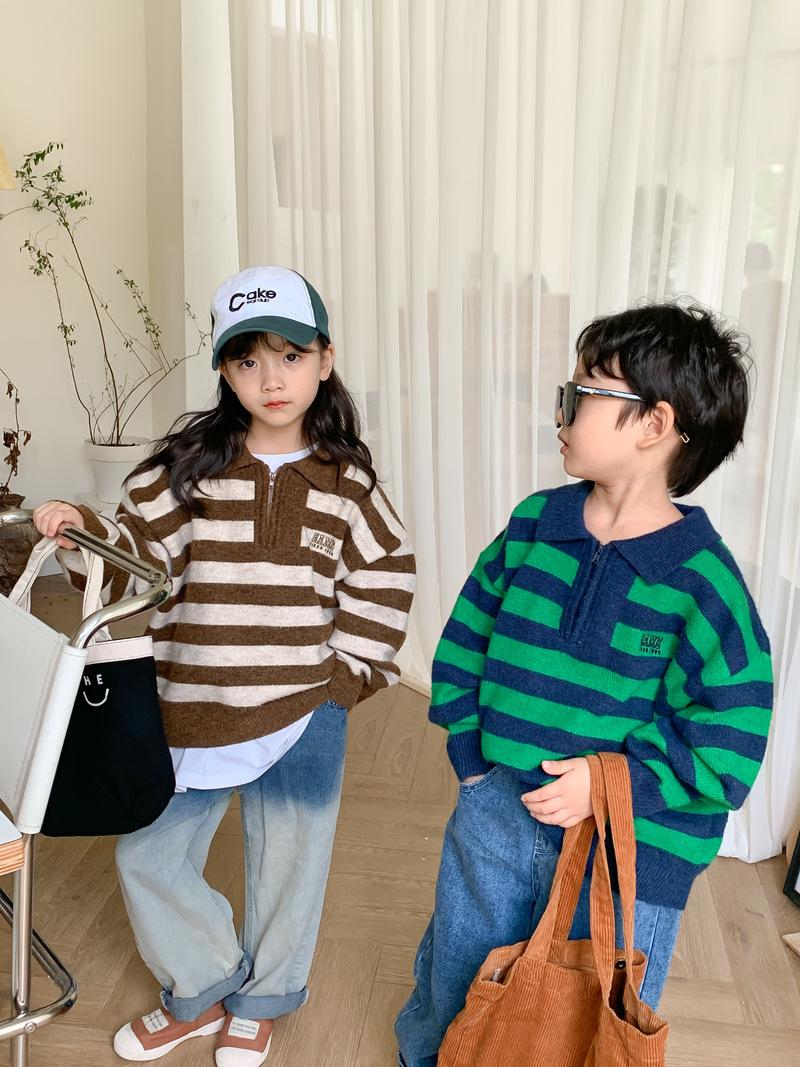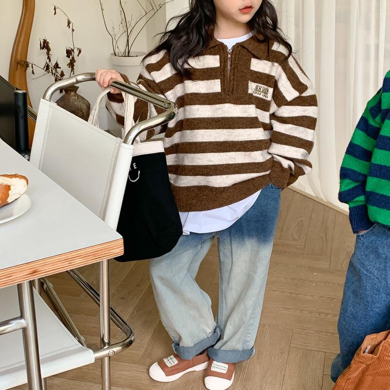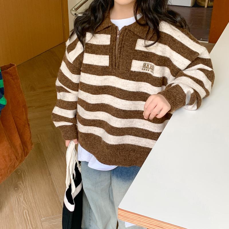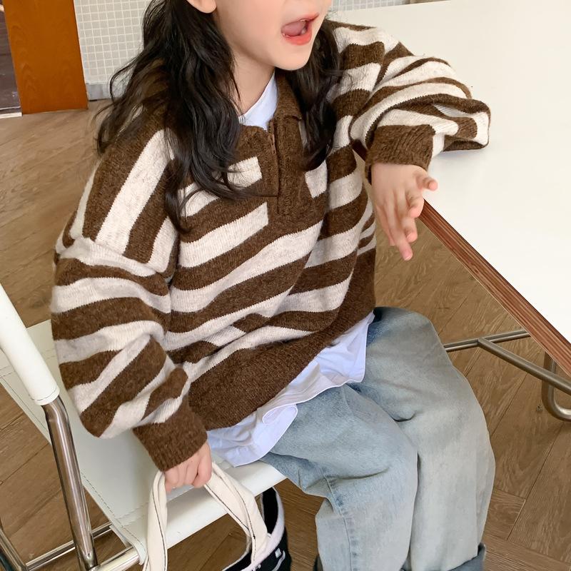 Suéter Infantil 2025 Outono Estilo Coreano Listrado Zíper para Meninos e Meninas Infantil Gola Polo Bordado Tricotado Pulôver