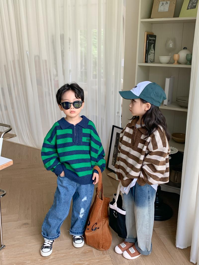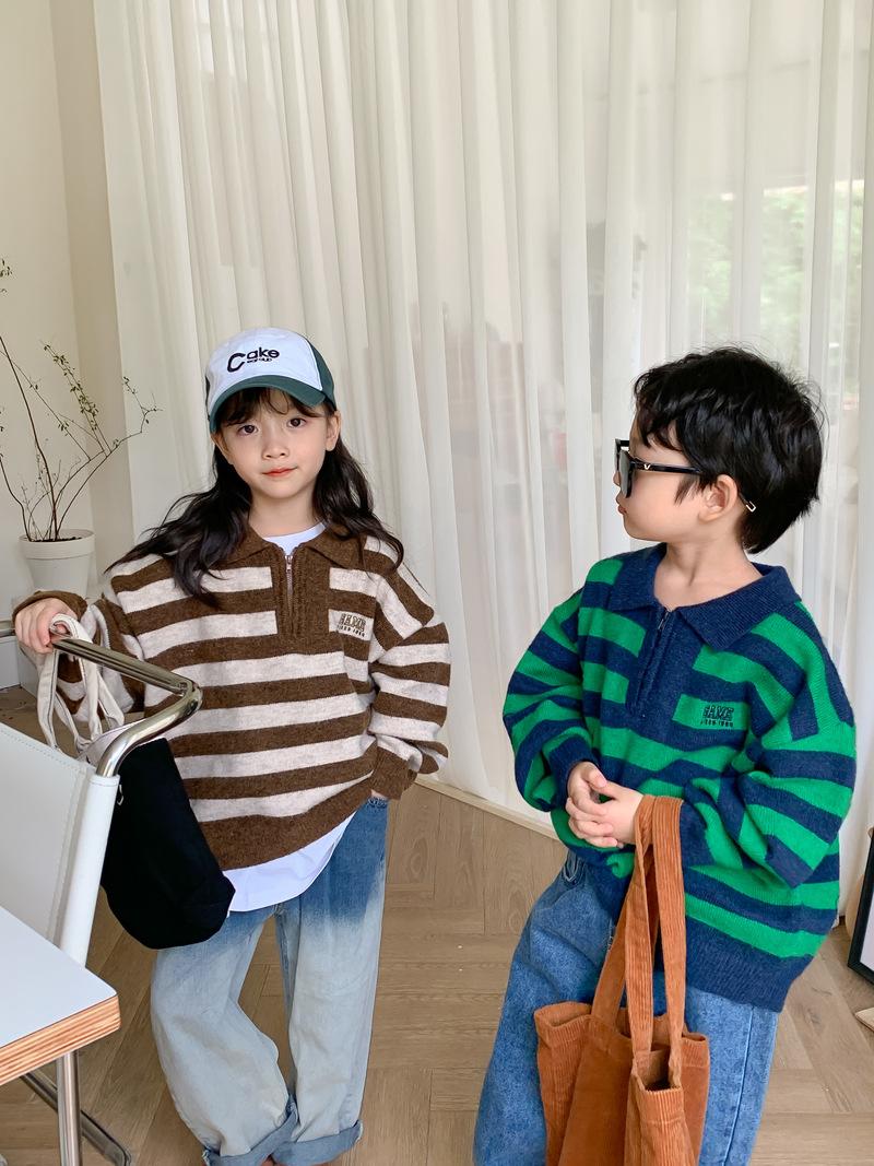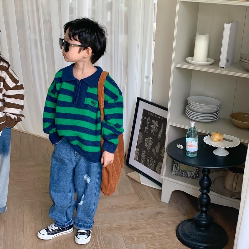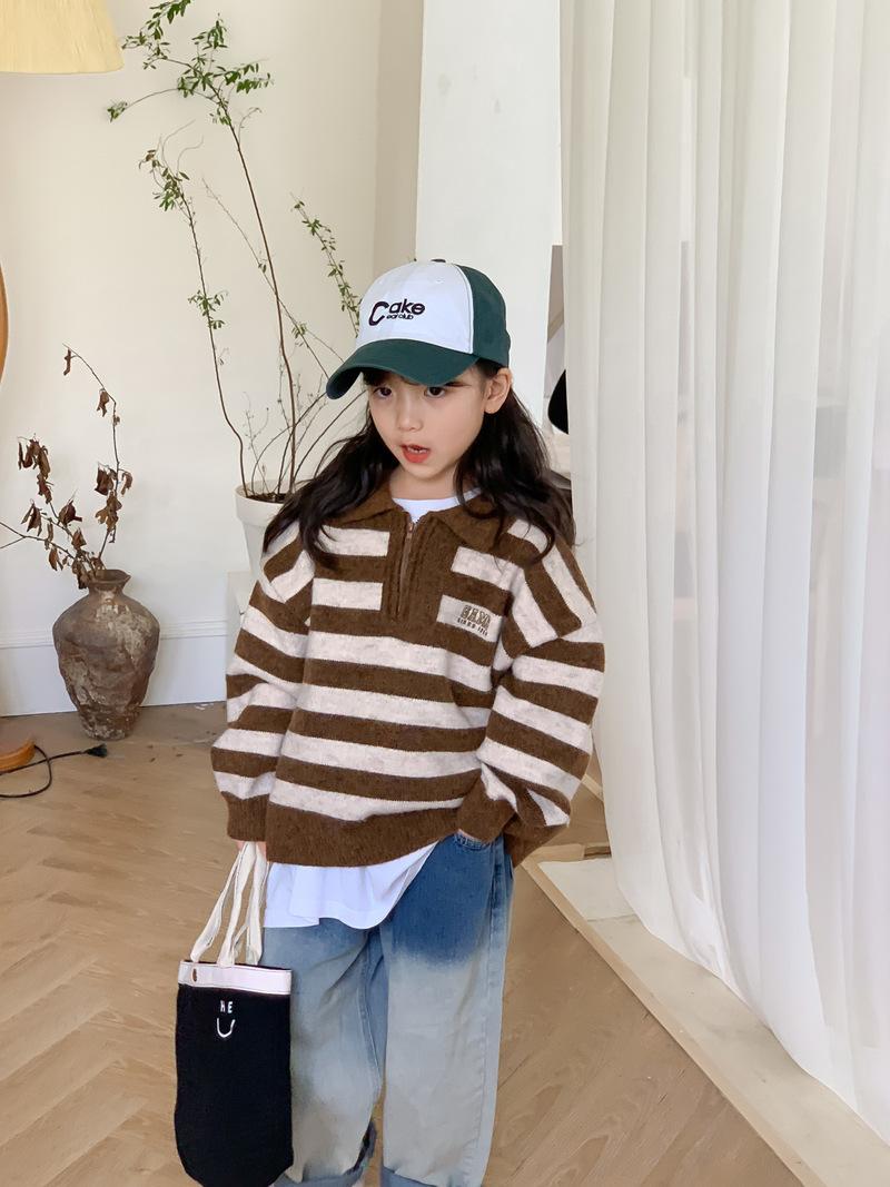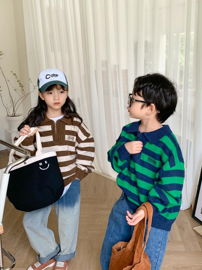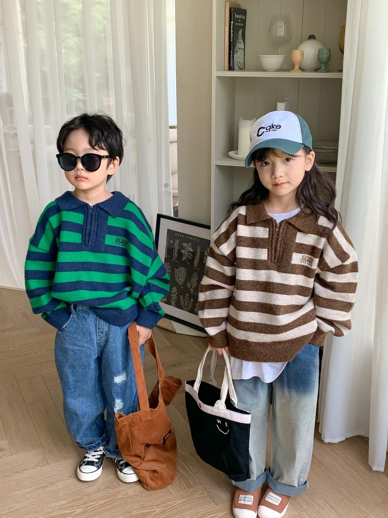 Suéter Infantil 2025 Outono Estilo Coreano Listrado Zíper para Meninos e Meninas Infantil Gola Polo Bordado Tricotado Pulôver