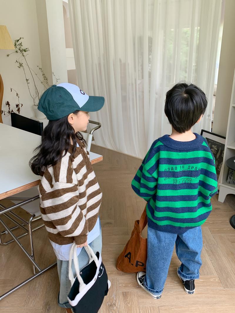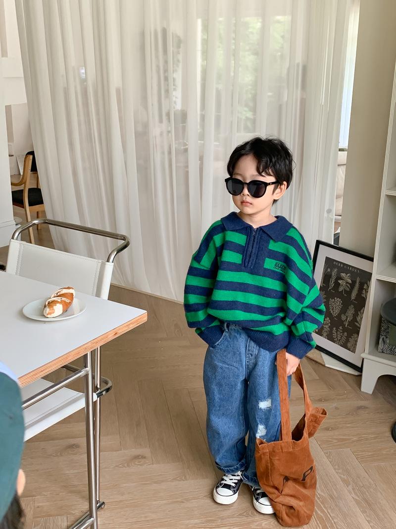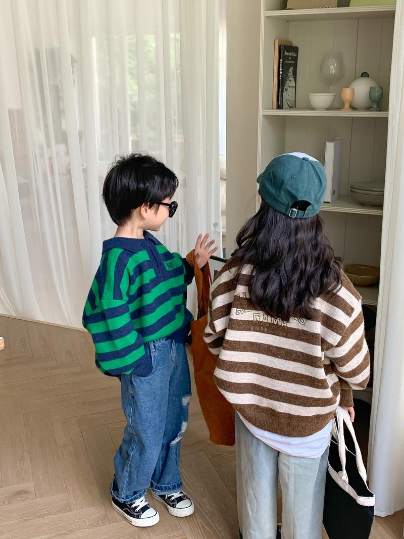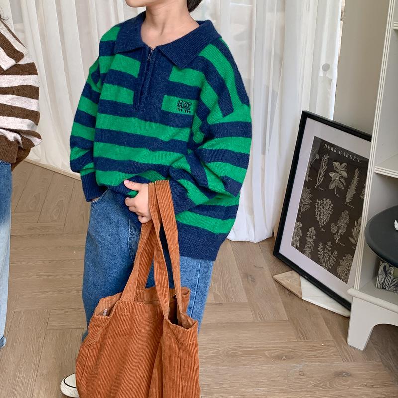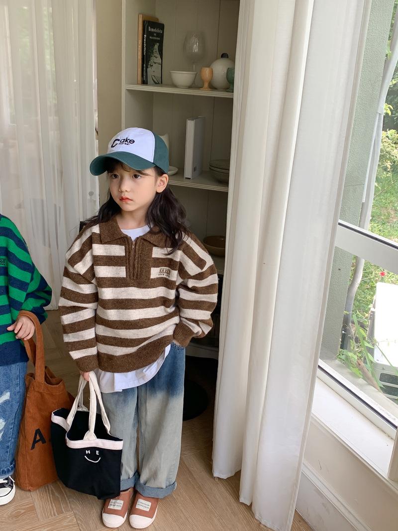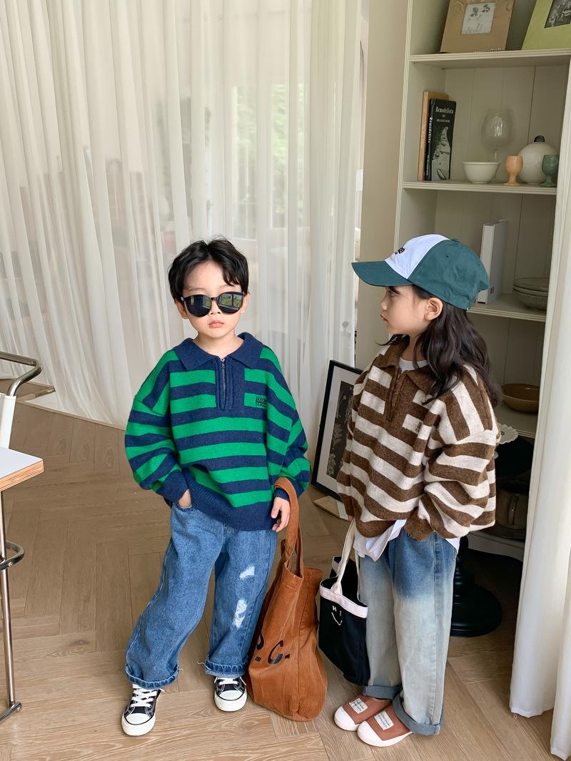 Suéter Infantil 2025 Outono Estilo Coreano Listrado Zíper para Meninos e Meninas Infantil Gola Polo Bordado Tricotado Pulôver