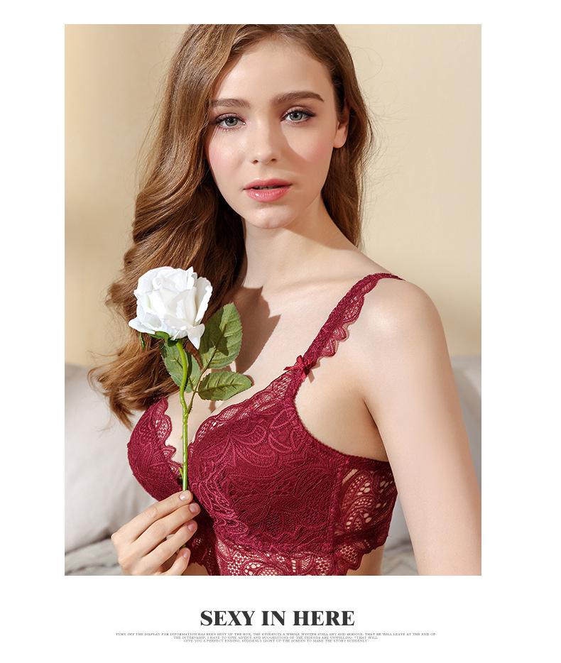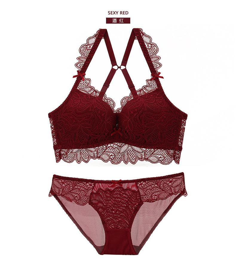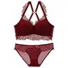 | Conjunto de sujetador de encaje rojo sexy europeo y americano nuevo de otoño e invierno, sujetador de ropa interior push-up fruncido con bordado hueco |