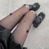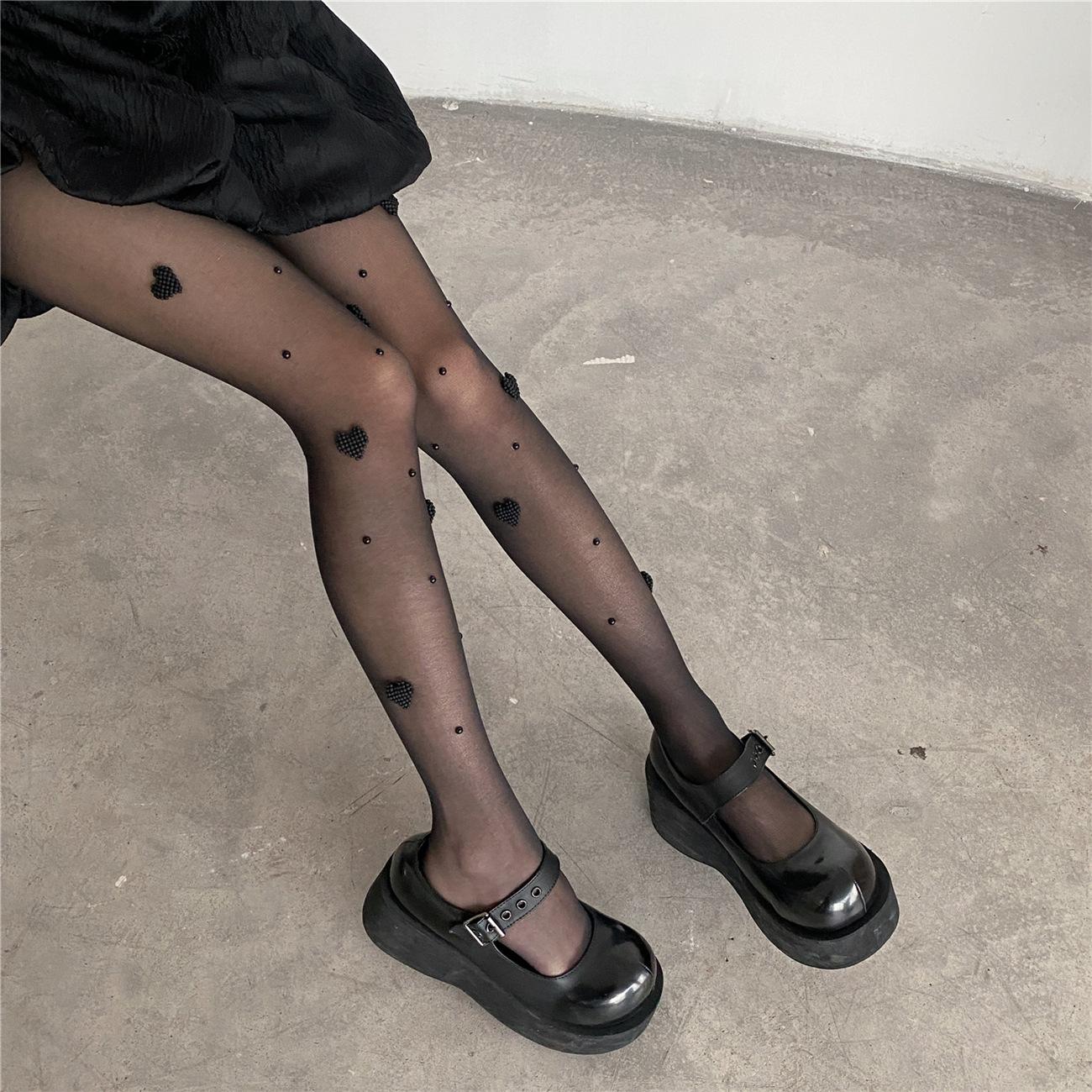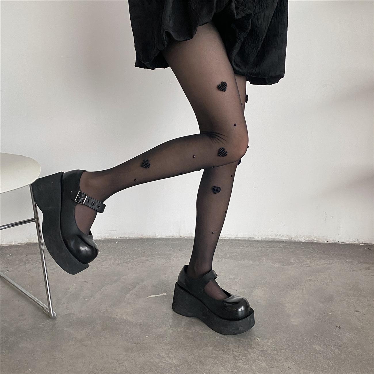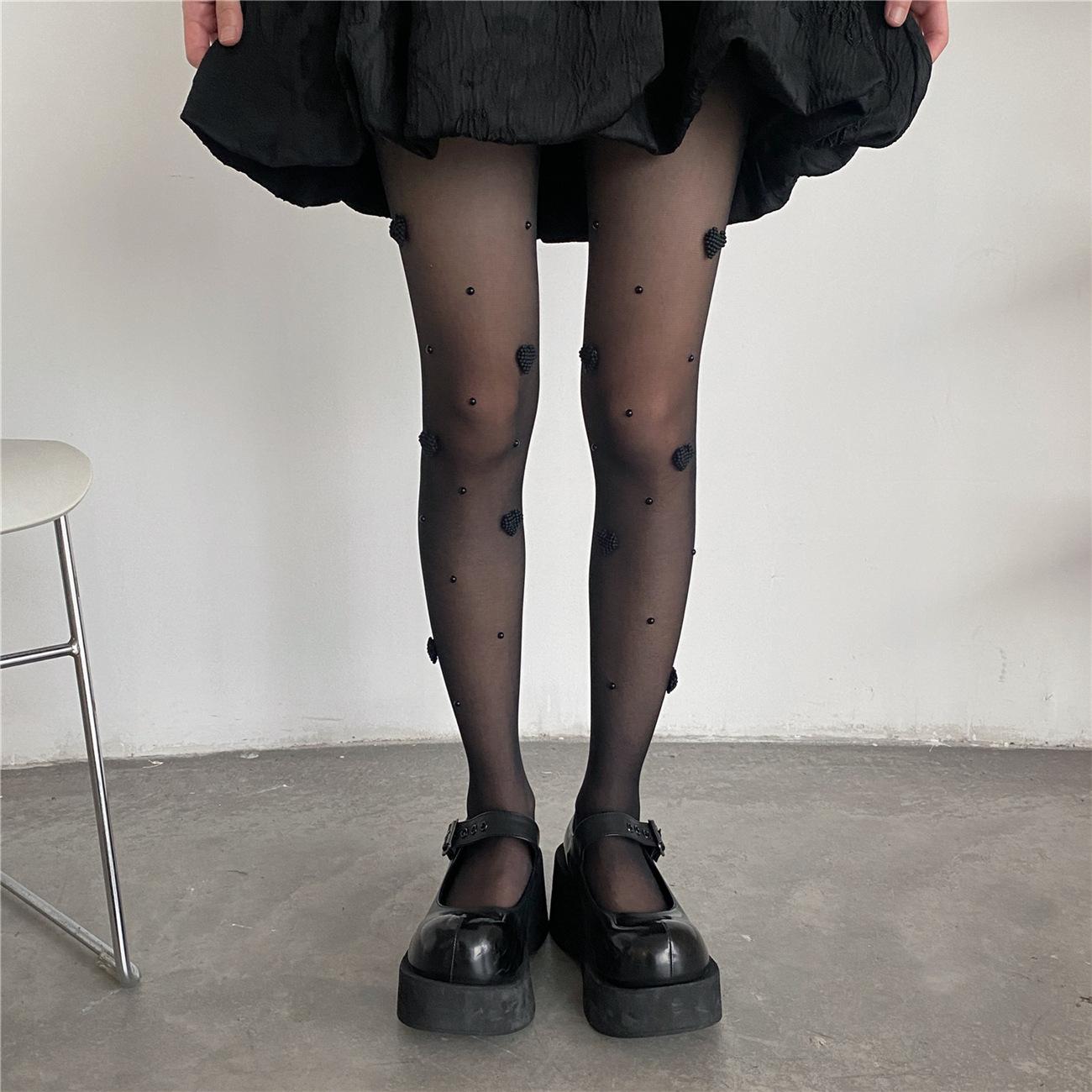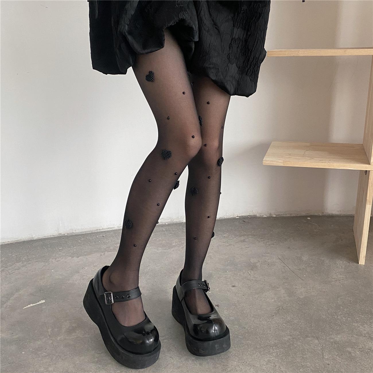 Calcetines de seda negros de una pieza con diseño de perla Love, sexys, estilo Lolita Academy, con corte arbitrario.