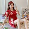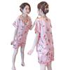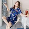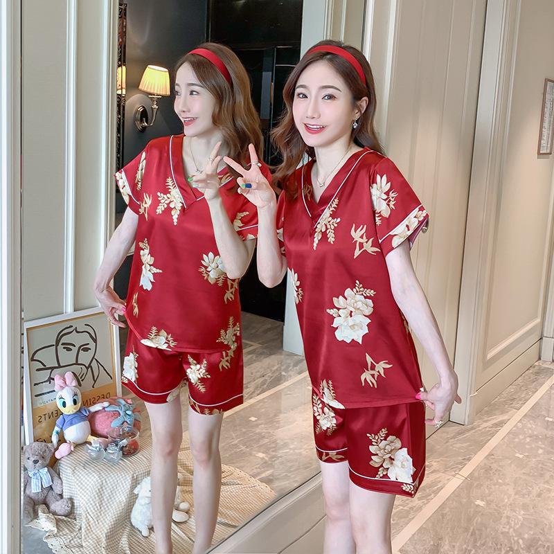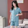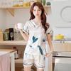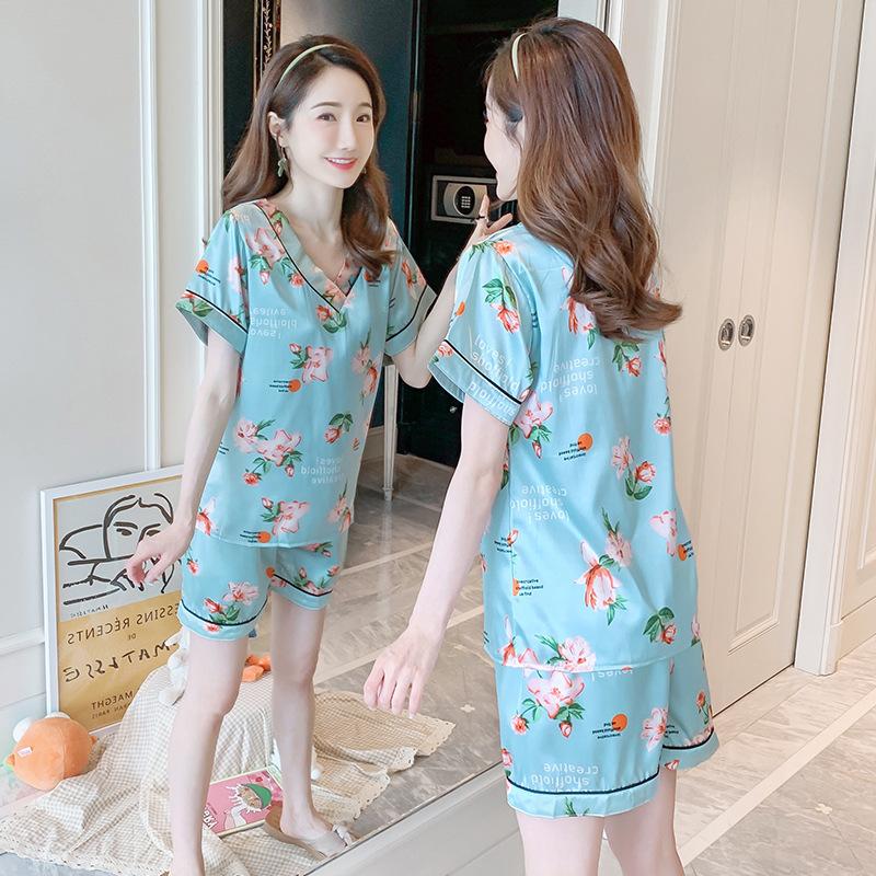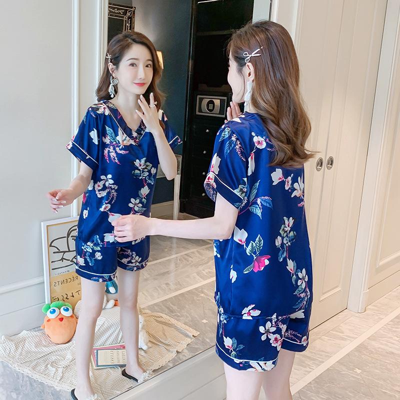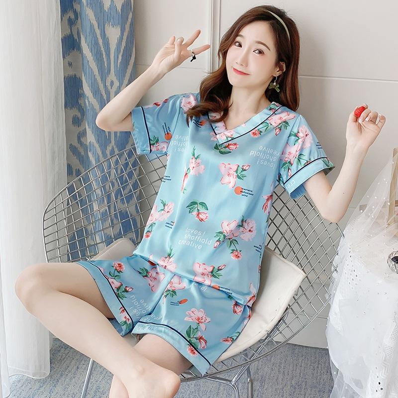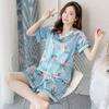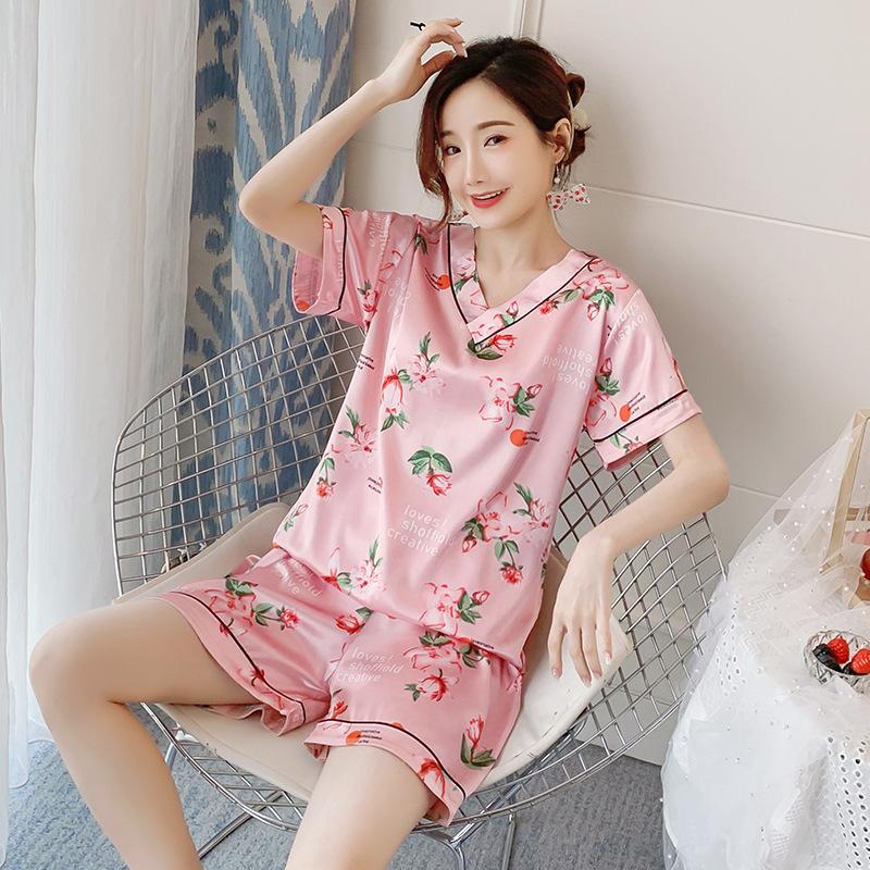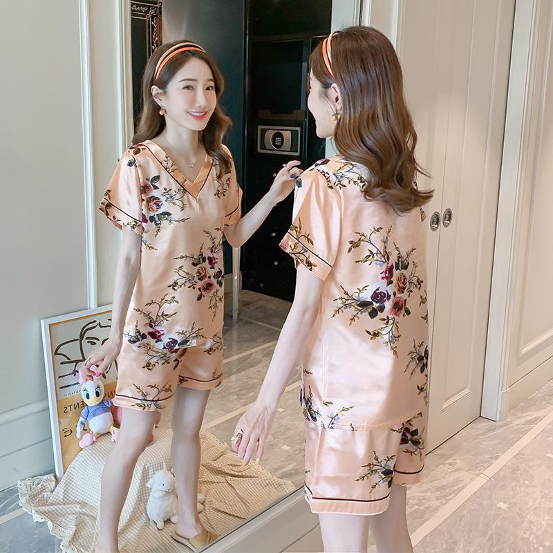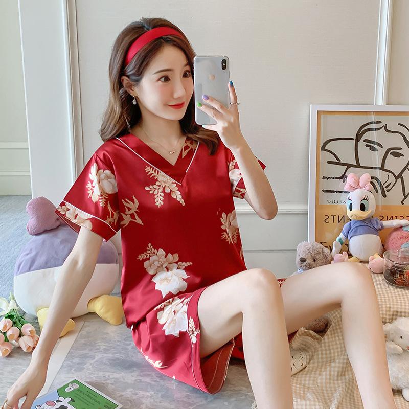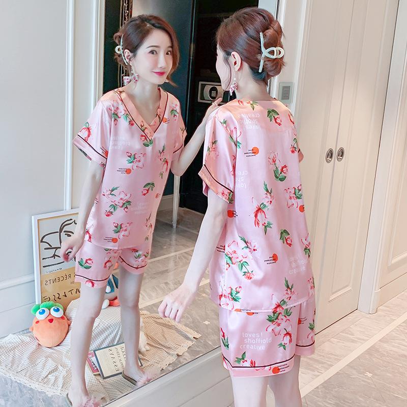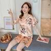 Pijama de Seda de Hielo con Cuello en V de Manga Corta Delgada Moderna para Mujer de Imitación de Seda Satén Shorts Dulce Conjunto de Dos Piezas Jersey