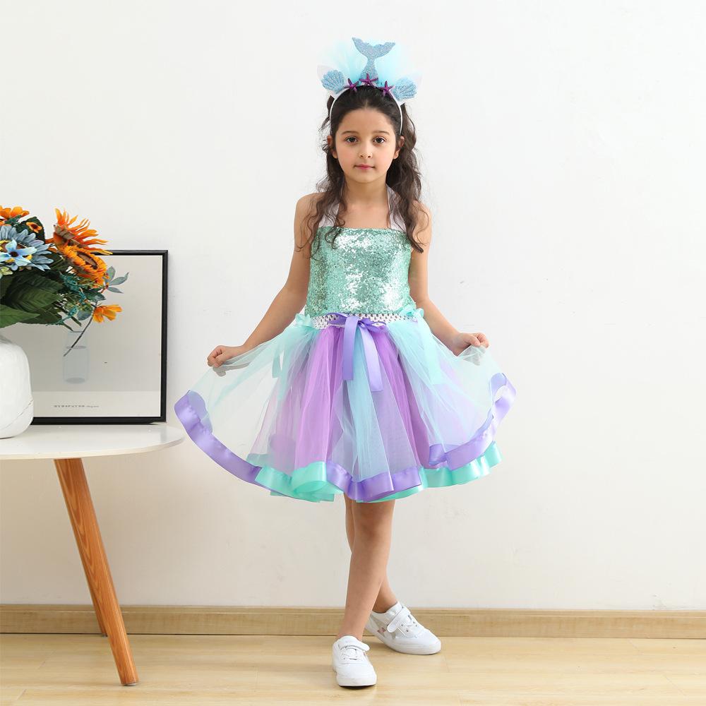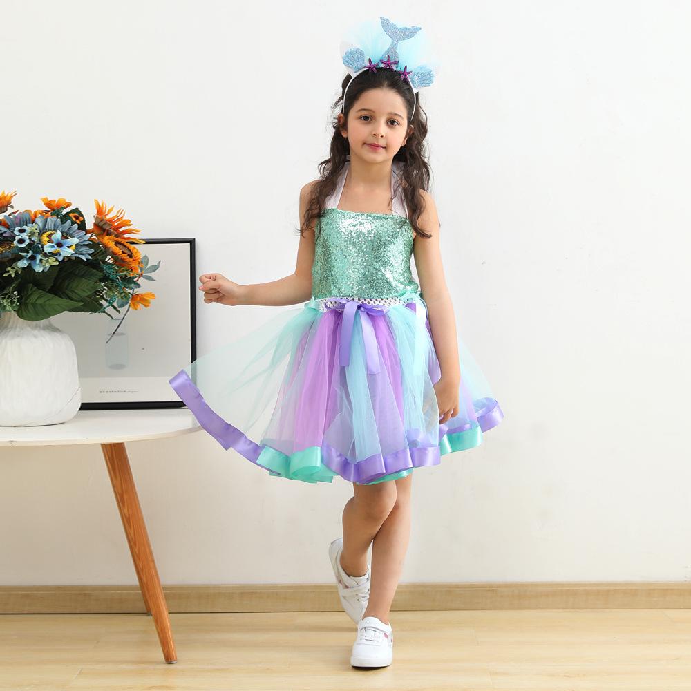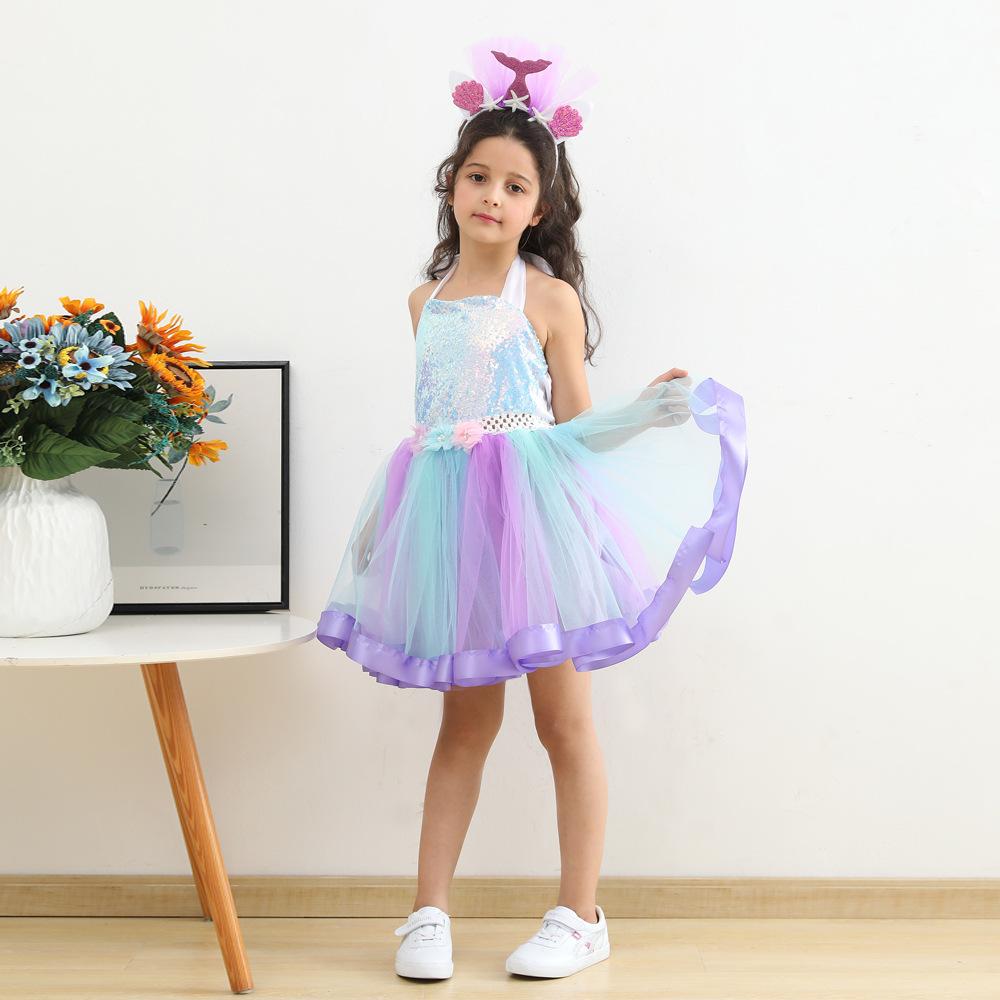 2023 nueva ropa infantil, vestido de sirena para niña, falda tutú con lazo y forro, vestido de princesa con cuello halter para niña