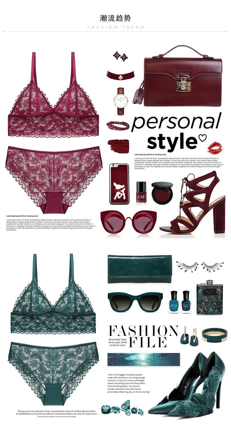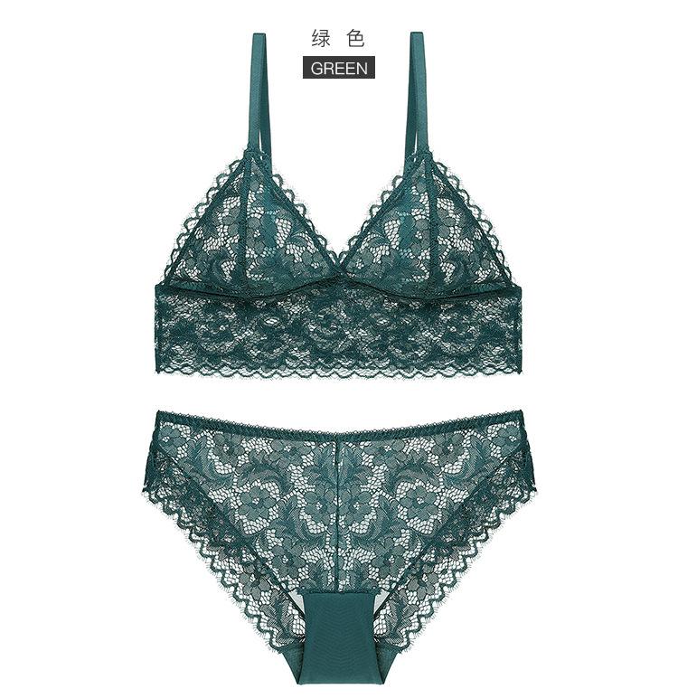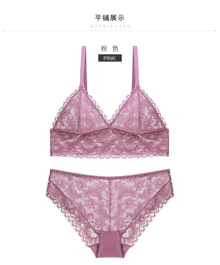 Venta al por mayor de ropa interior de encaje sexy de estilo francés para mujer, sin aros de acero, conjunto de sujetador ultrafino y cómodo sin aros.