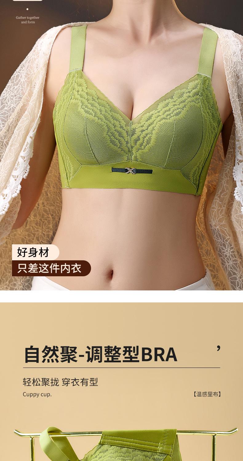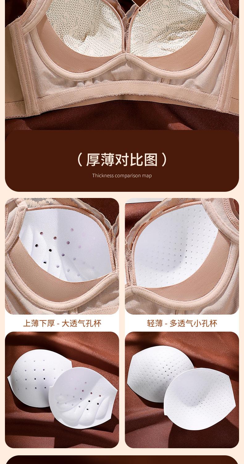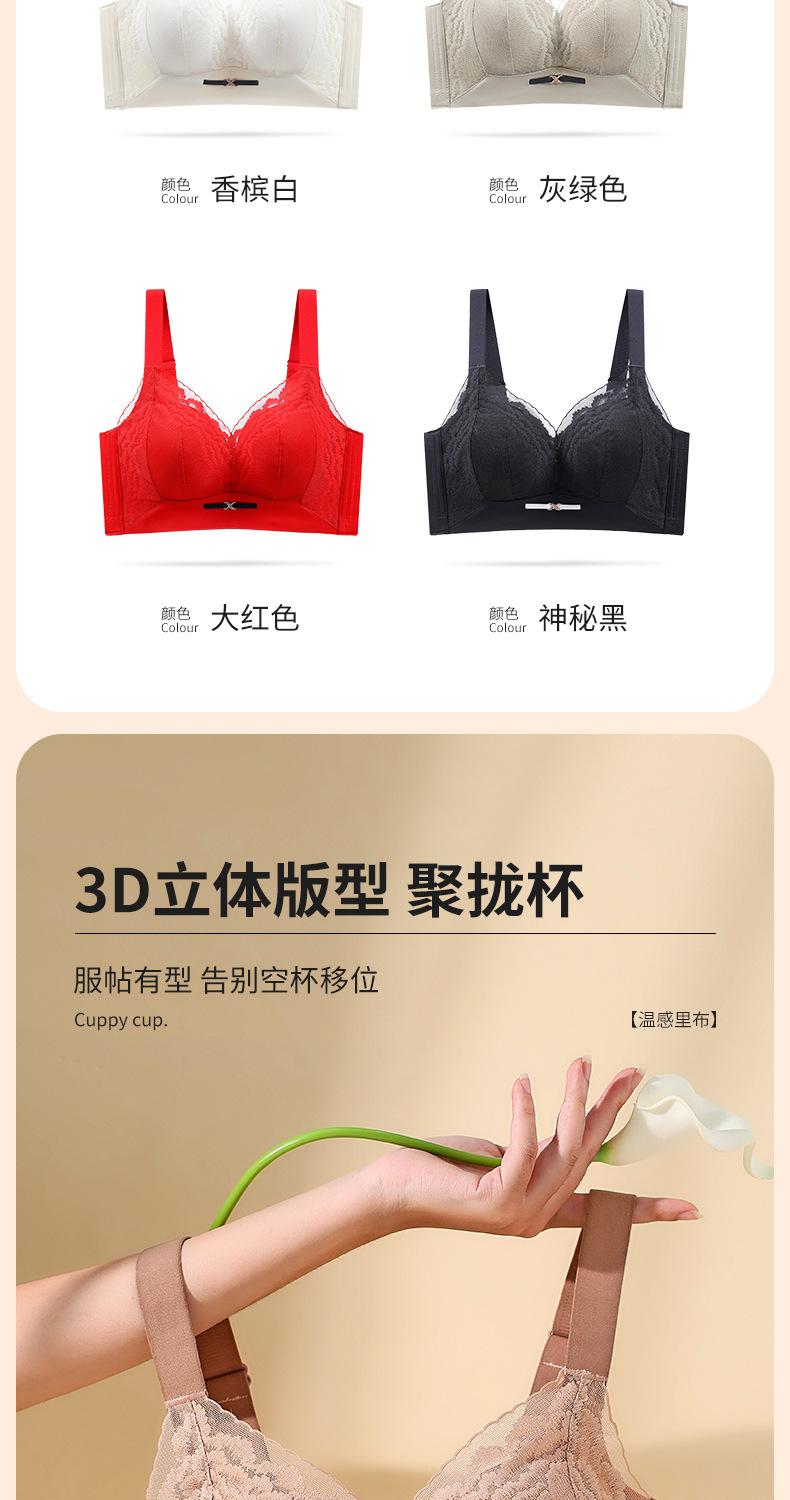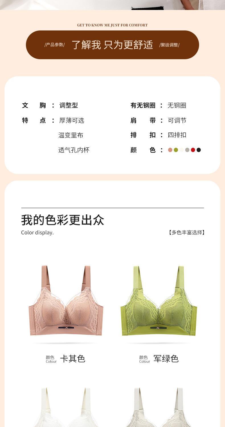 Este es un producto tejido con diseño de encaje. Está disponible en copas medianas-gruesas 32-38 AB y copas delgadas 34-40 BC en seis colores: negro/rojo/gris claro/marrón rosado/verde/blanco. Tirantes fijos y ajustables antideslizantes de 2.5 cm de ancho, tejidos de las alas que se pueden cortar a voluntad, cuatro filas de botones en la espalda, solo una pieza, sin ropa interior a juego.