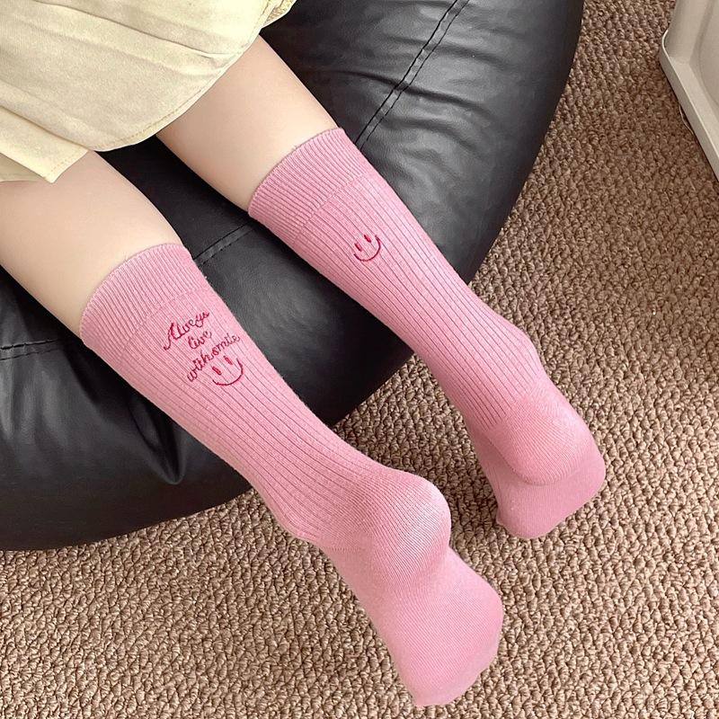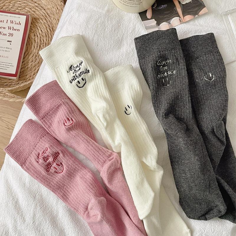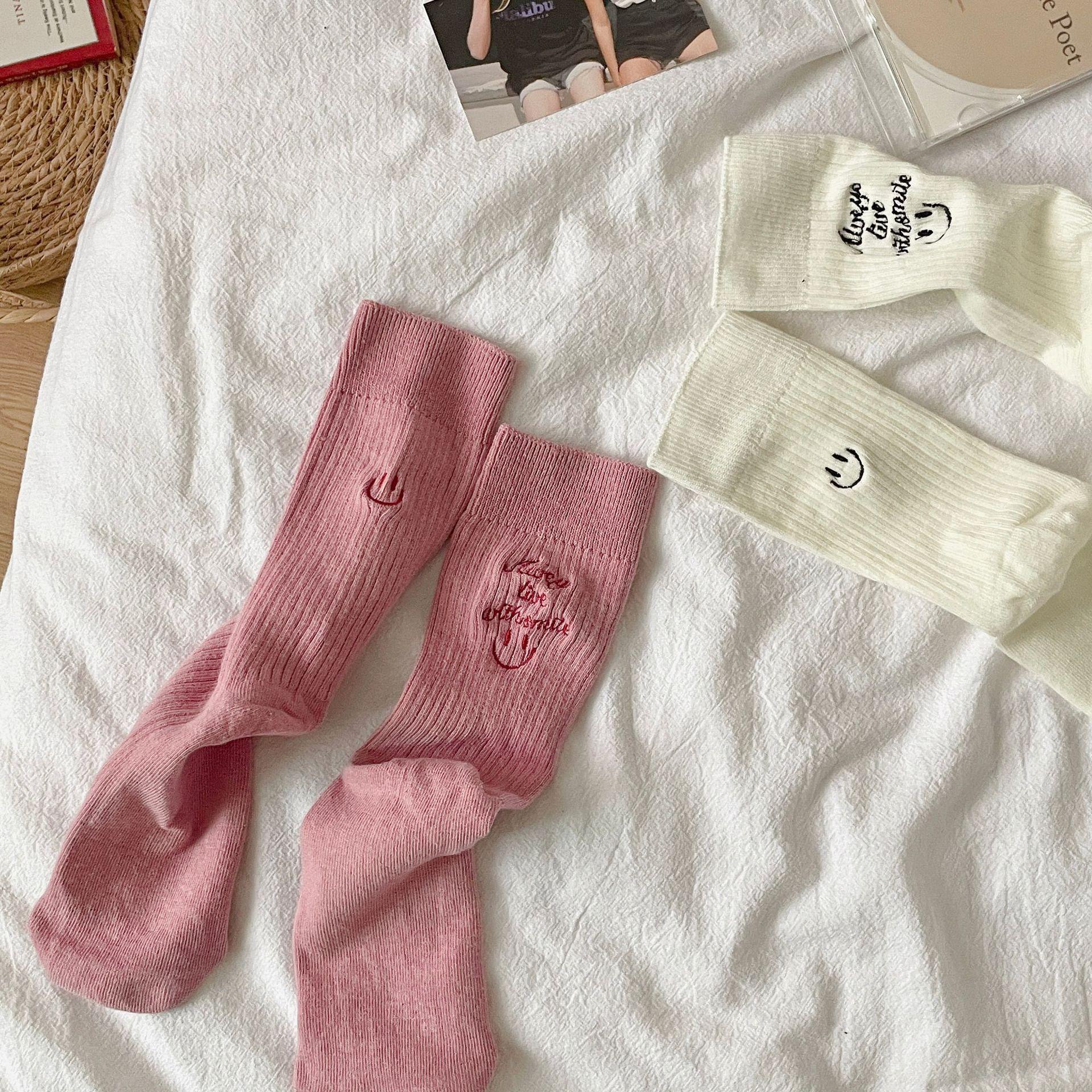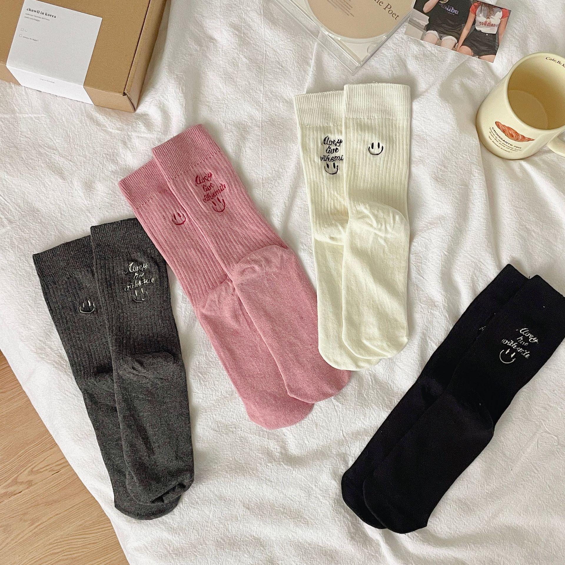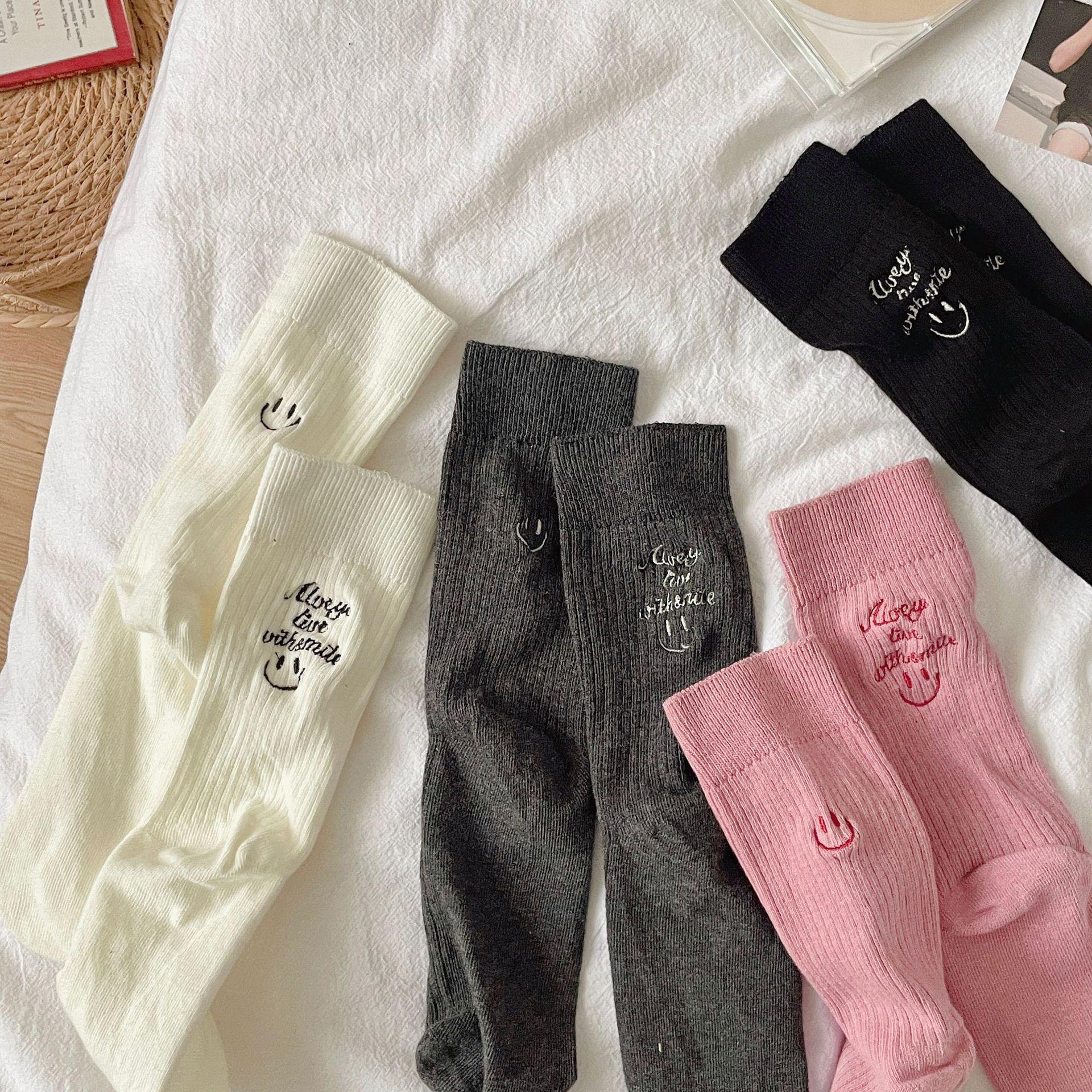 Calcetines de algodón hasta media pantorrilla para mujer, bonitos calcetines bordados de color sólido estilo AB con cara sonriente, calcetines para uso exterior, venta al por mayor
