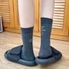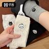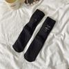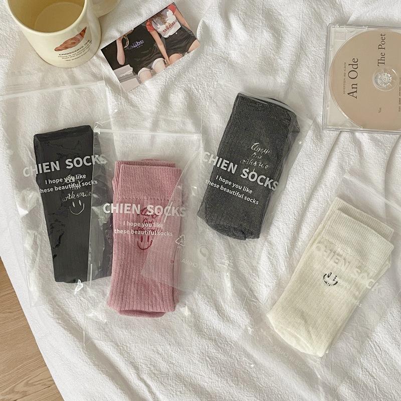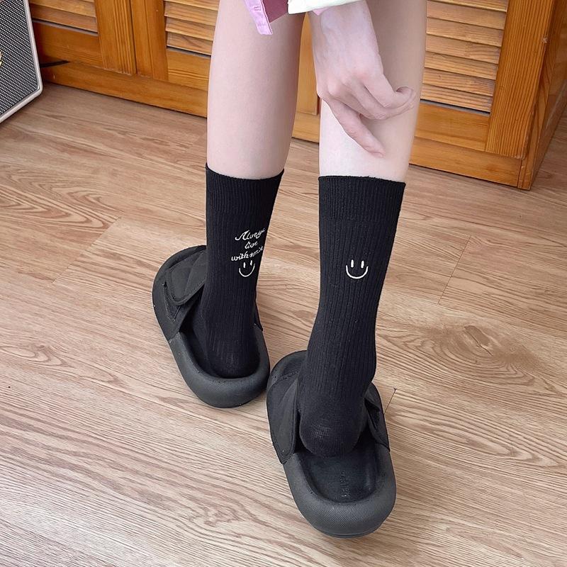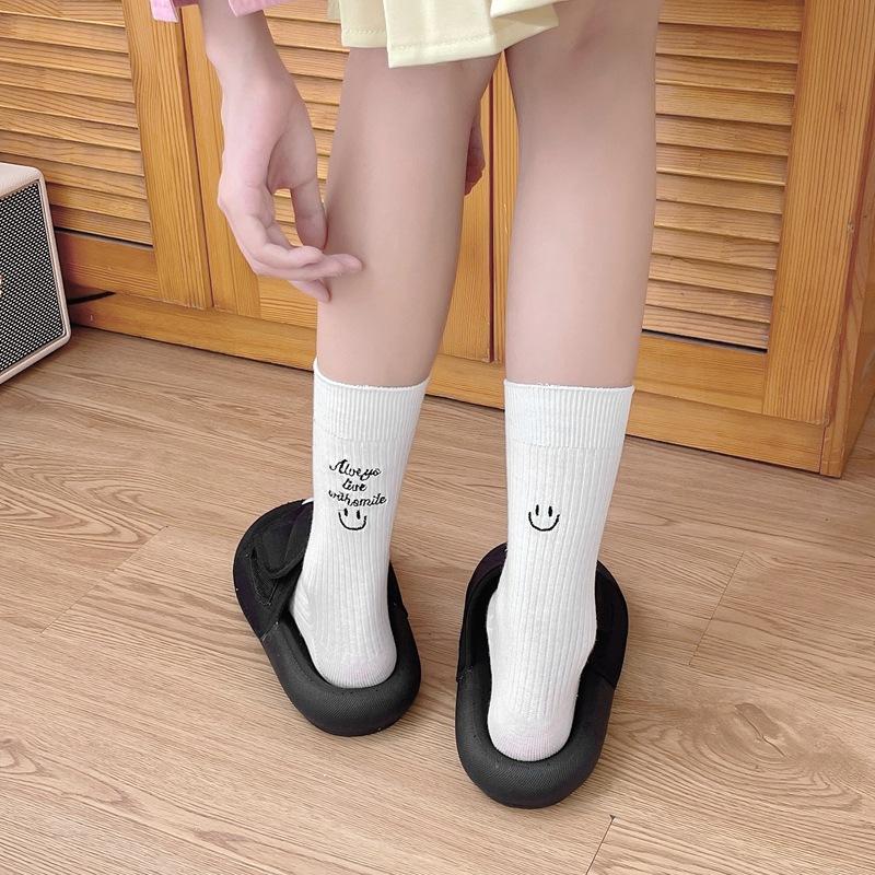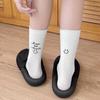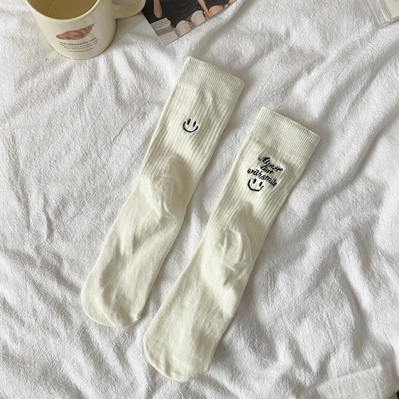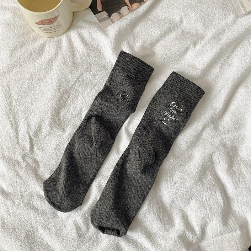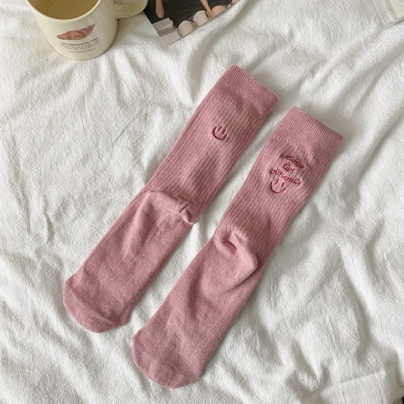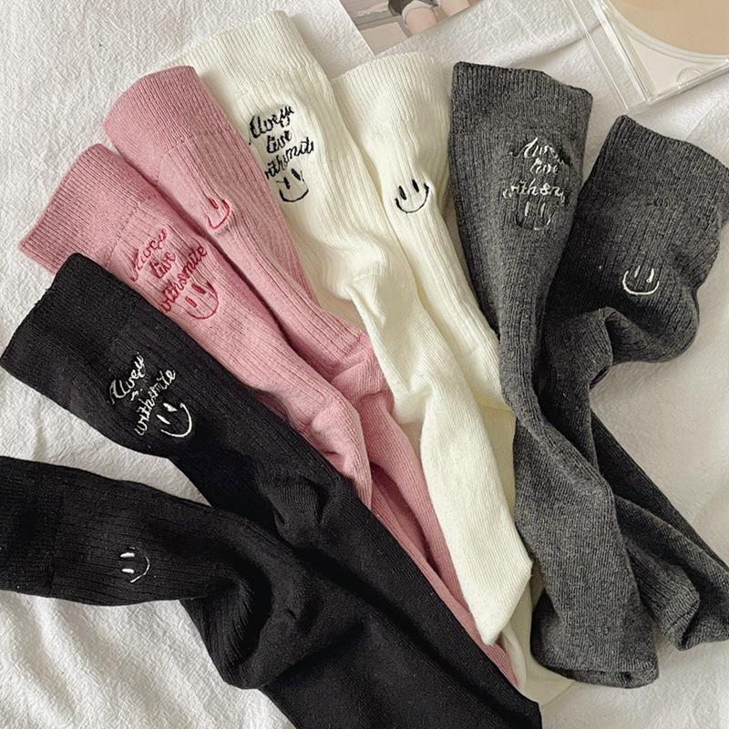Calcetines de algodón hasta media pantorrilla para mujer, bonitos calcetines bordados de color sólido estilo AB con cara sonriente, calcetines para uso exterior, venta al por mayor