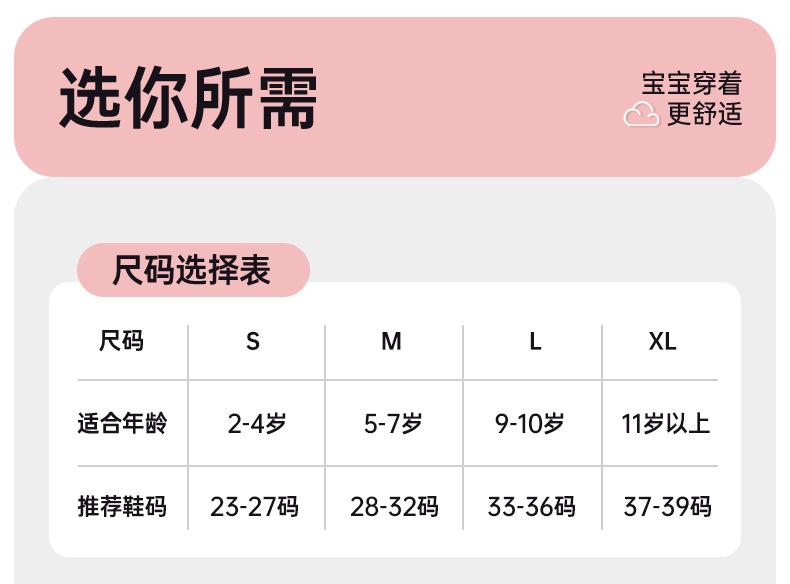 S [2-4 years old], M【5-7 years old】, L【9-10 years old】, Xl [over 11 years old]