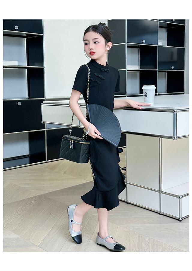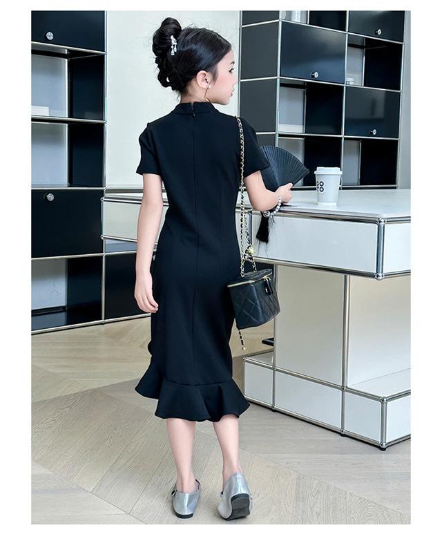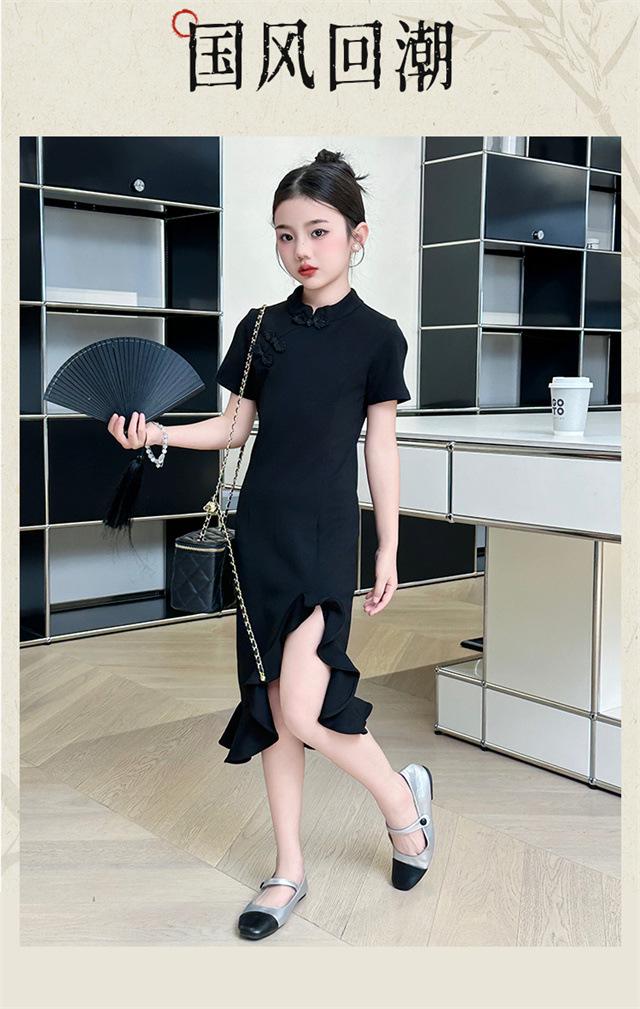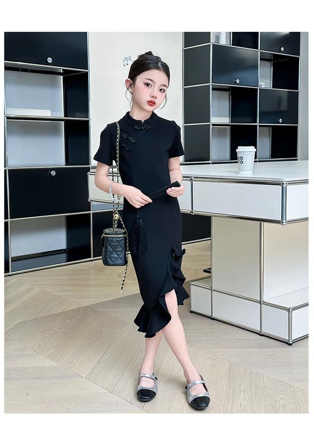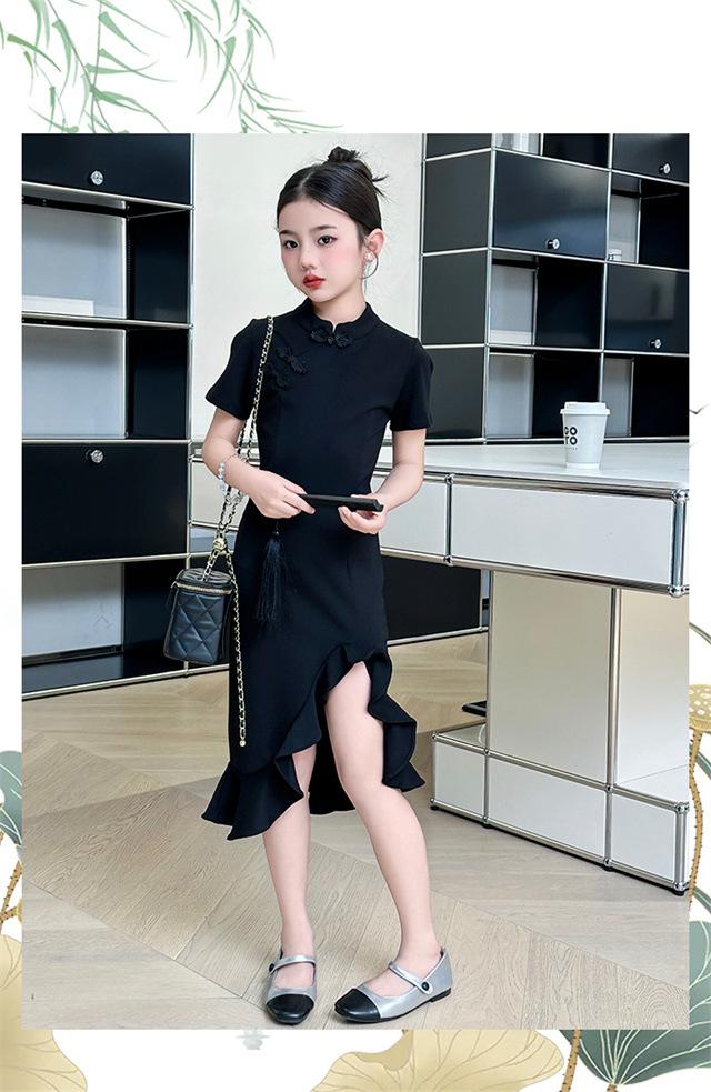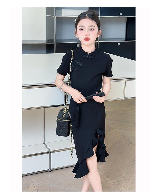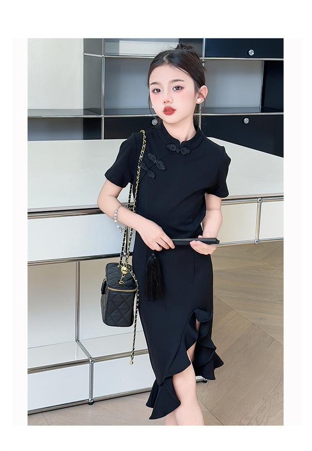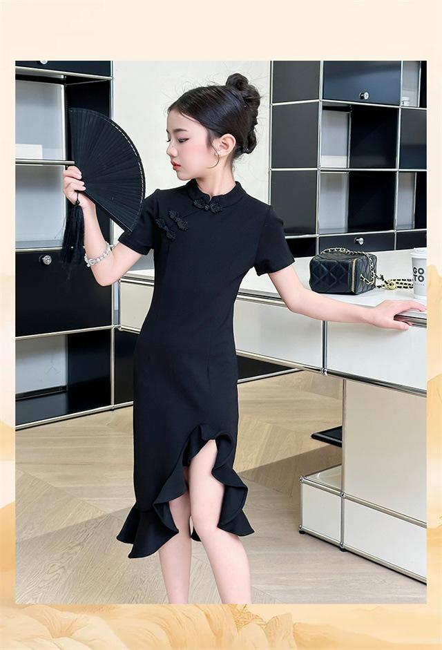 Vestido de Verano para Niñas Nuevo Cheongsam Chinoiserie Mejorado Negro Cintura Entallada Diseño Nicho Retro Elegante Cola de Pescado Cadera
