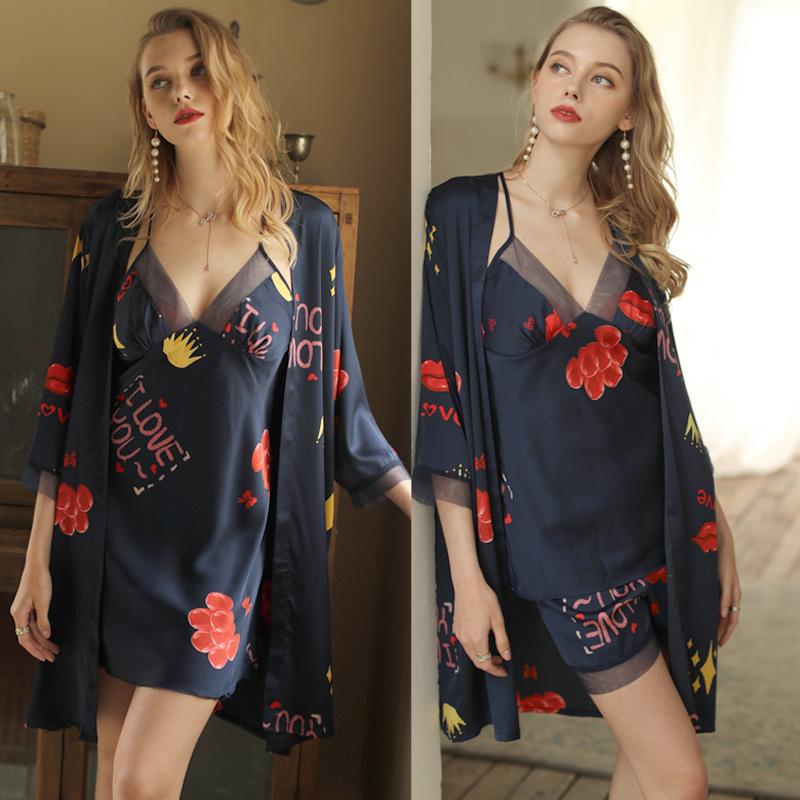 Primavera y verano nuevo otoño con almohadilla para el pecho pijamas cortos de tirantes camisón sexy para mujer camisón pijama de seda de simulación de cuatro piezas