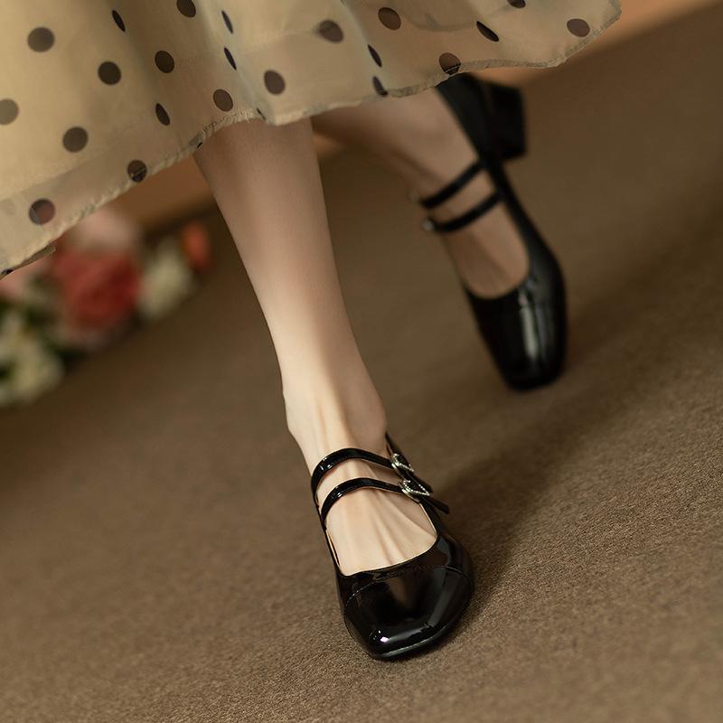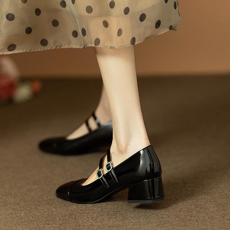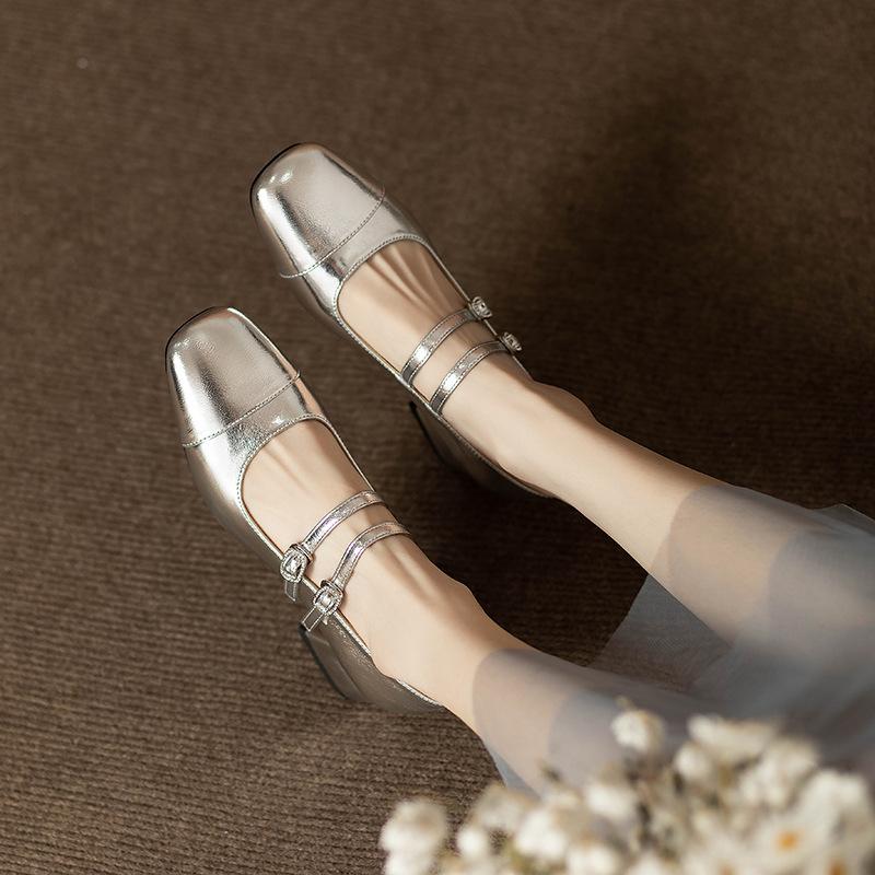 Zapatos Mary Jane plateados retro versátiles de cuero genuino para mujer primavera y otoño 2023 tacón grueso hebilla única boca poco profunda tacón medio zapatos individuales