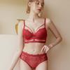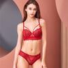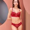 | Conjunto de sujetador de encaje rojo sexy europeo y americano nuevo de otoño e invierno, sujetador de ropa interior push-up fruncido con bordado hueco |