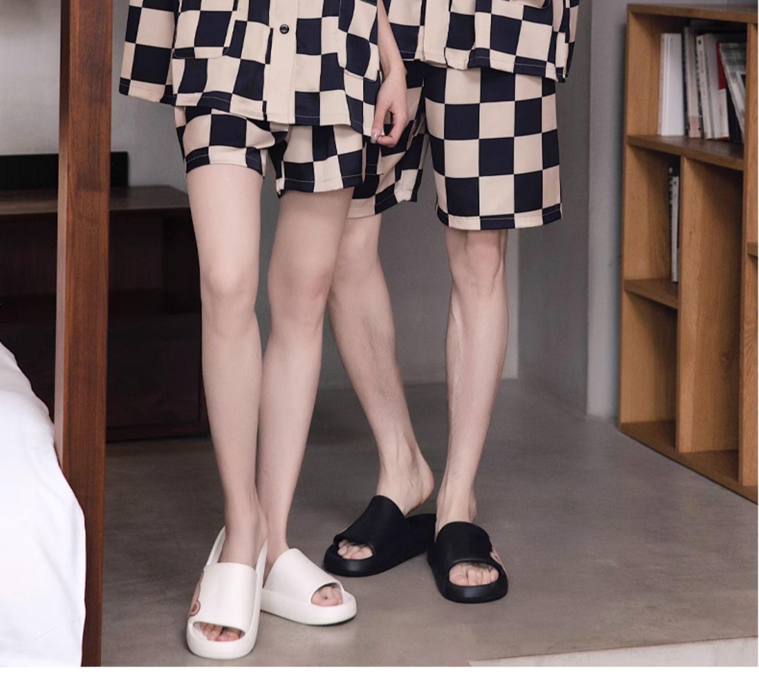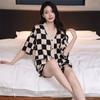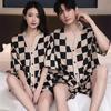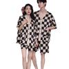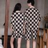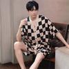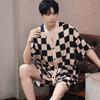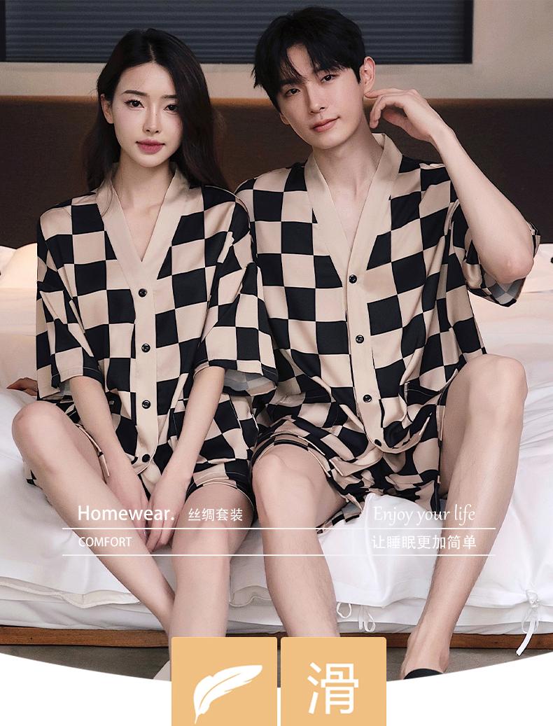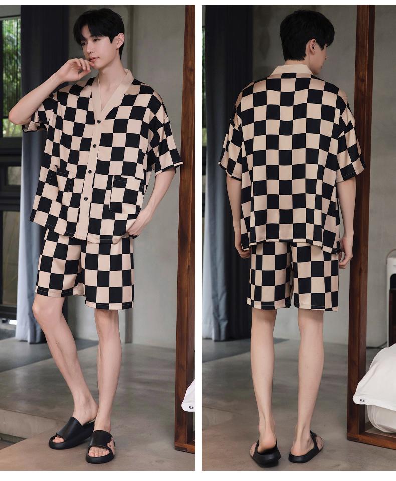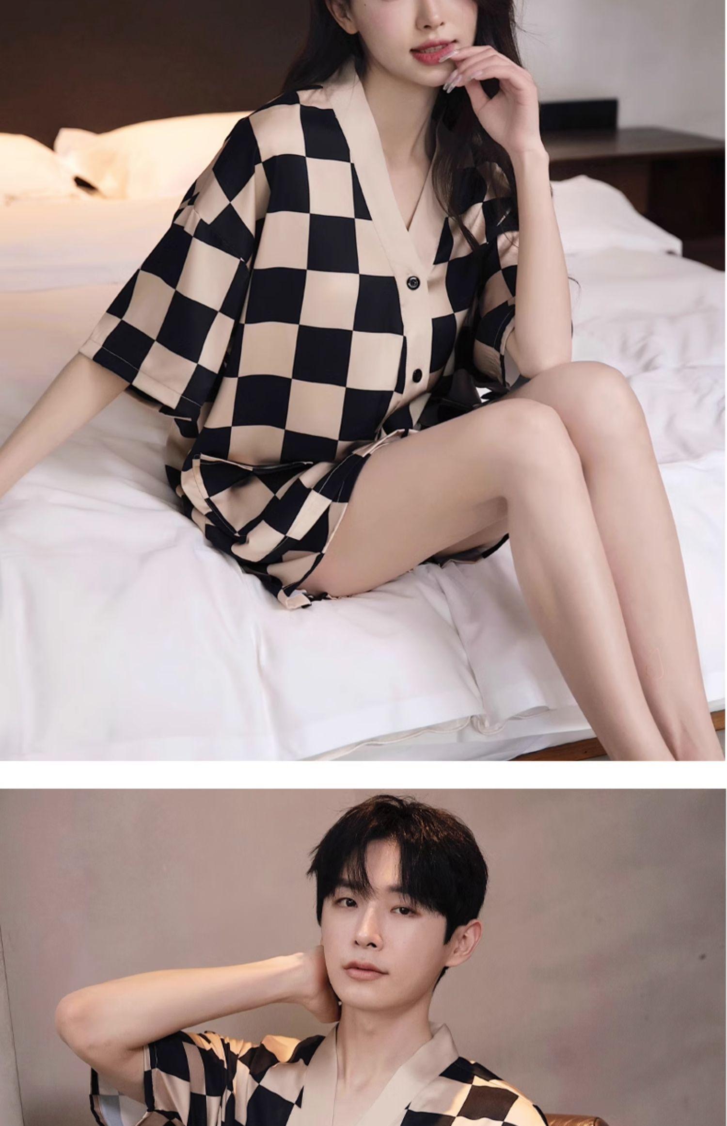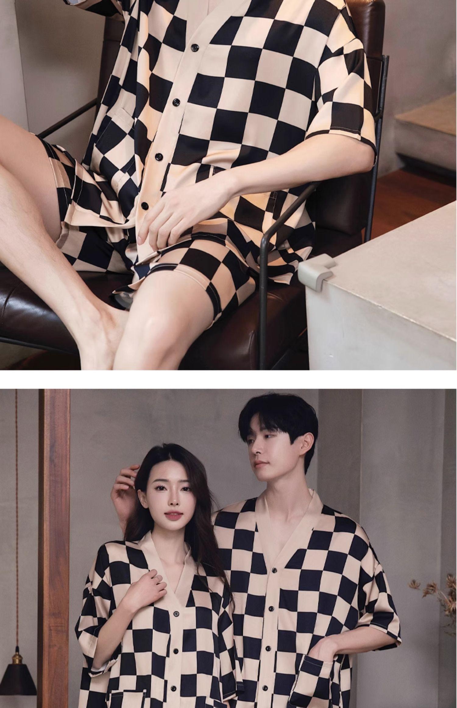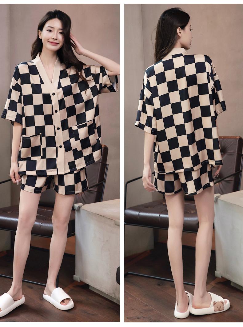 Pijama fino de verano para mujer, de seda helada, de manga corta, con cuello en V y cuadros, elegante para hombre.