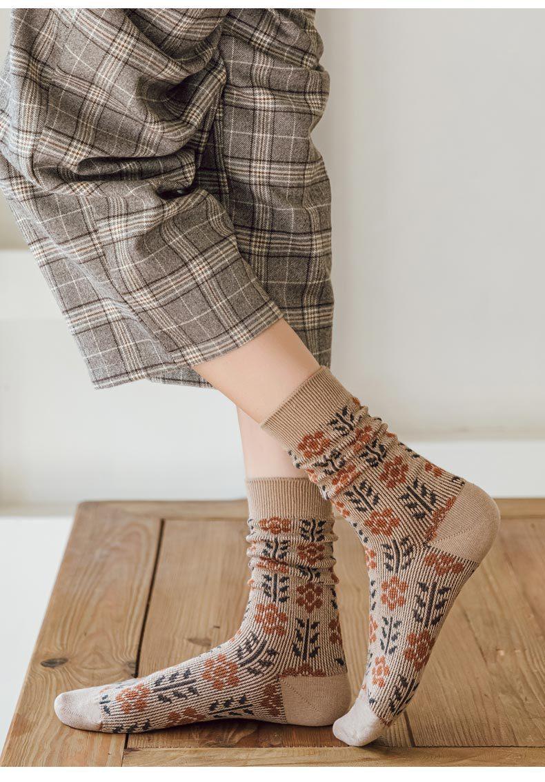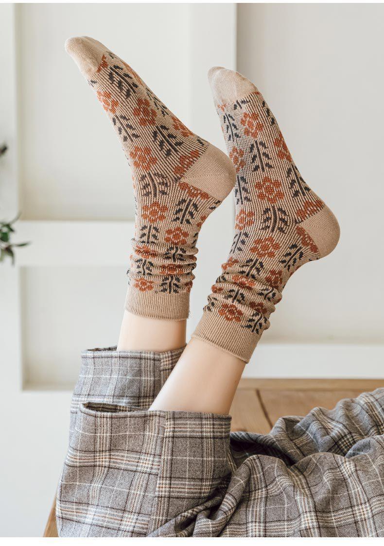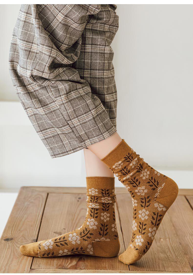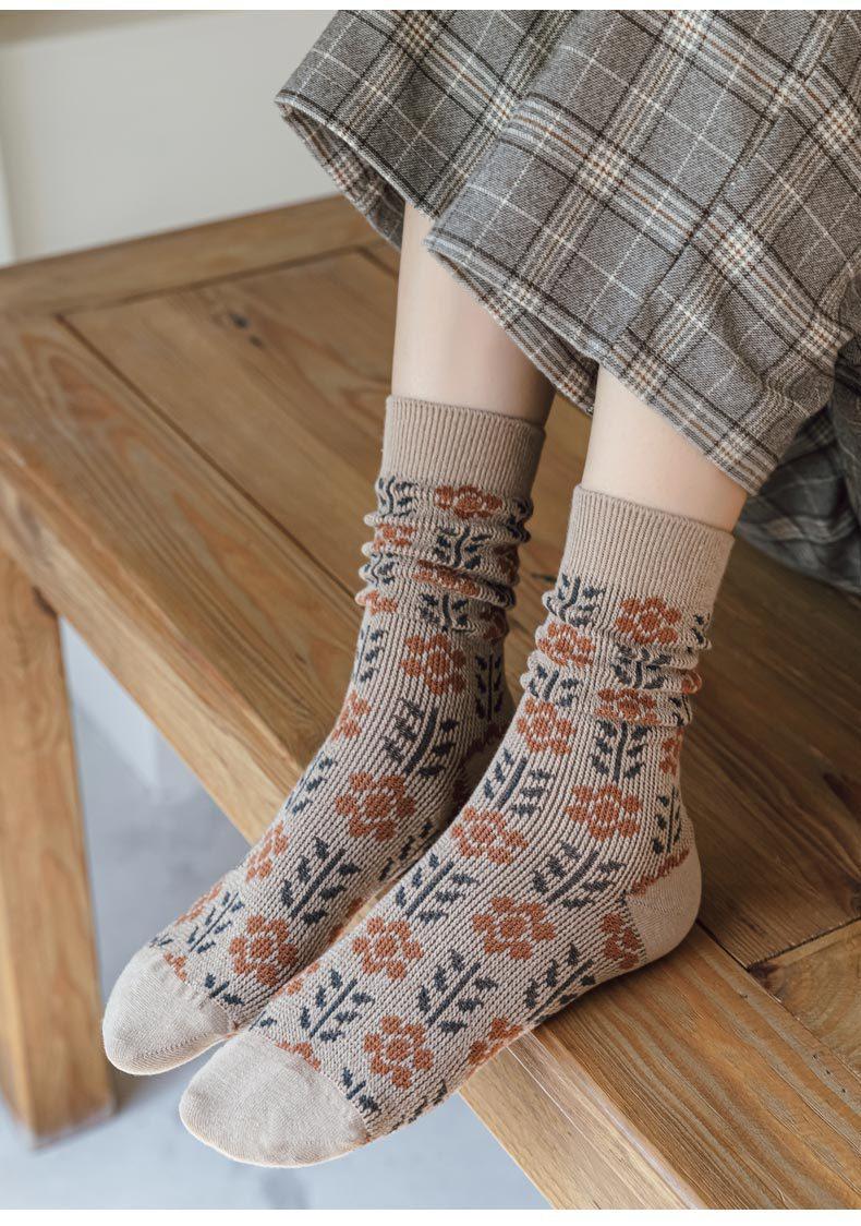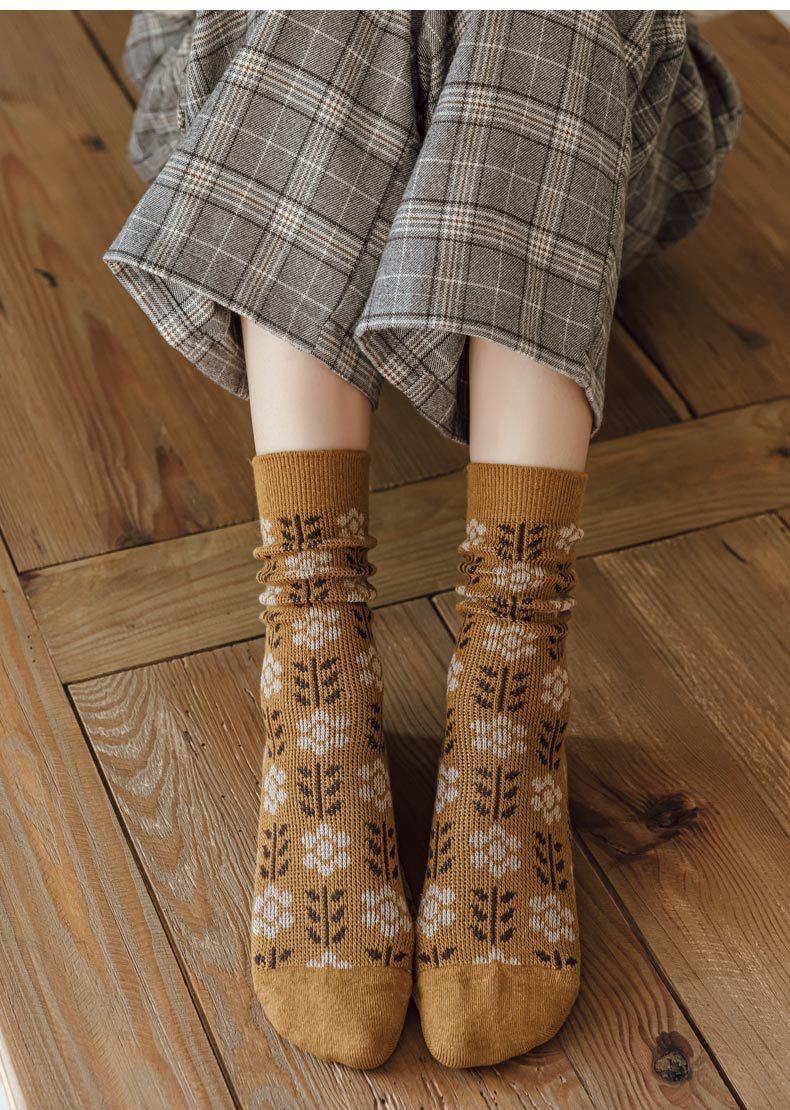 Calcetines Caqui para Mujer Primavera y Otoño Calcetines de Media Caña Algodón Puro Estilo Francés Retro Calcetines Largos de Algodón Doble Aguja Calcetines Acolchados