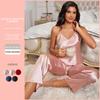 Pijama de seda fina de hielo para otoño e invierno para mujer, pantalones con tirantes, informal, holgado, de color sólido, sin mangas