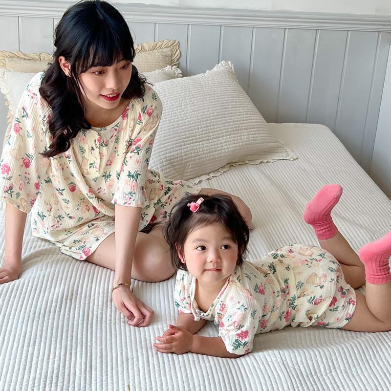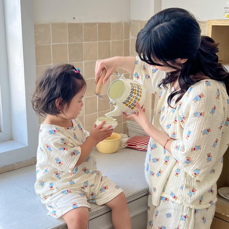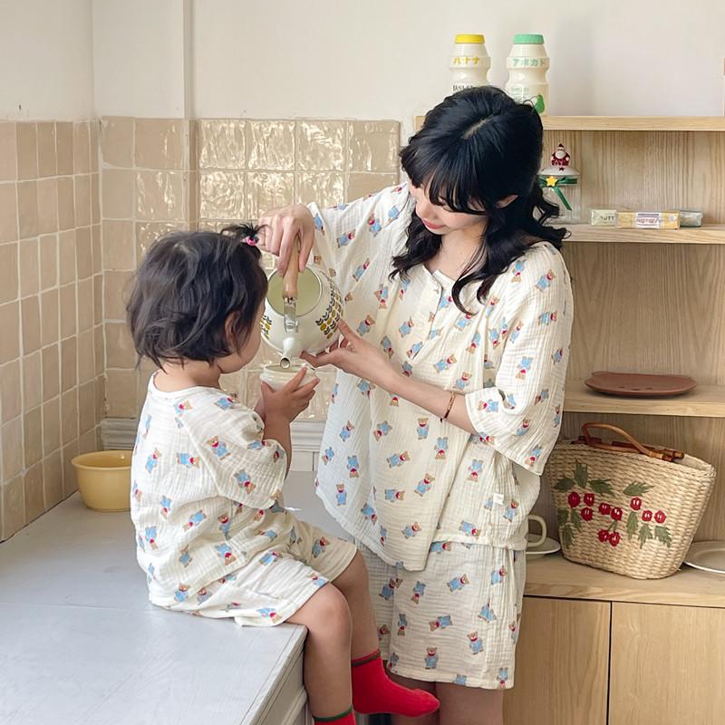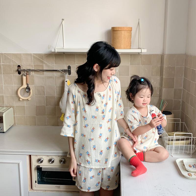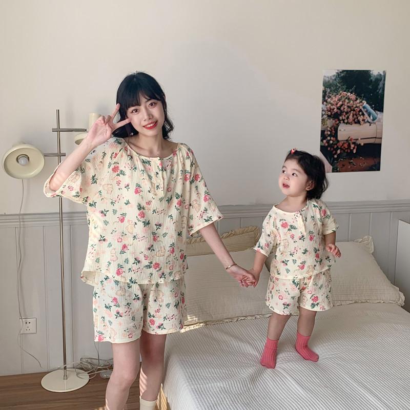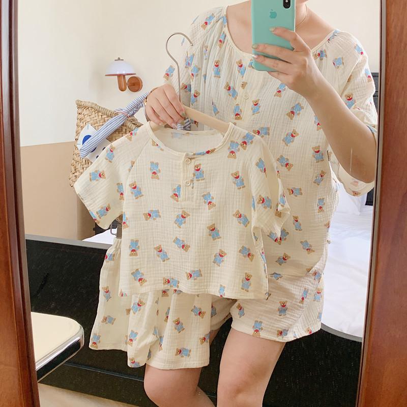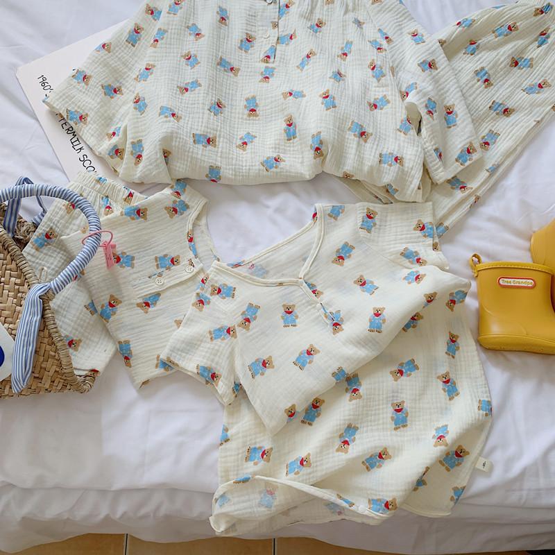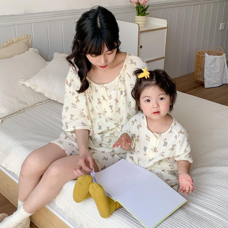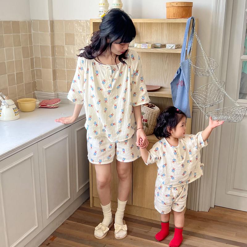 Pijamas Familiares a Juego para Niños, Conjunto de Gasa de Algodón para Estar en Casa, Verano 2024 Pantalones Cortos de Manga Corta, Niños y Niñas, Se Puede Usar Afuera