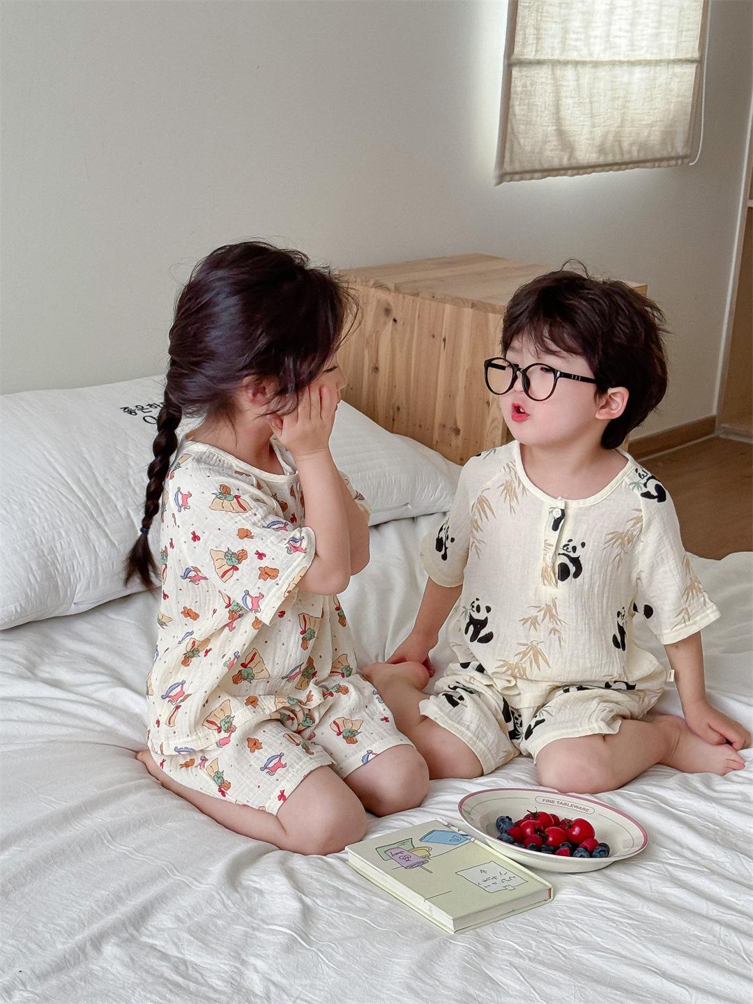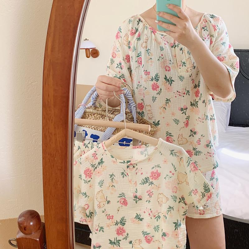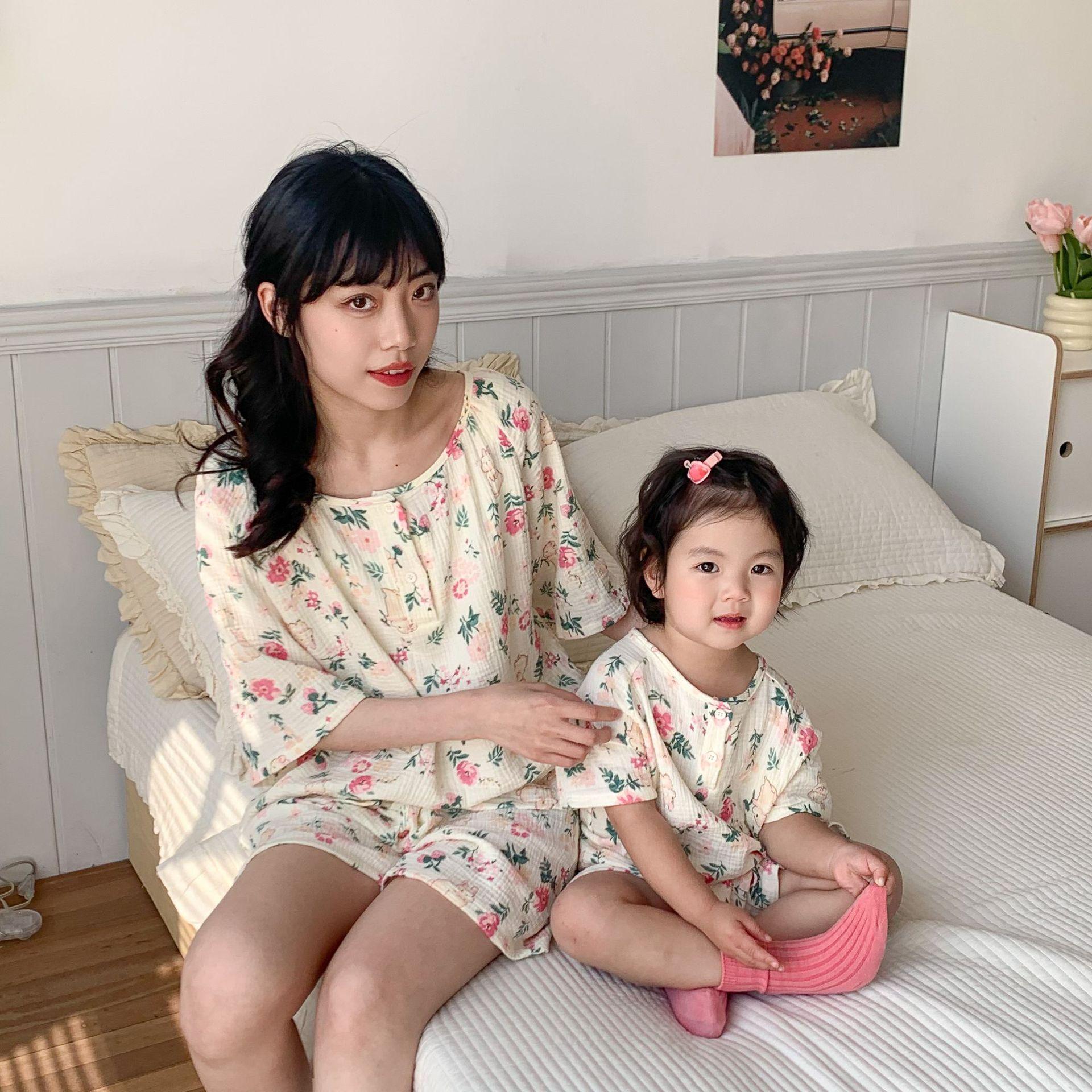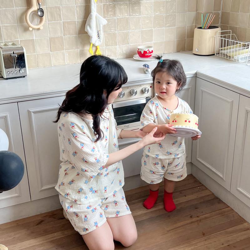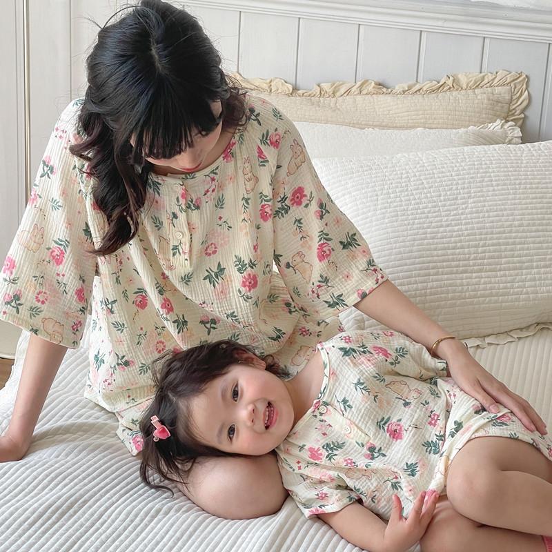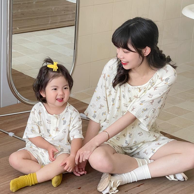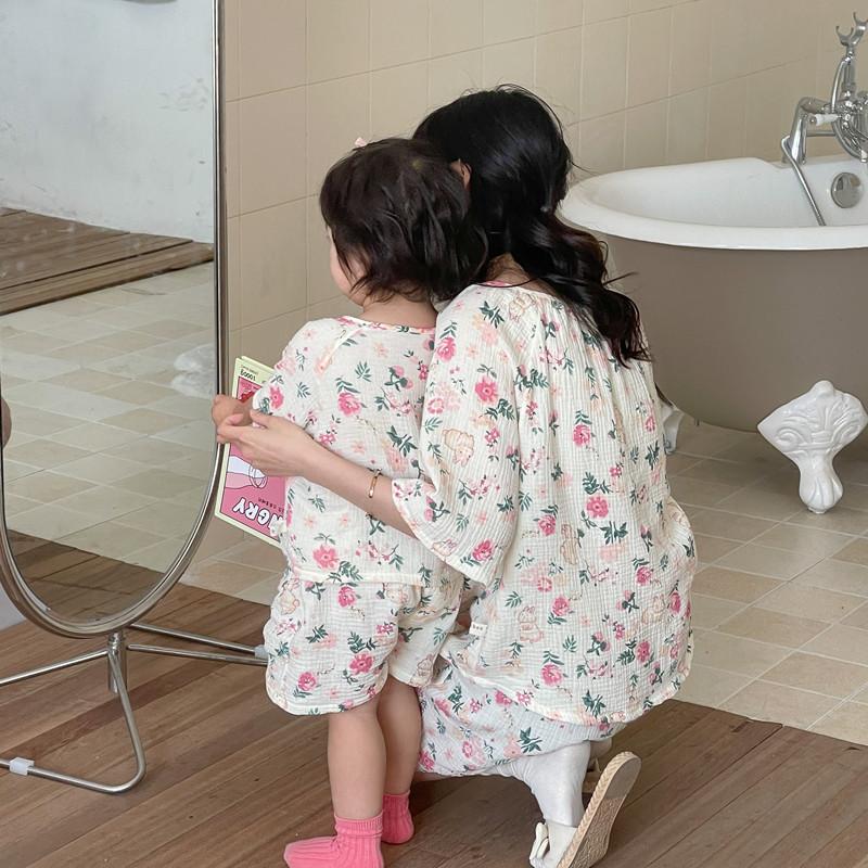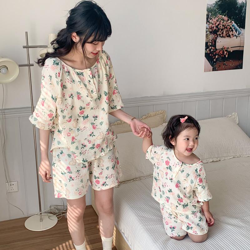 Pijamas Familiares a Juego para Niños, Conjunto de Gasa de Algodón para Estar en Casa, Verano 2024 Pantalones Cortos de Manga Corta, Niños y Niñas, Se Puede Usar Afuera